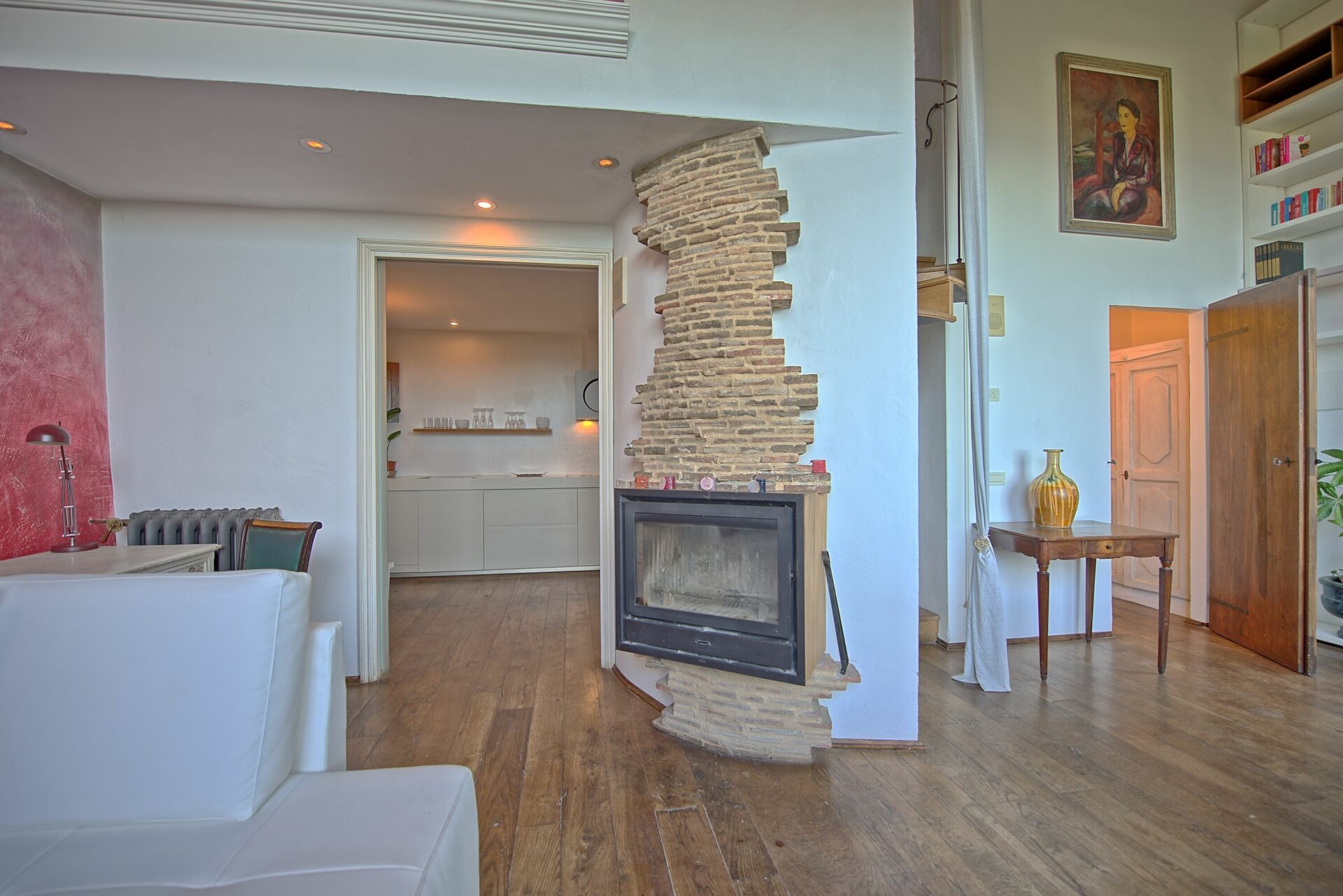 Bottenvåning: ljust vardagsrum med öppen spis och matplats; kök (ugn, frys, diskmaskin, 2 gasbrännare och 2 elektriska brännare); badrum med massagedusch.