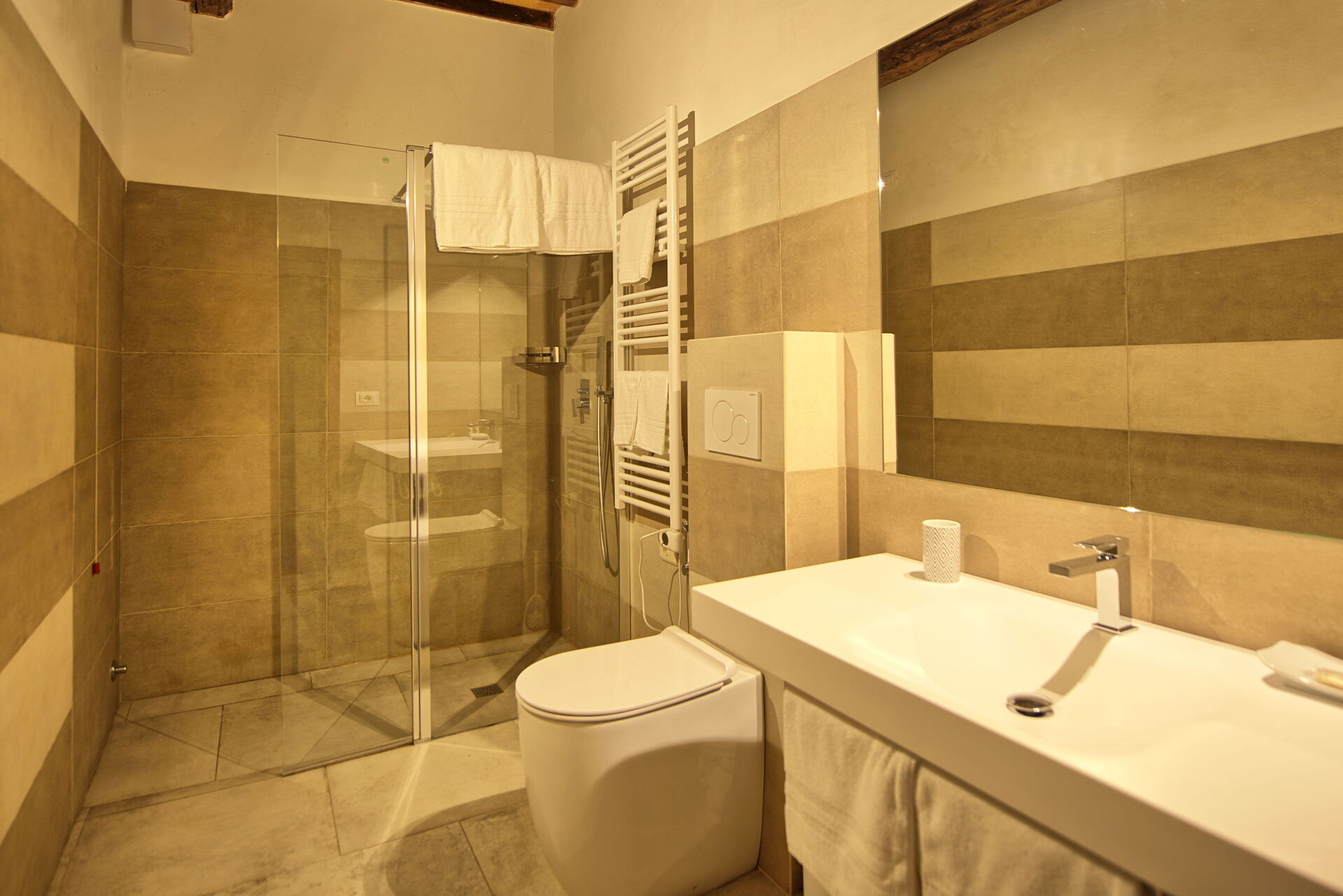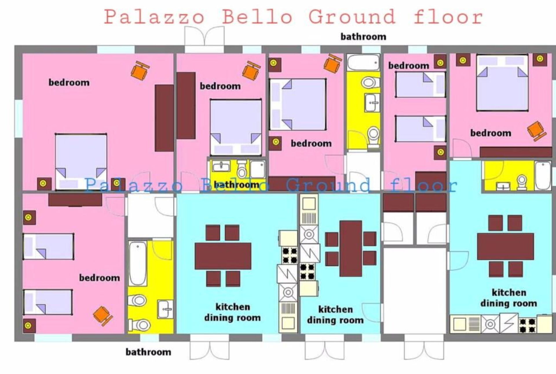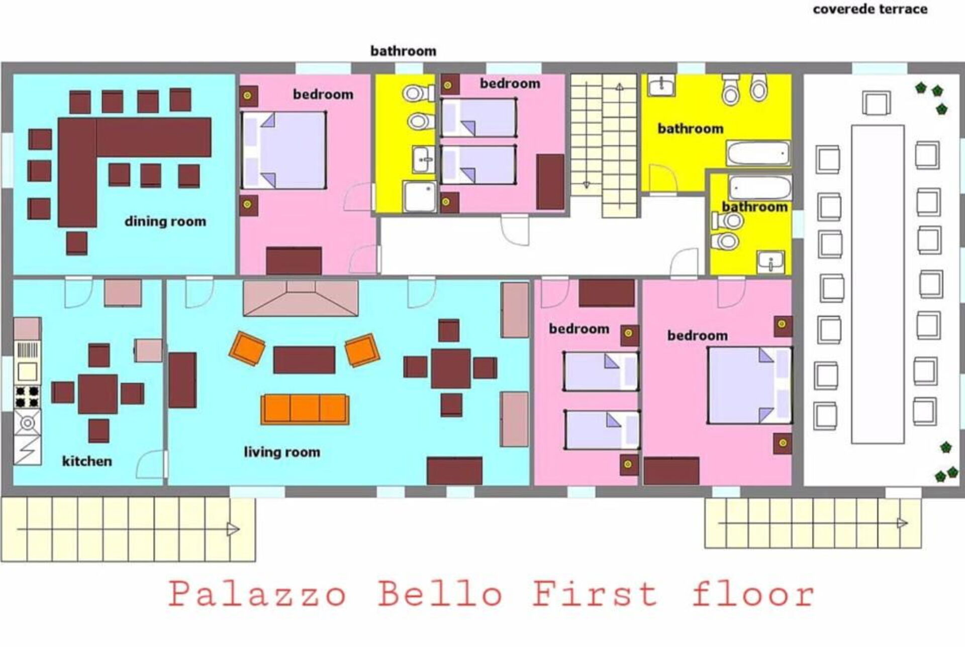 Fastigheten är perfekt för stora grupper som vill tillbringa sin semester tillsammans samtidigt som de har möjlighet till avskildhet: Palazzo Bello är uppdelat i 4 lägenheter och erbjuder totalt 10 sovrum som tillsammans bekvämt kan ta emot upp till 20 personer. På andra våningen finns en stor hall där hela gruppen kan samlas för gemensamma måltider. Det finns också en stor uteservering om man vill stå utanför.