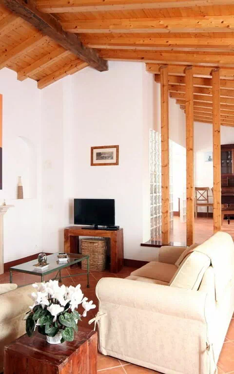 Vardagsrummet är inrett med en bäddsoffa för två personer, en öppen spis och TV. Inredningen är en blandning av moderna och ärvda egenskaper som kontrasterar vackert med trätak och terrakottagolv.