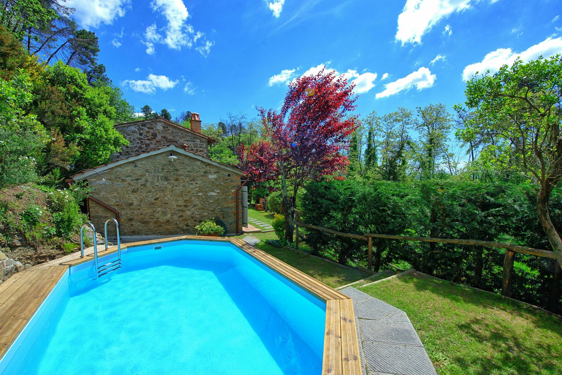 Charmigt stenhus med pool i bergen över Val di Nievole i Toscana. Semesterhuset ligger nära byn Cozzile öster om Lucca