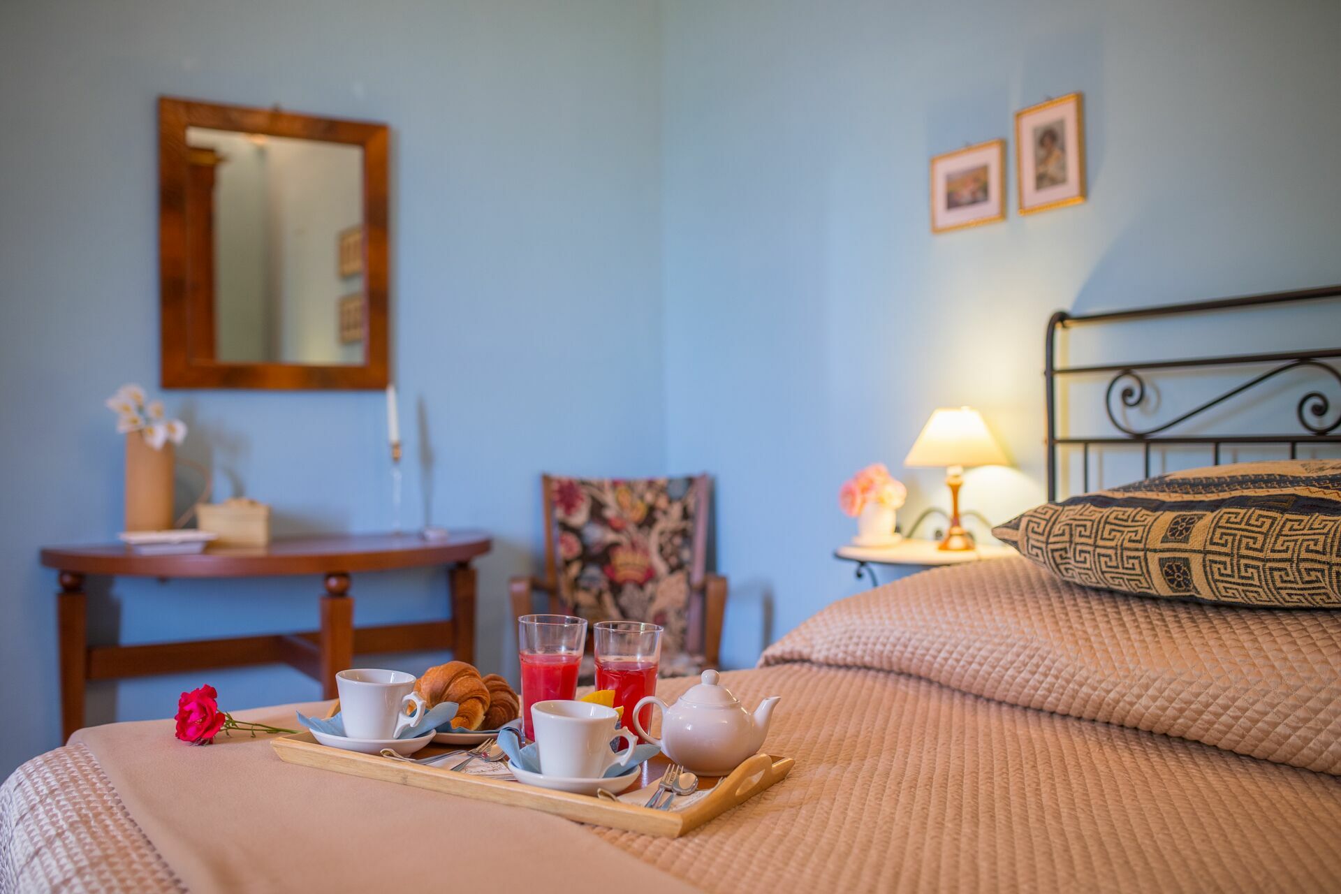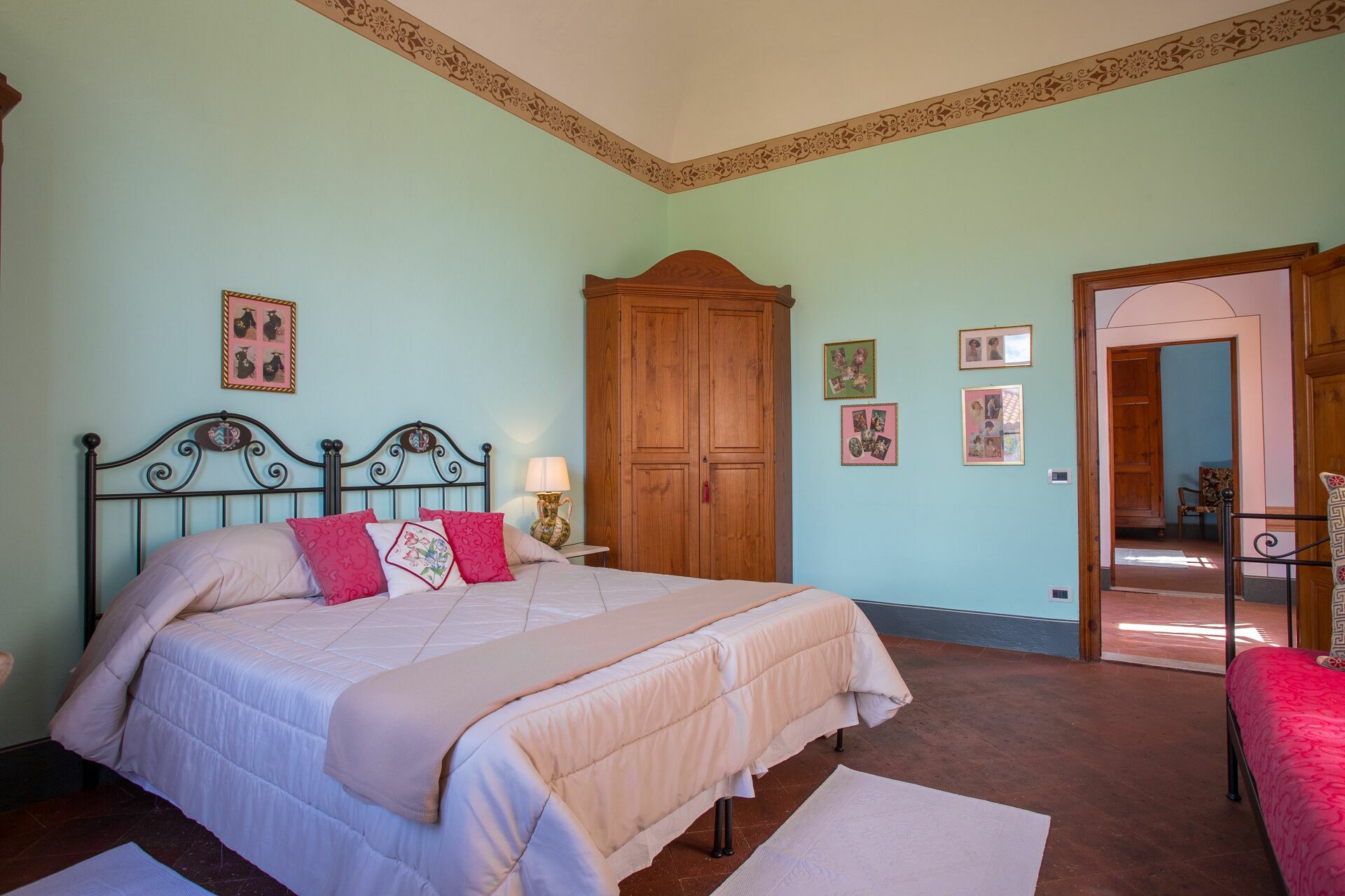 Första våningen: dubbelrum, dubbelsovrum med baldaquin säng, 2 twin-bäddsrum (som kan omvandlas till dubbelrum på begäran), badrum med dusch, badrum med dusch och badkar.