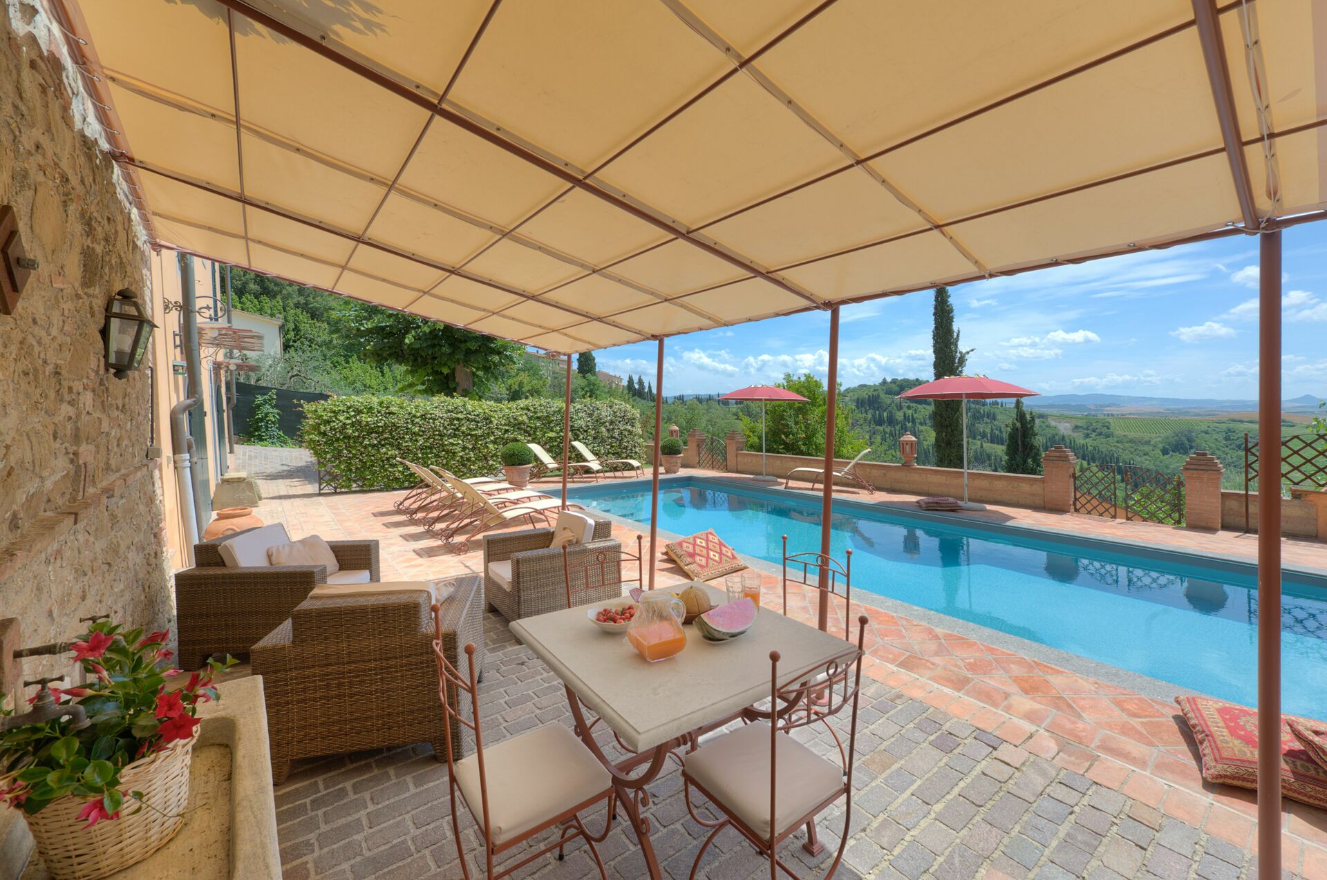 Villan har en charmig terrass med panoramautsikt (nås från köket) med bord och stolar för al-fresco måltider. På en lägre nivå finns en vacker privat pool med utsikt över dalen.