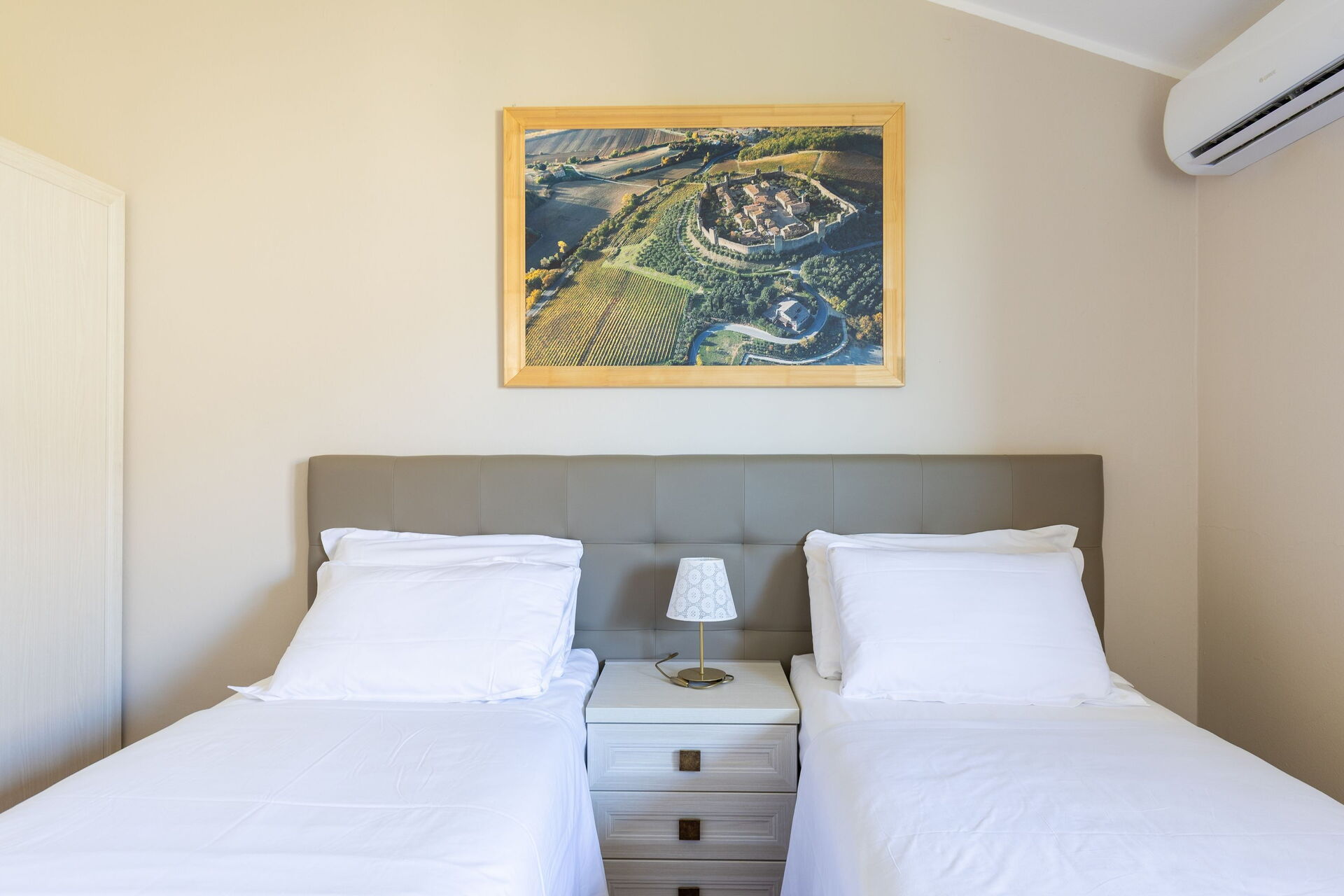 Första våningen: dubbelrum (luftkonditionering); sovrum med 2 enkelsängar (luftkonditionering, sängar kan sättas ihop på begäran); badrum med dusch.