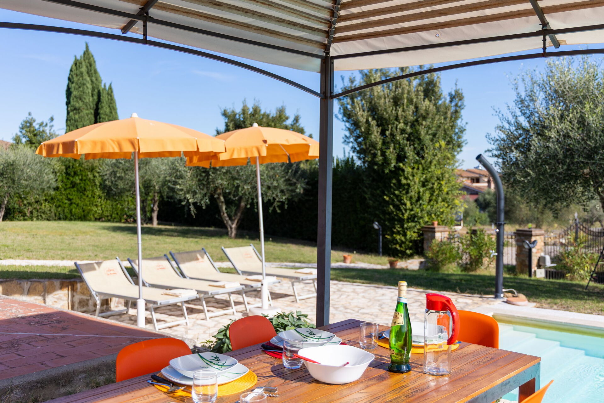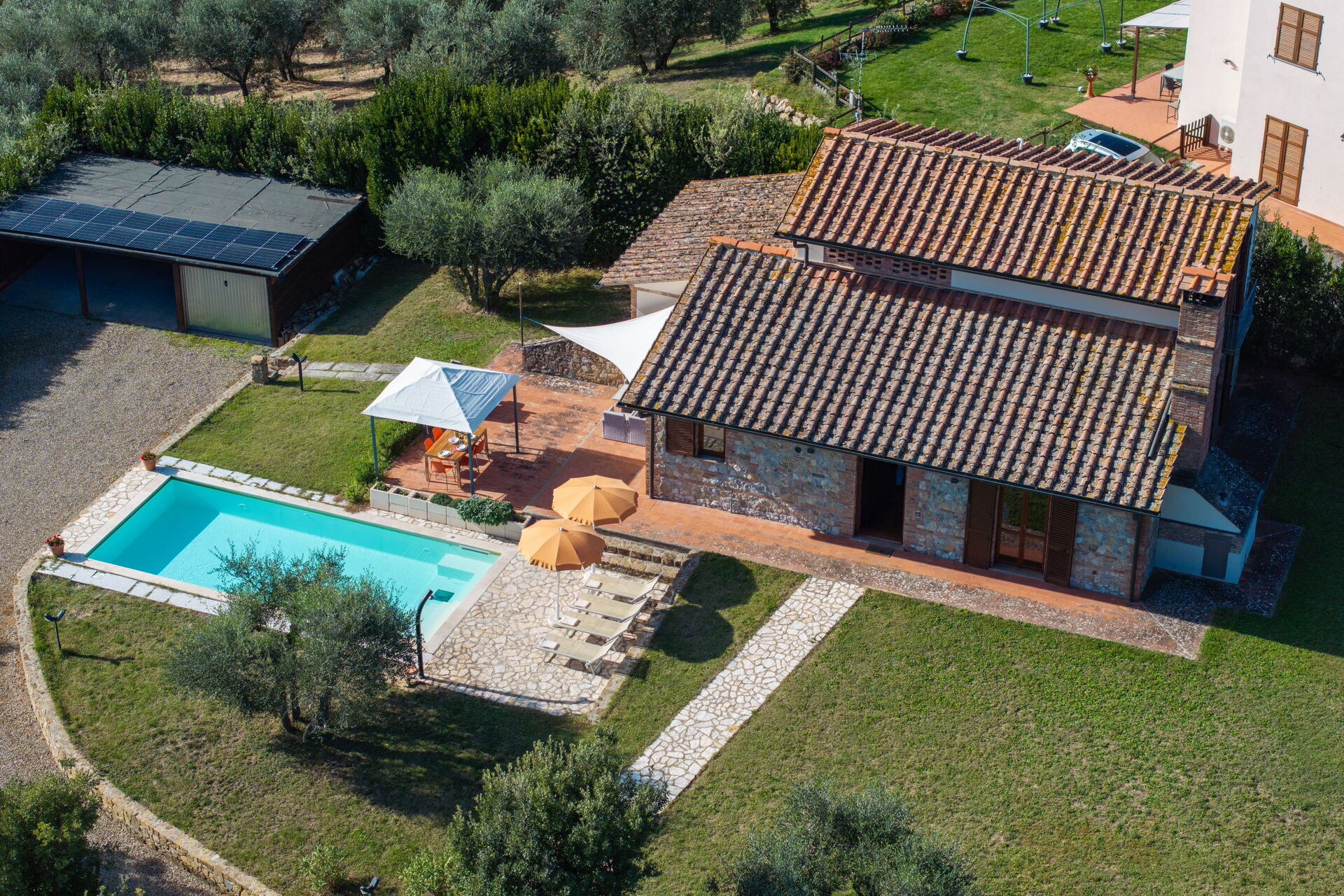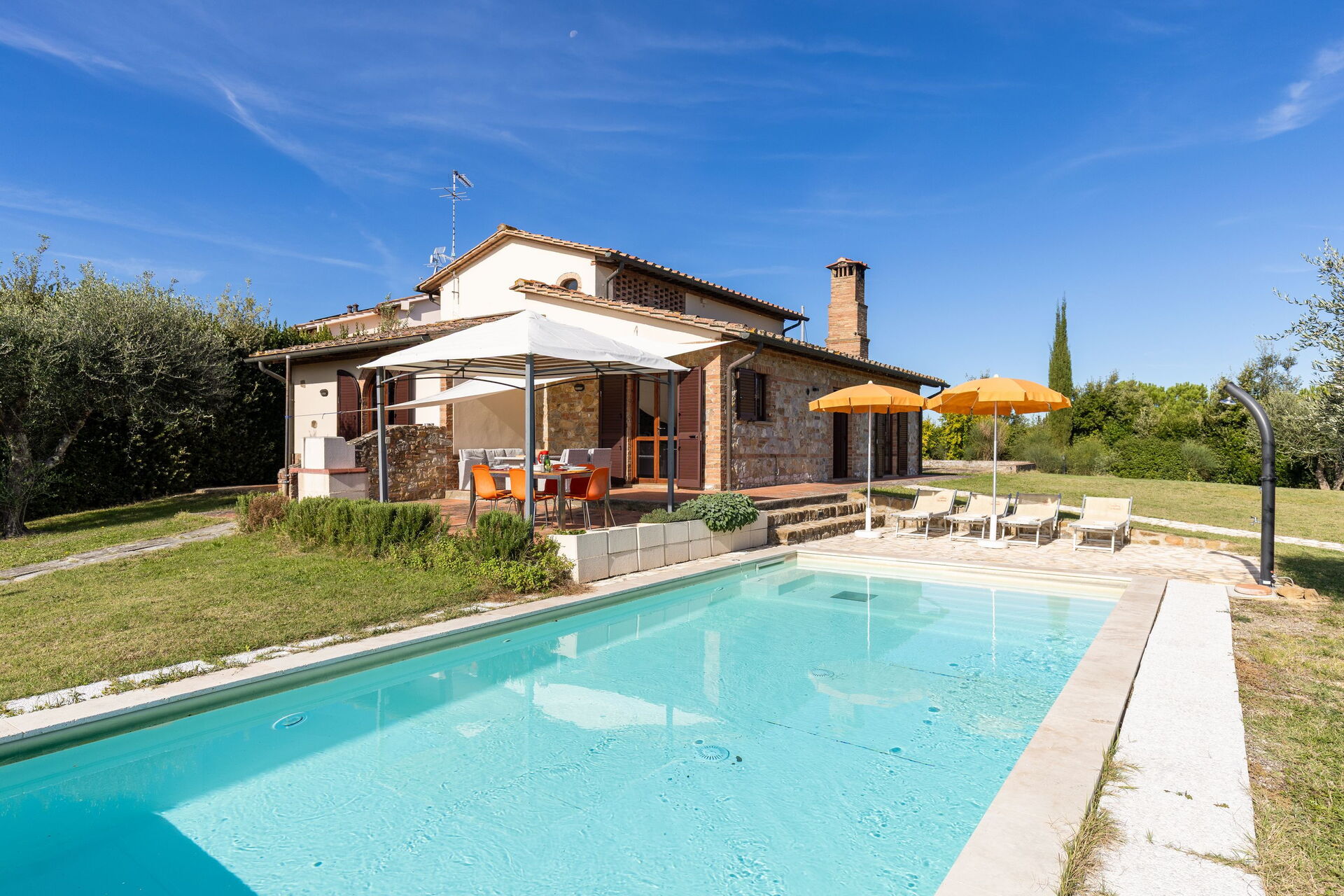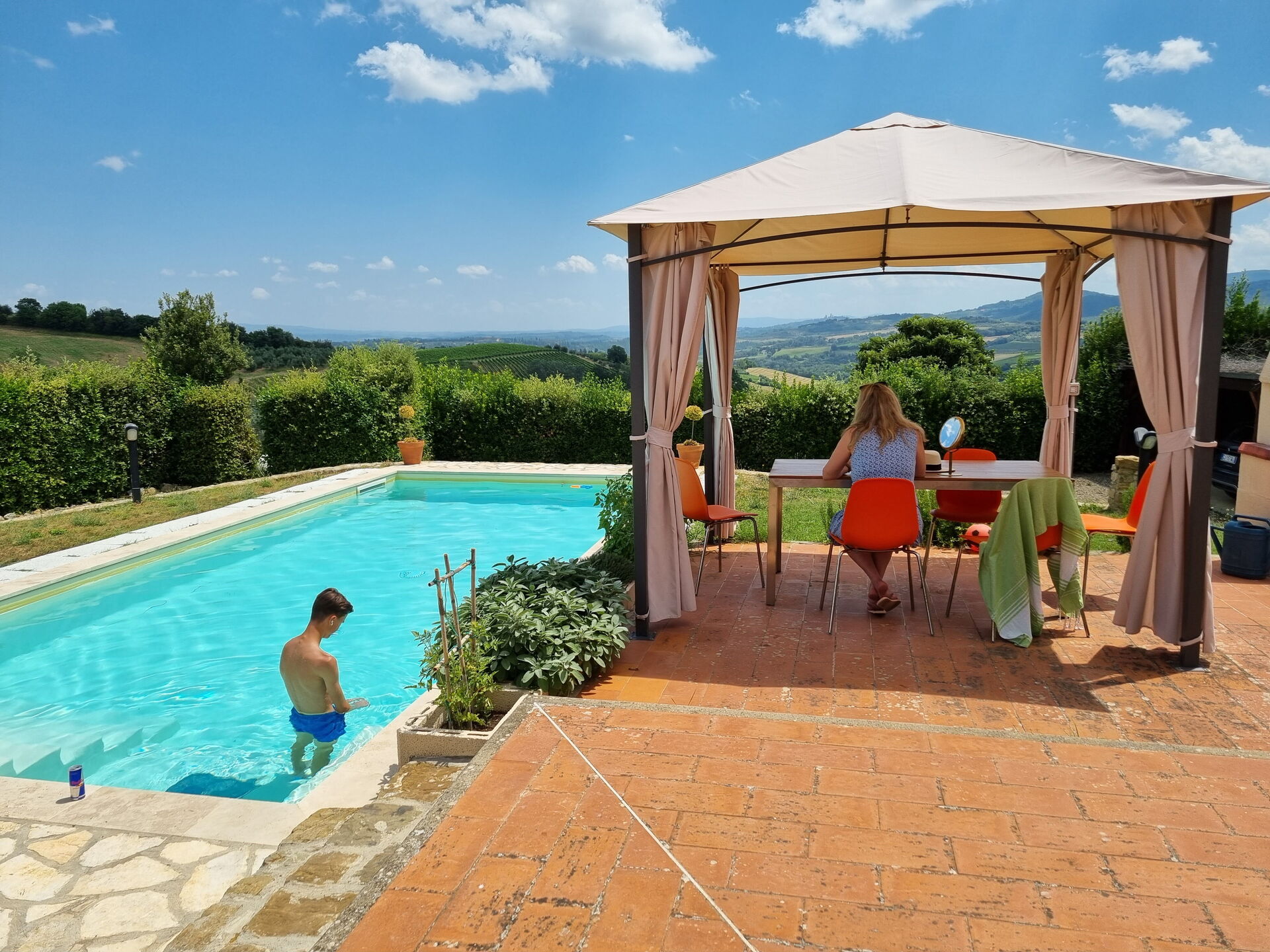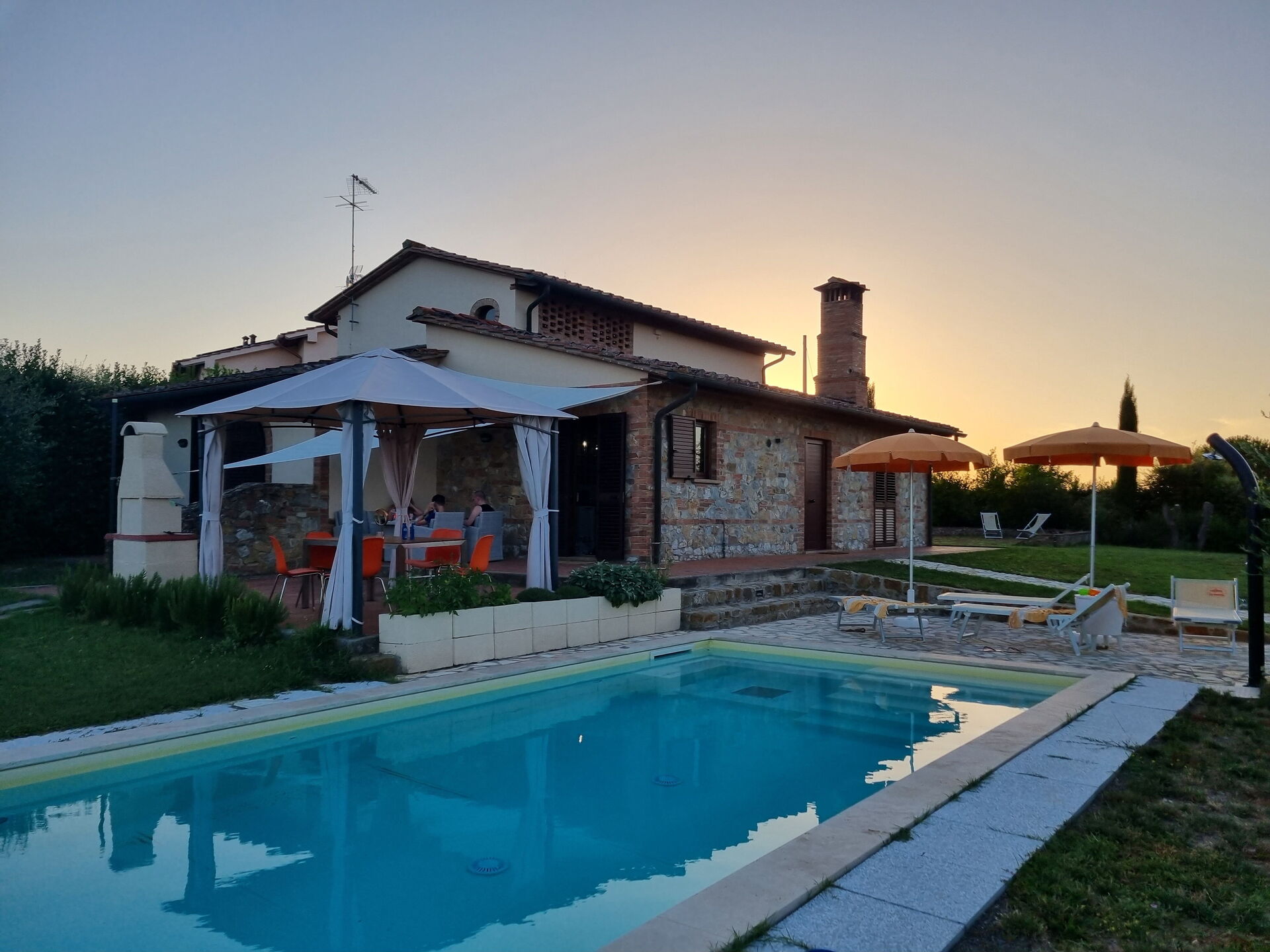 På uteplatsen kan gästerna njuta av en trädgård och en helt ny pool (med romerska trappor och en relaxavdelning med en gejser). Från semesterhuset har du utsikt över det vackra omgivande landskapet och dom berömda tornen i den medeltida staden San Gimignano. Nära köket, mellan huset och poolen, finns ett område möblerat med lusthus, bord, stolar och grill.