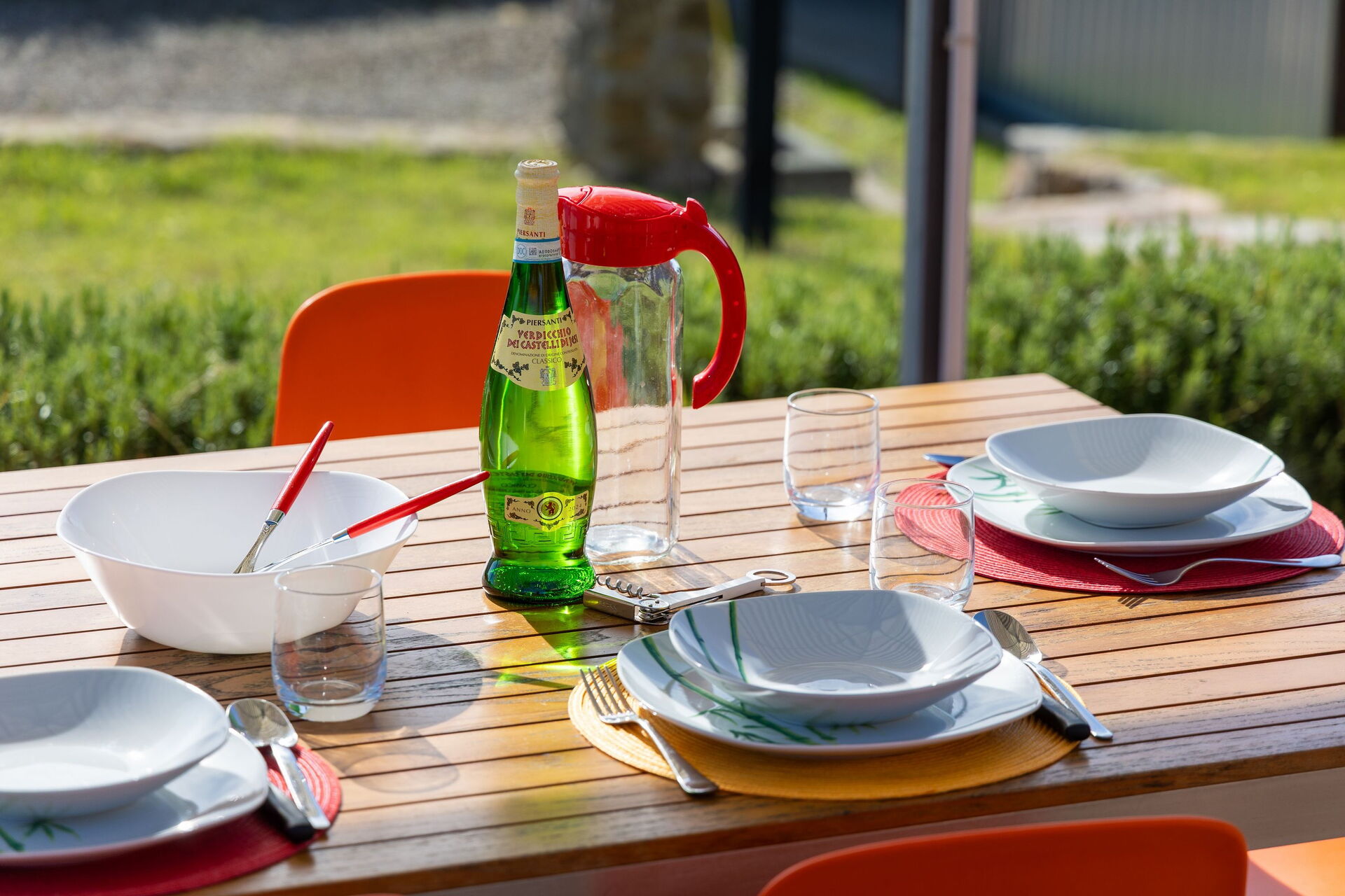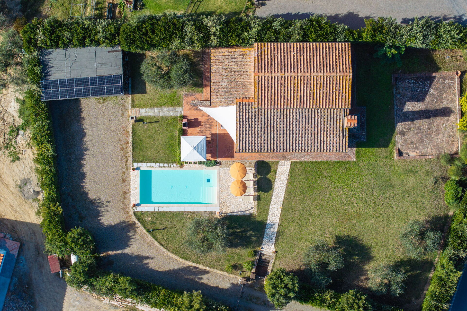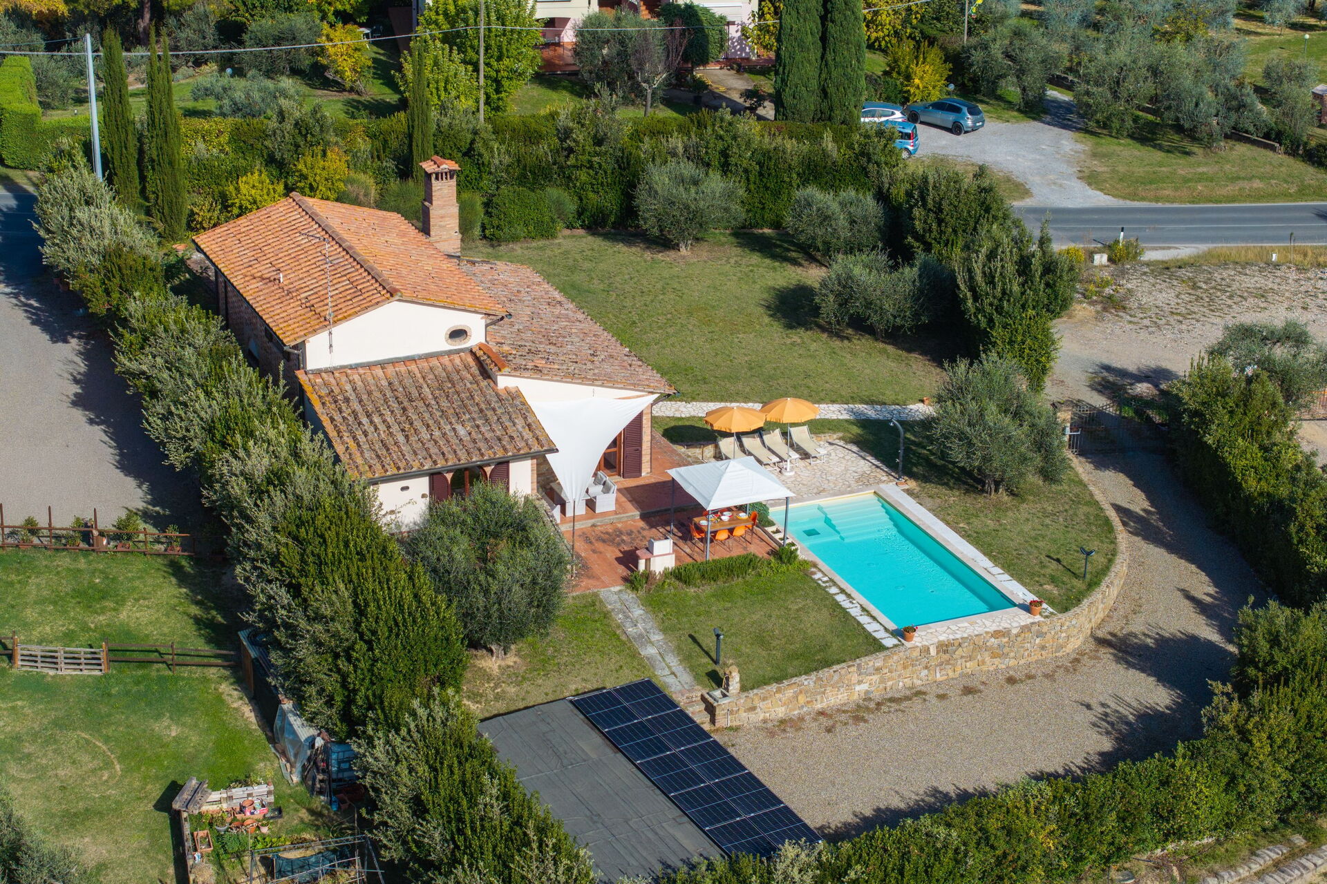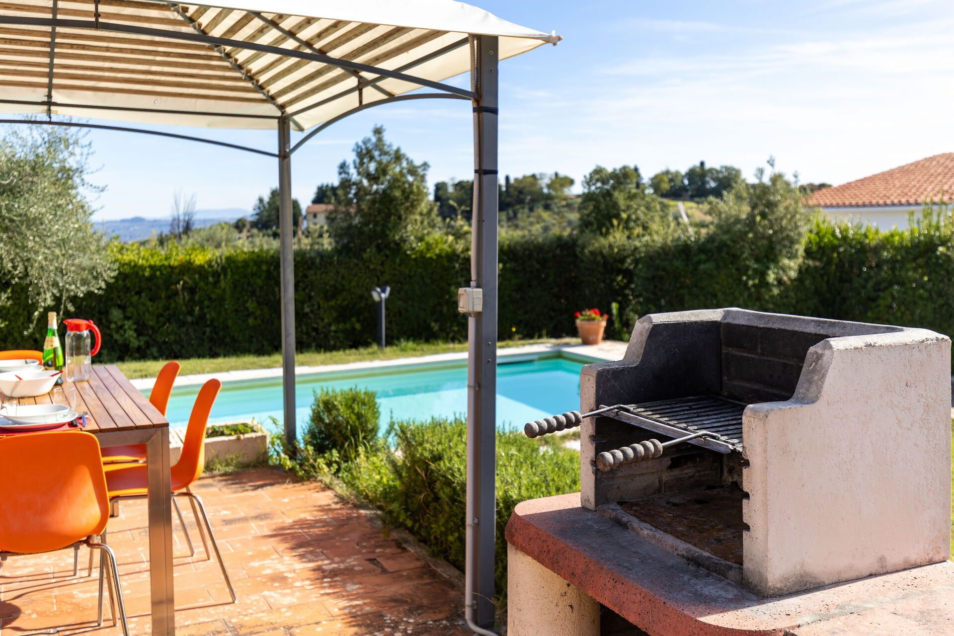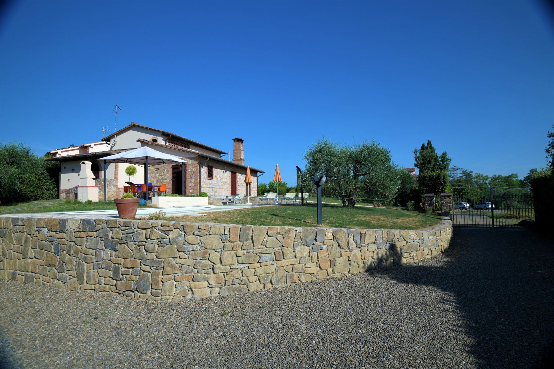 På uteplatsen kan gästerna njuta av en trädgård och en helt ny pool (med romerska trappor och en relaxavdelning med en gejser). Från semesterhuset har du utsikt över det vackra omgivande landskapet och dom berömda tornen i den medeltida staden San Gimignano. Nära köket, mellan huset och poolen, finns ett område möblerat med lusthus, bord, stolar och grill.