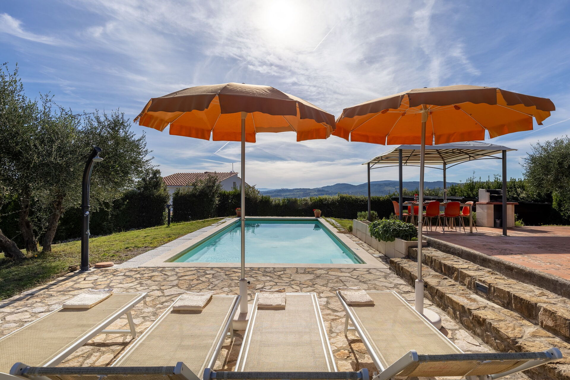 We had a lovely week in this very comfortable villa. The owners are friendly and very helpful with any issues. Everything you need is in the villa and the owners give a very thorough tour and explanation of how things work. The area is great for exploring Tuscany with lovely towns and reataurants nearby. The only negative is the villa is close to a very busy road that can be noisy while you are lying by the pool. The views more than make up for it though.