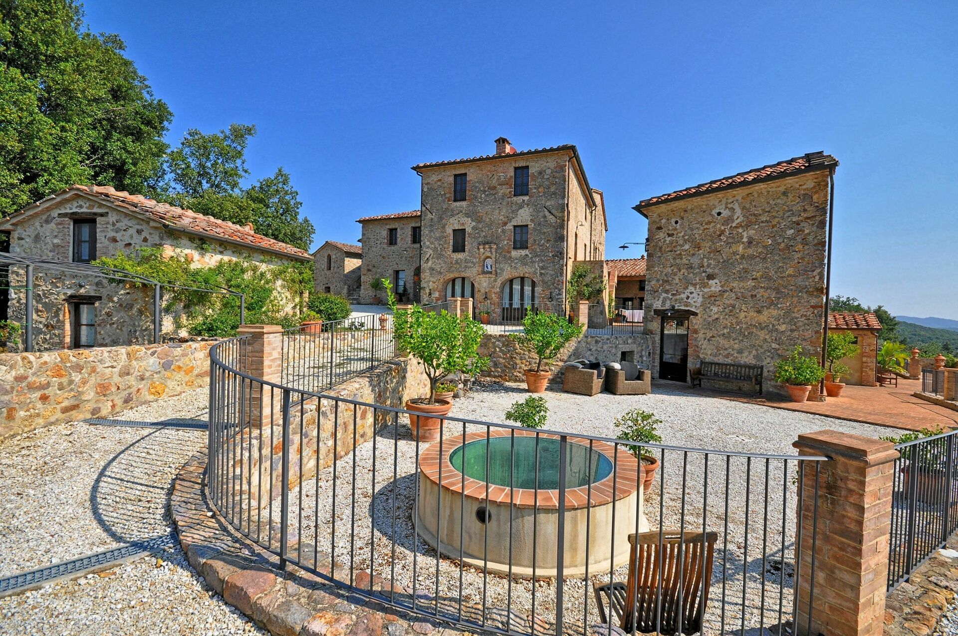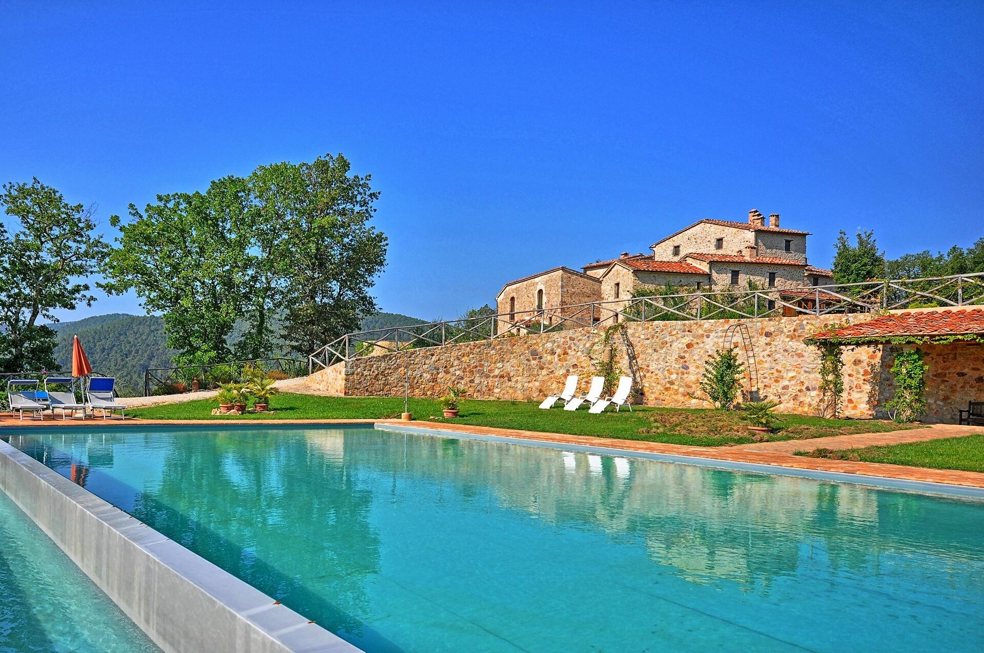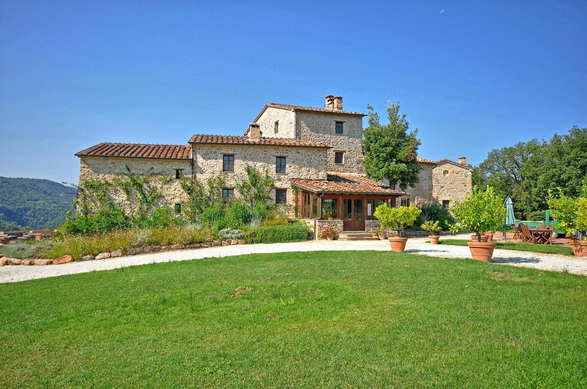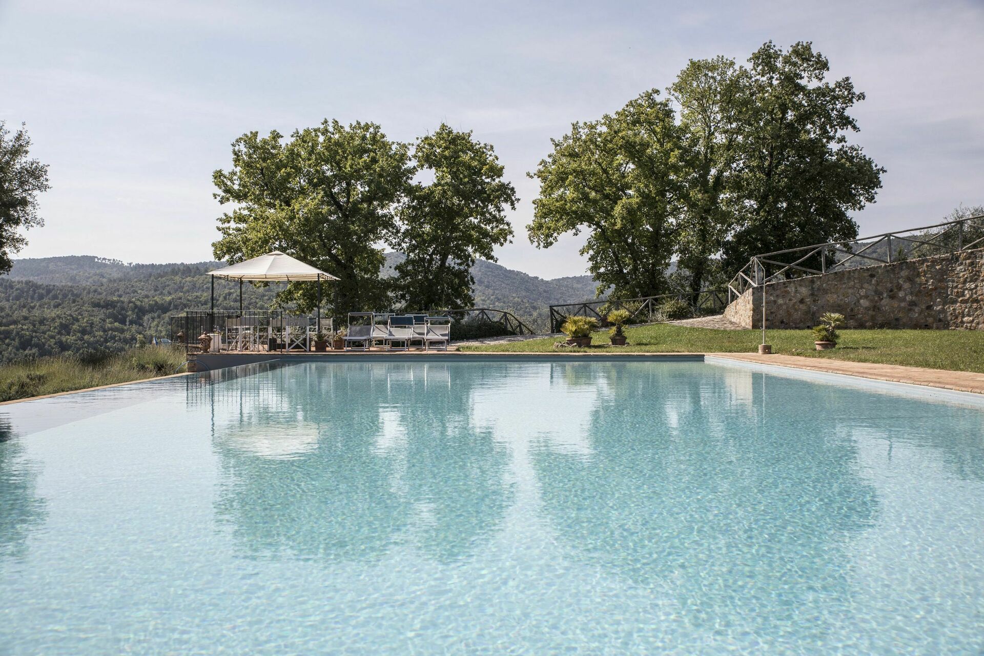 Vacker och rymlig villa med privat pool et lugnt läge på en kulle söder om Siena i Toscana med fantastisk utsikt över "Basso Merse" Naturreservat och Mount Amiata i fjärran. Huset är omsorgsfullt renoverat och förvandlat till en raffinerad strålande hus på landet med alla bekvämligheter. Interiören är elegant och villan är smakfullt inredd med en trevlig kombination av tradition och lyx. Semesterhusetär omgiven av en stor, välskött trädgård dekorerad med en mängd olika växter och rosor. Utanför kan gästerna också njuta användningen av en vacker privat pool i panoramaläge, en stor terrass och ett täckt område med vidsträckt utsikt över det omgivande landskapet.