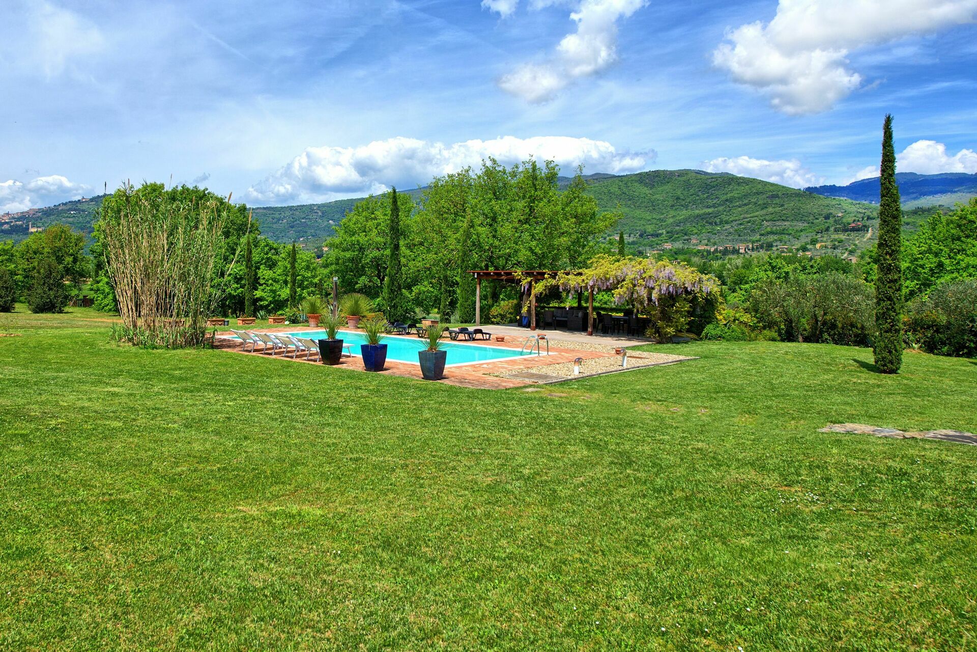 Lyxvilla att hyra nära den vackra staden Cortona i Toscana. Semesterhuset har en privat pool och härlig panoramautsikt till dom omgivande kullar och Cortona.