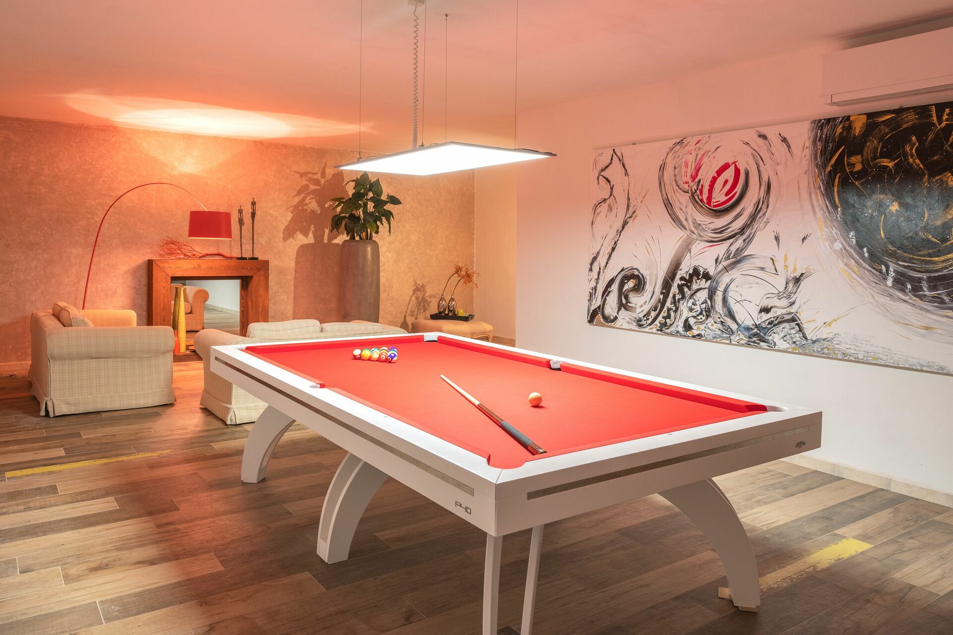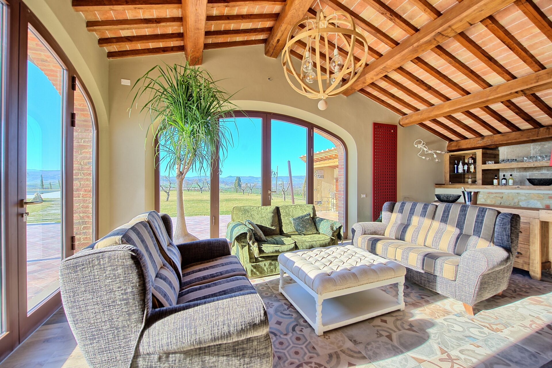 Villan har en exklusiv inredning med moderna och förfinade möbler. På utomhusområdet finns det många platser för nöje och underhållning, till exempel den stora poolen med solterrass, och den vackra grillplatsen med vedspis, brazier (utomhus spis) och stora grönområden.
