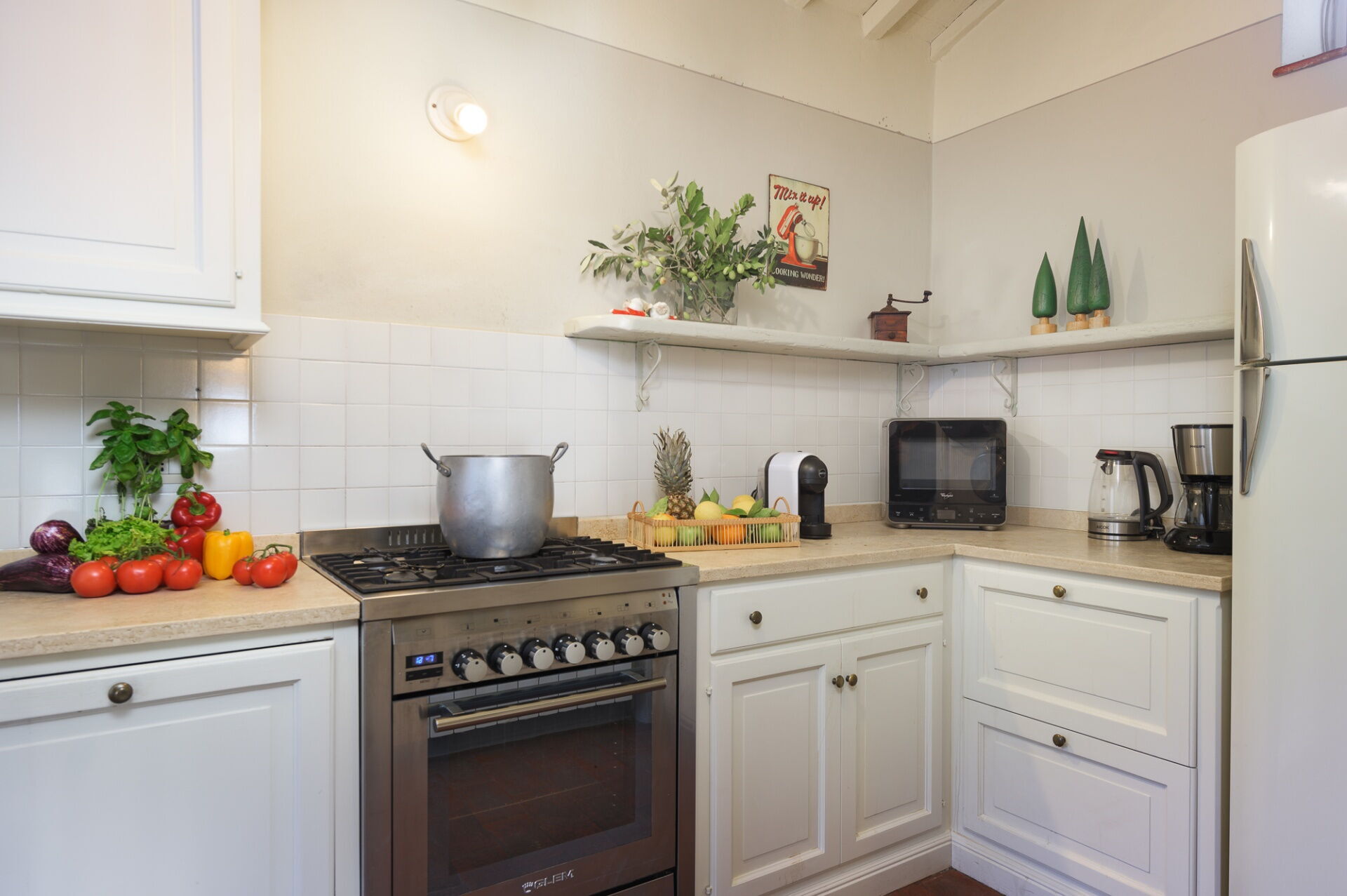 4 trappsteg upp: (spis, ugn, kylskåp, frys, diskmaskin, brödrost, amerikansk kaffebryggare).