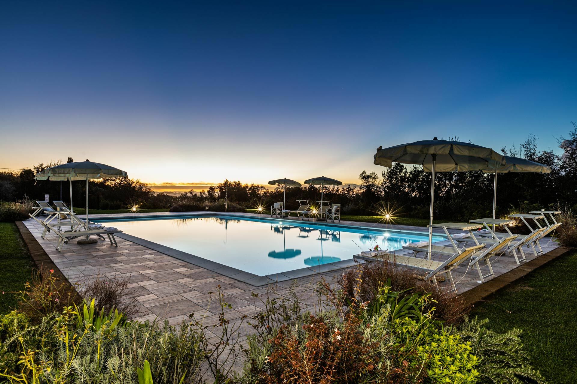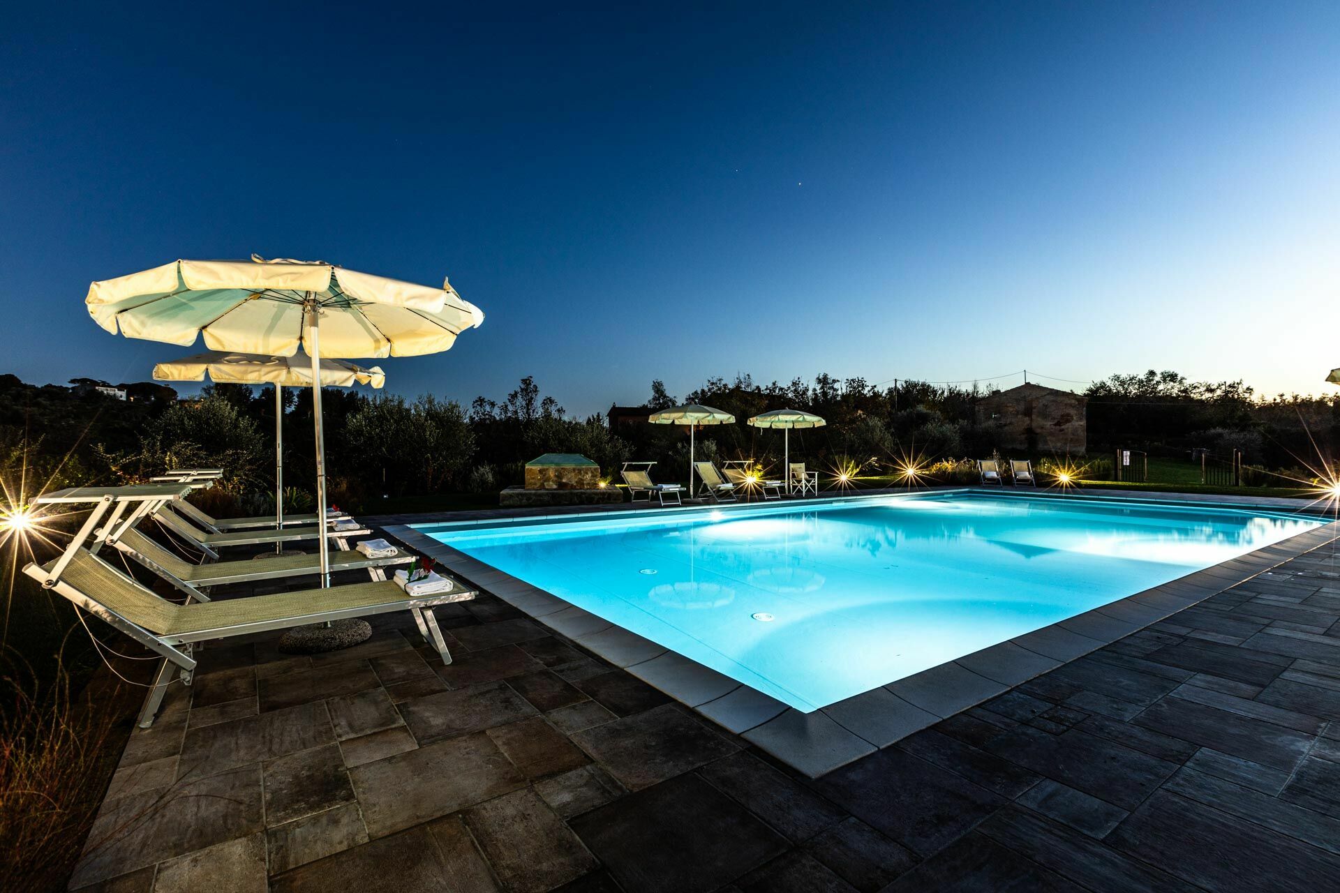 Poolen ligger cirka 100 meter från huset, med vacker utsikt över bergen och staden Montefoscoli.