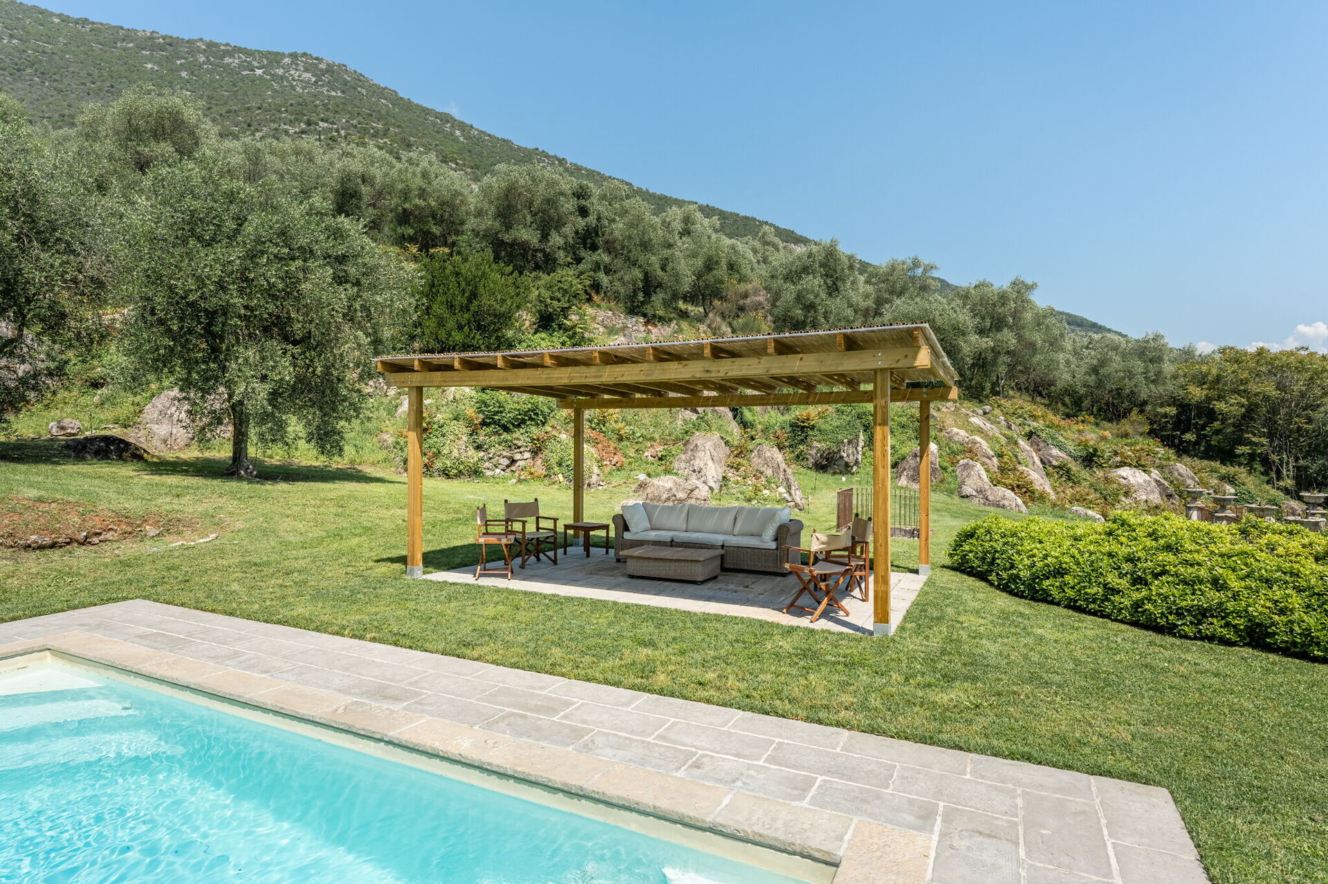 Fastigheten är omgiven av gröna kullar, berg och en privat trädgård som är vackert underhållen och planterad med olivträd.