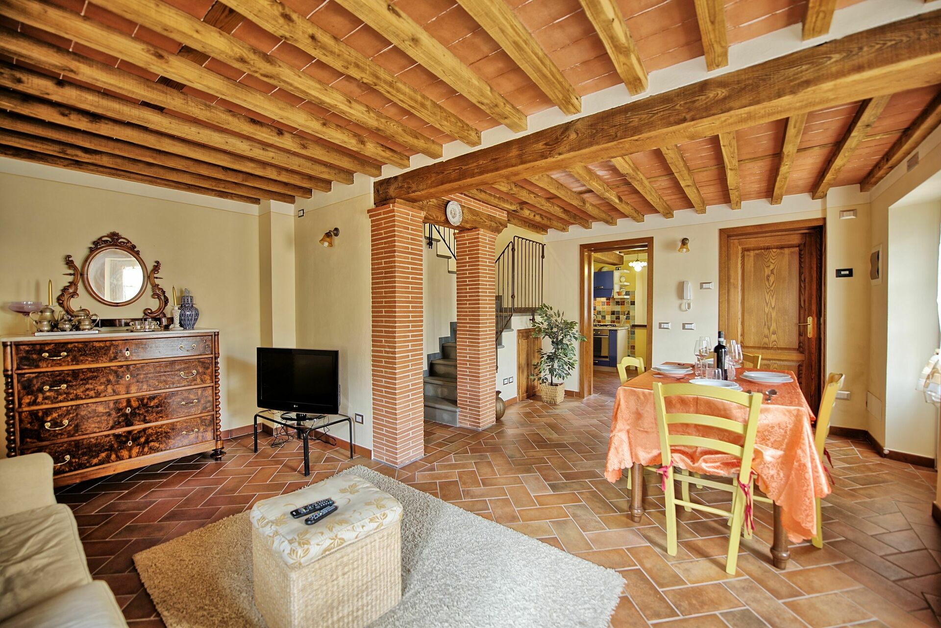 Die Wohnung hat in der ersten Etage ein Wohn-/Esszimmer, eine sehr gut ausgestattete Küche mit einem Gasherd, einem großen Kühlschrank, einr Spülmaschine und dem notwendigen Gechirr. Neben der Küche befindet sich ein kleines, modernes Badezimmer mit Dusche und Bidet. In der oberen Etage sind zwei Schlafzimmer und ein Badezimmer.
