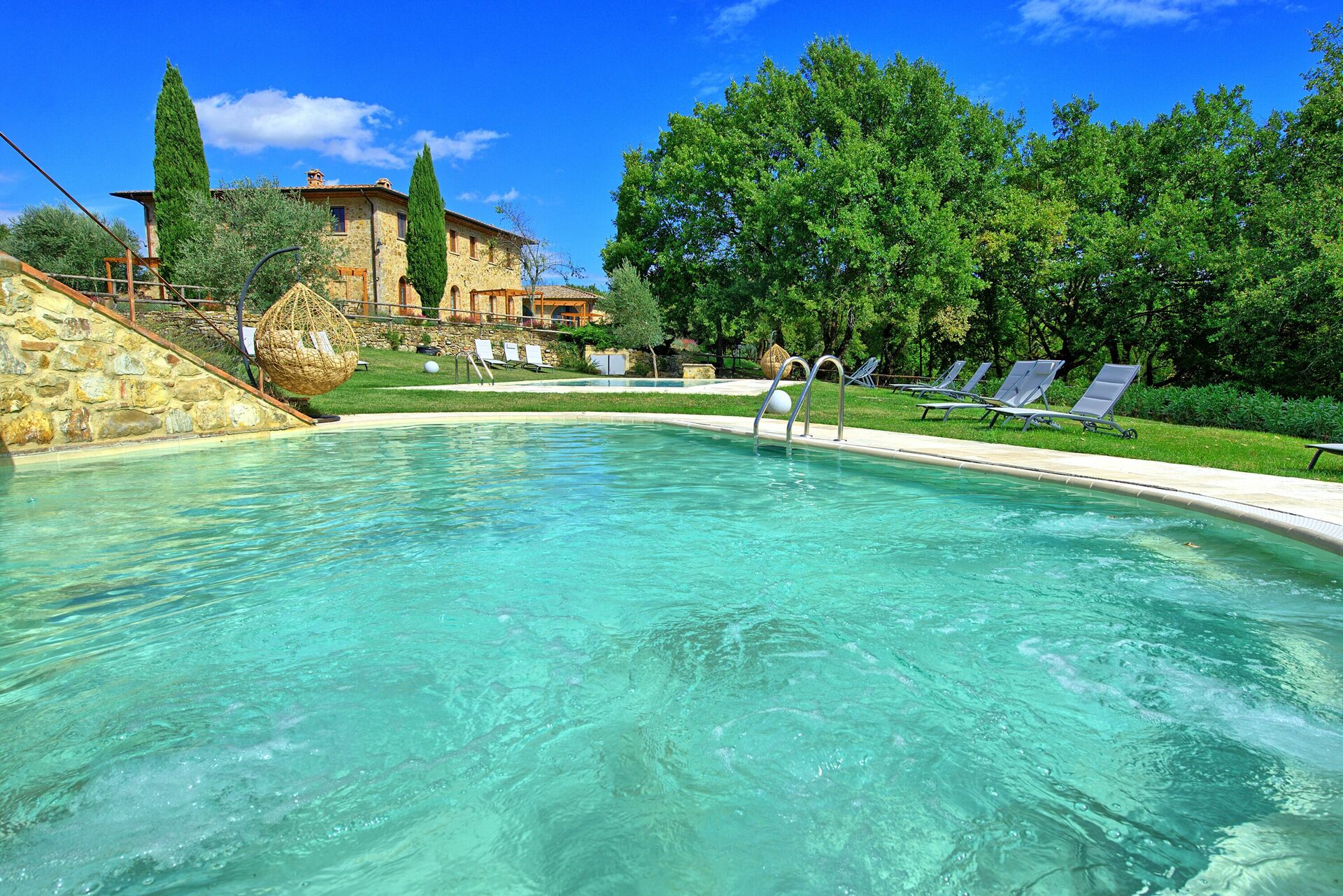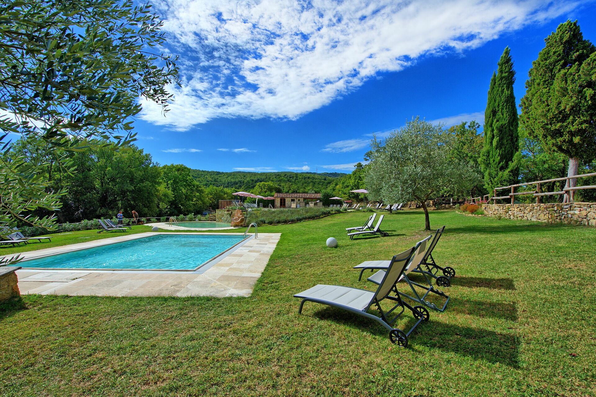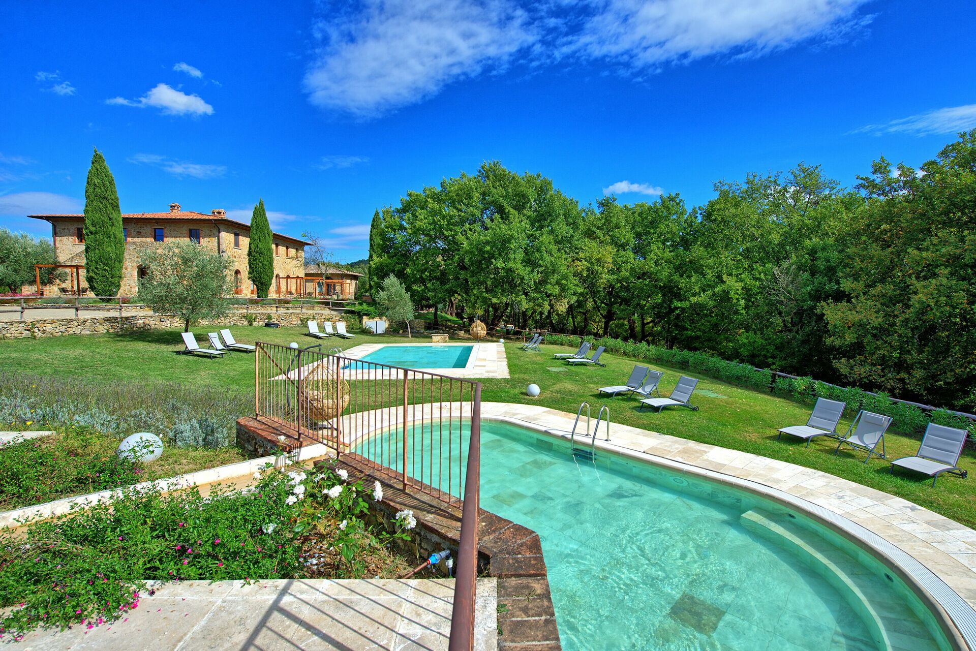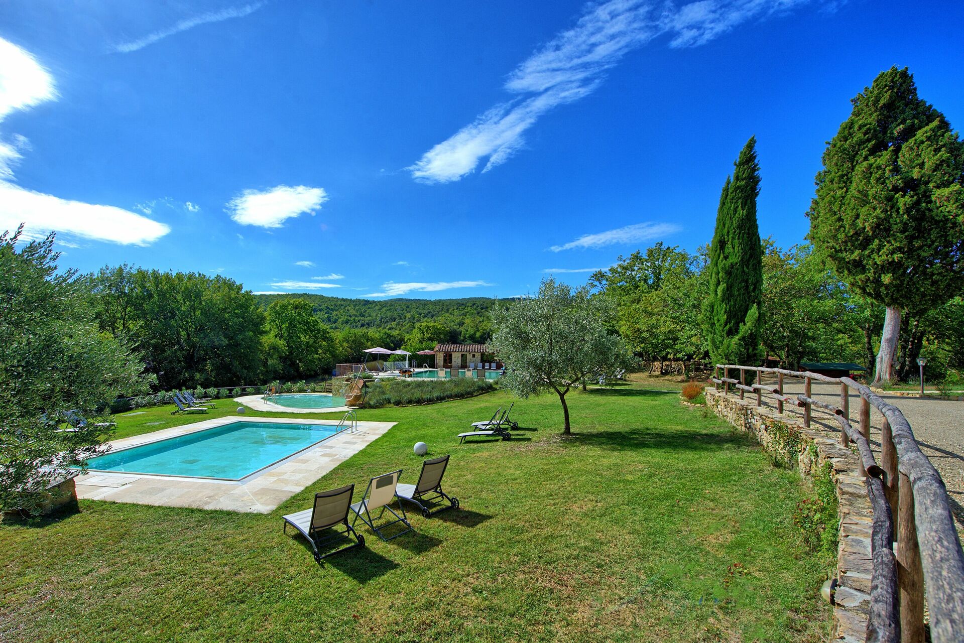 Semesterbostaden har en stor trädgård och tre pooler, en större för simning, en mindre för barn och en annan med hydromassagestrålar där du kan koppla av med en vacker utsikt över landskapet.