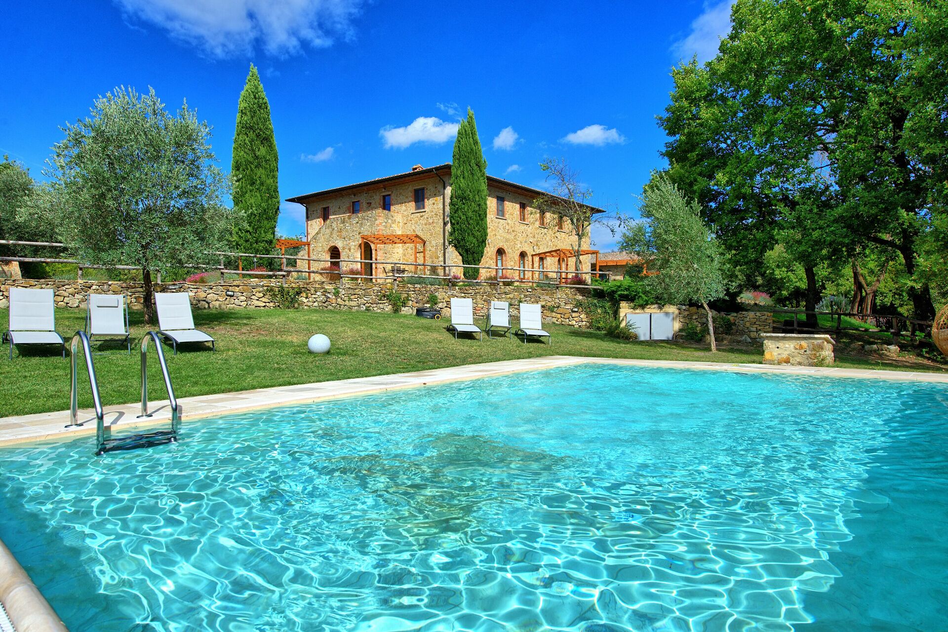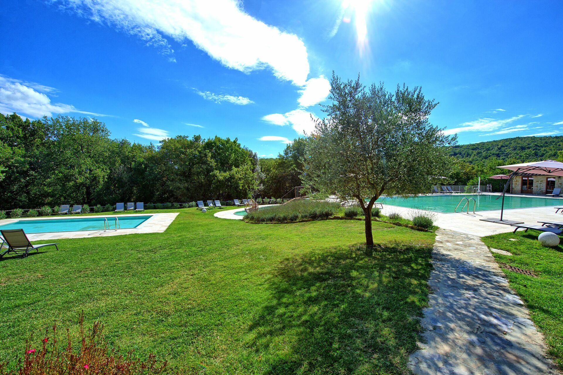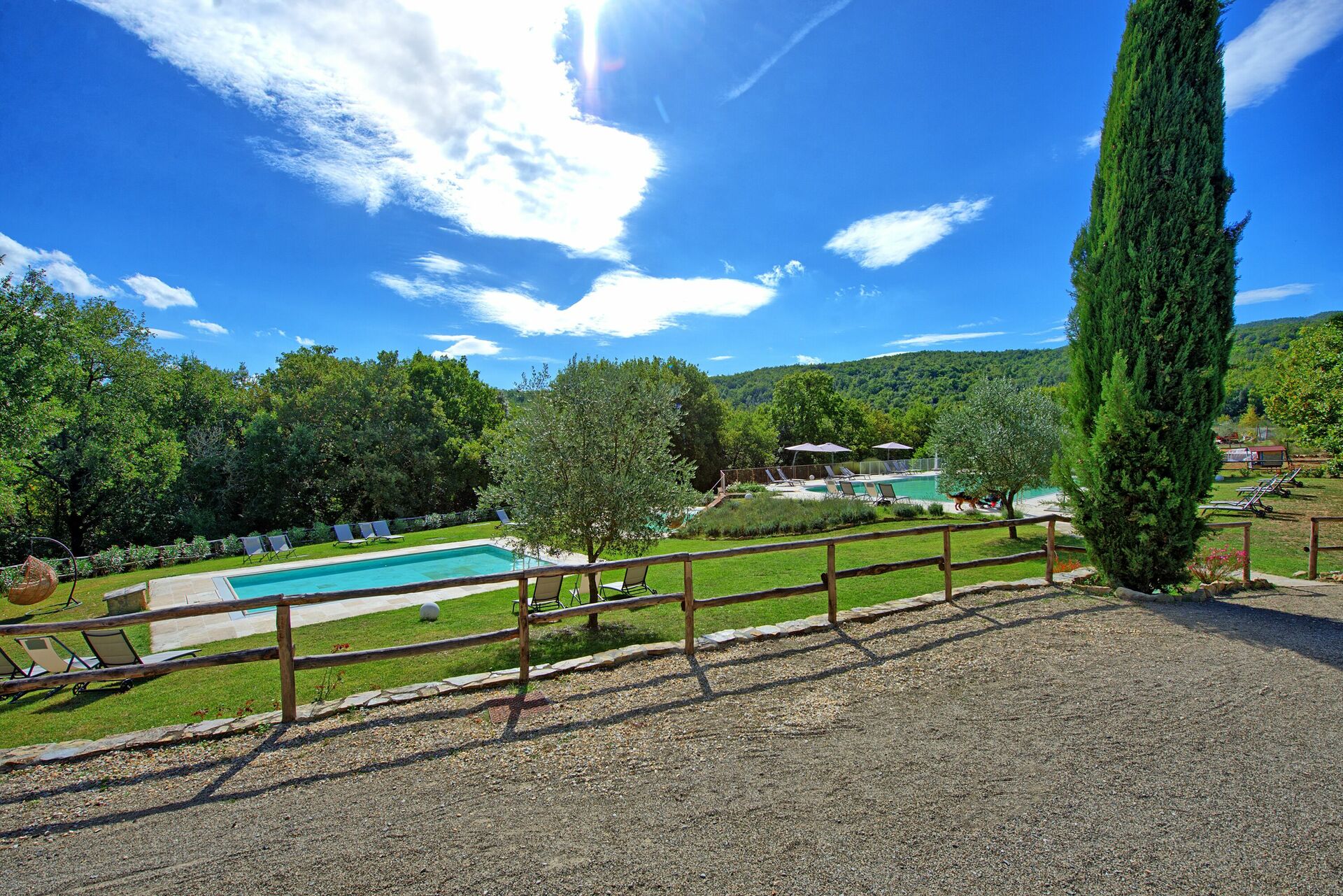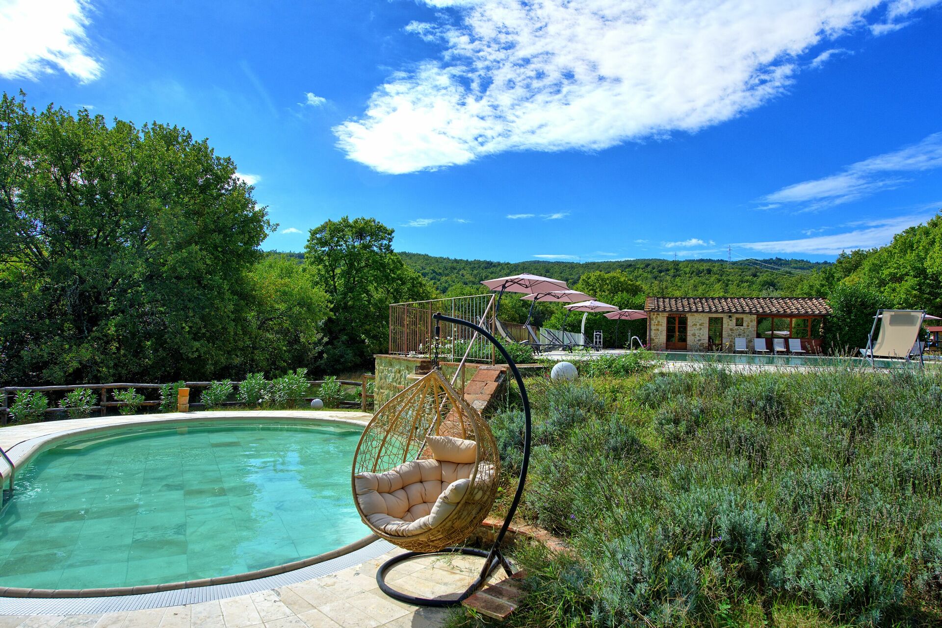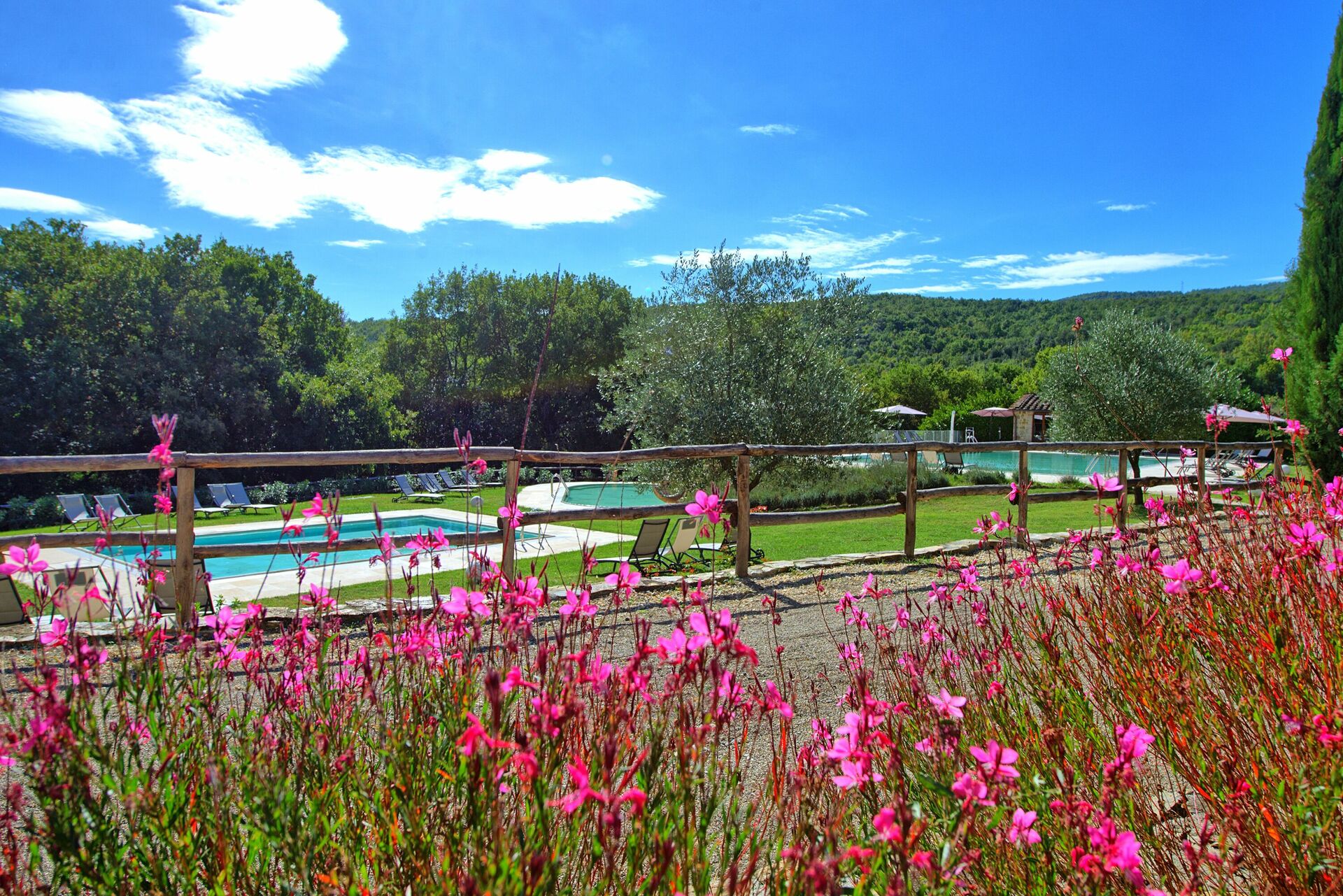 Semesterbostaden har en stor trädgård och tre pooler, en större för simning, en mindre för barn och en annan med hydromassagestrålar där du kan koppla av med en vacker utsikt över landskapet.