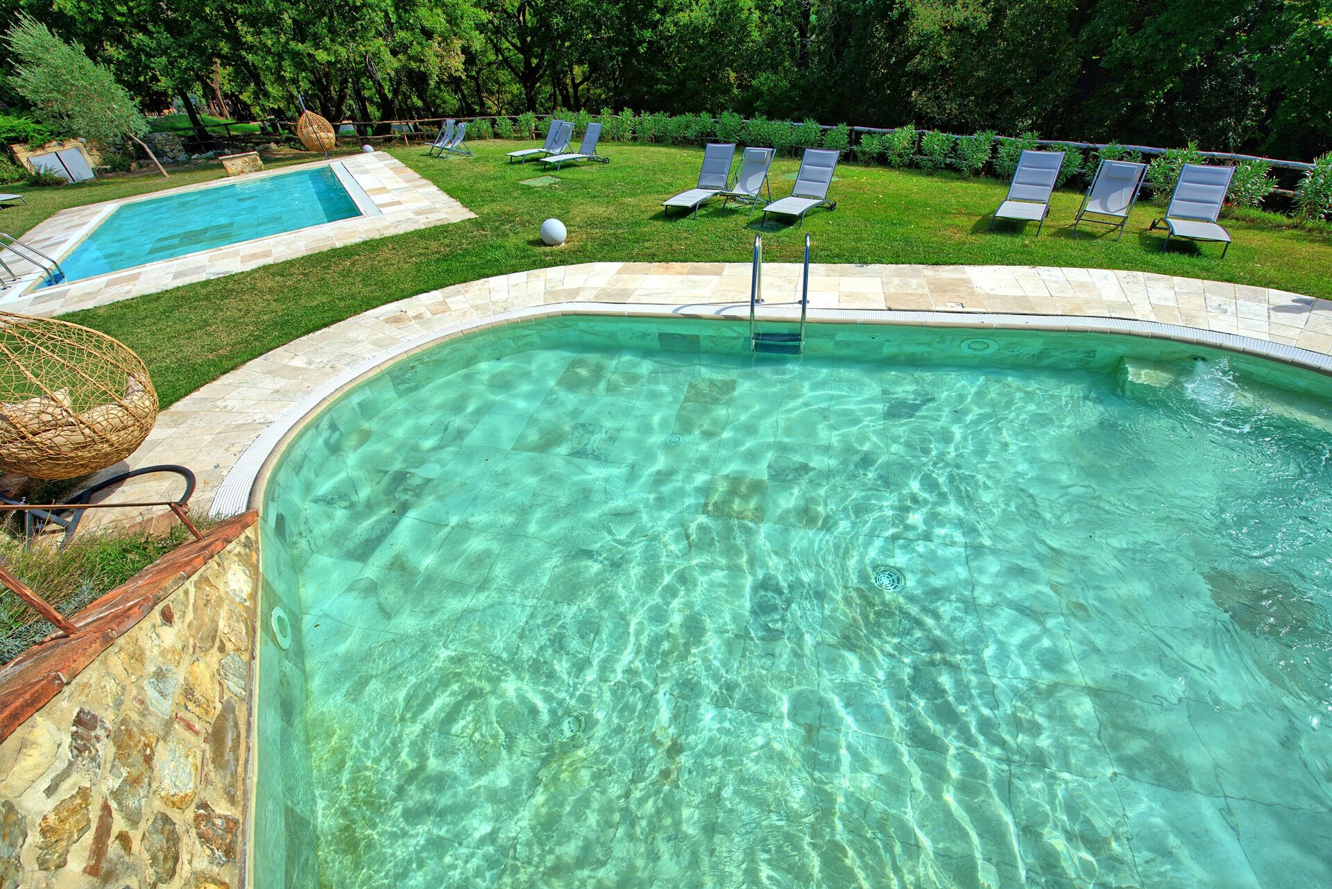 - tre pooler: varav en är mycket stor (20 x 10 m - maximalt djup 1,4 m), en mindre (10 x 5 m - högsta djup 1 m) och en annan mindre med ett hörn som har en hydromassage (8 x 5 m - maximalt djup 1 m)