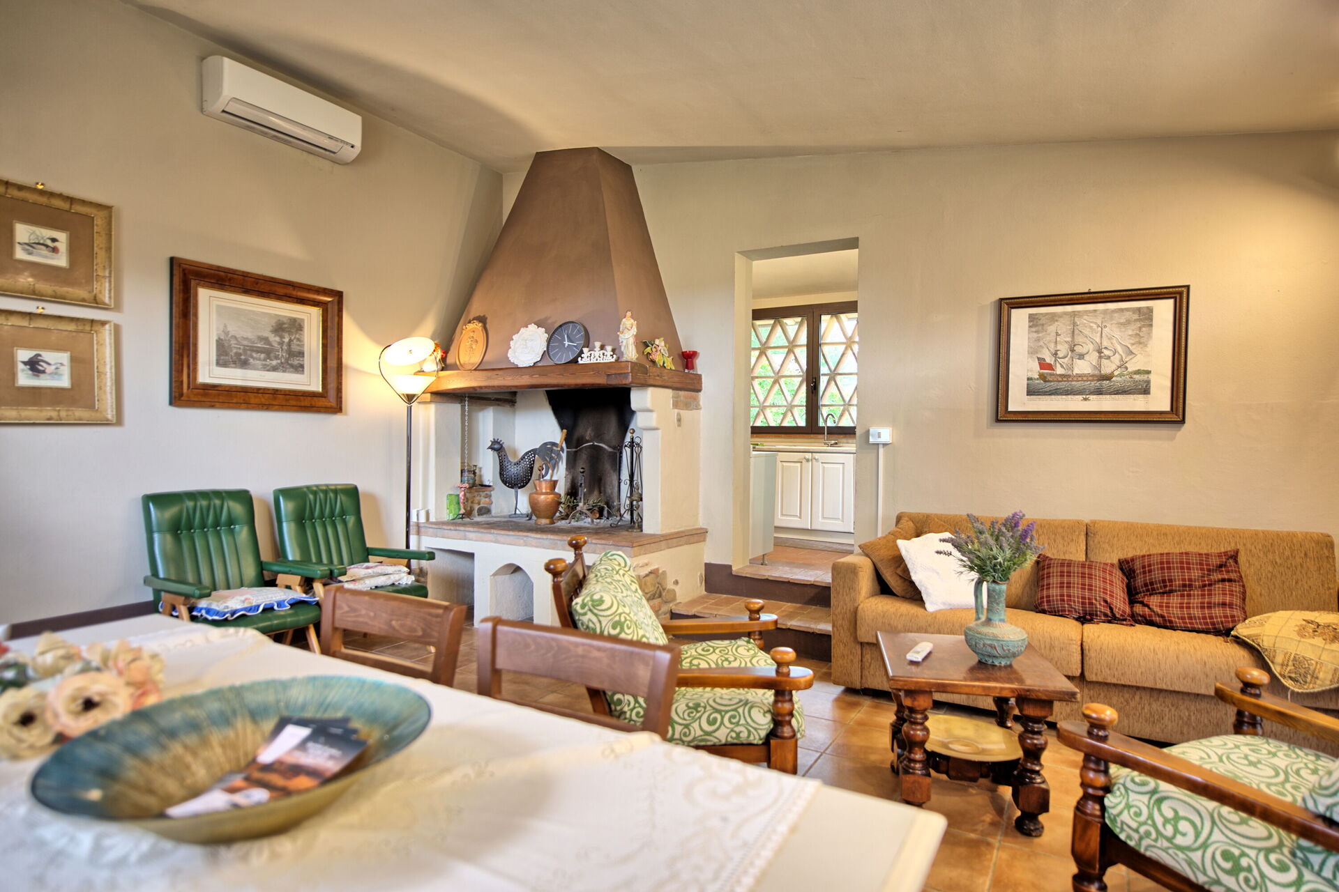 2 trappsteg ner (från köket eller från dubbelrummet): vardagsrum (luftkonditionering, TV) med soffor, öppen spis, matplats och utgång till utsidan.