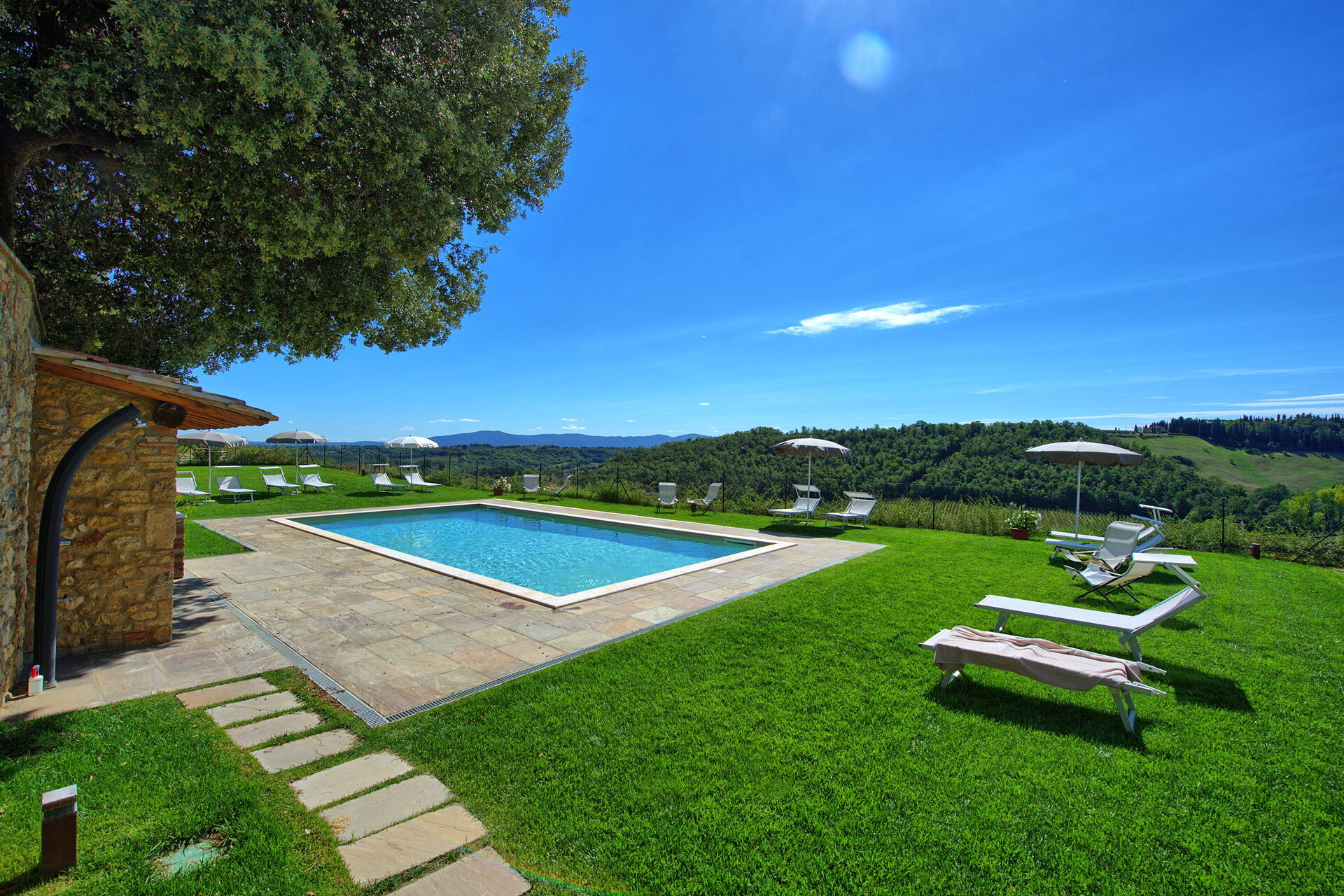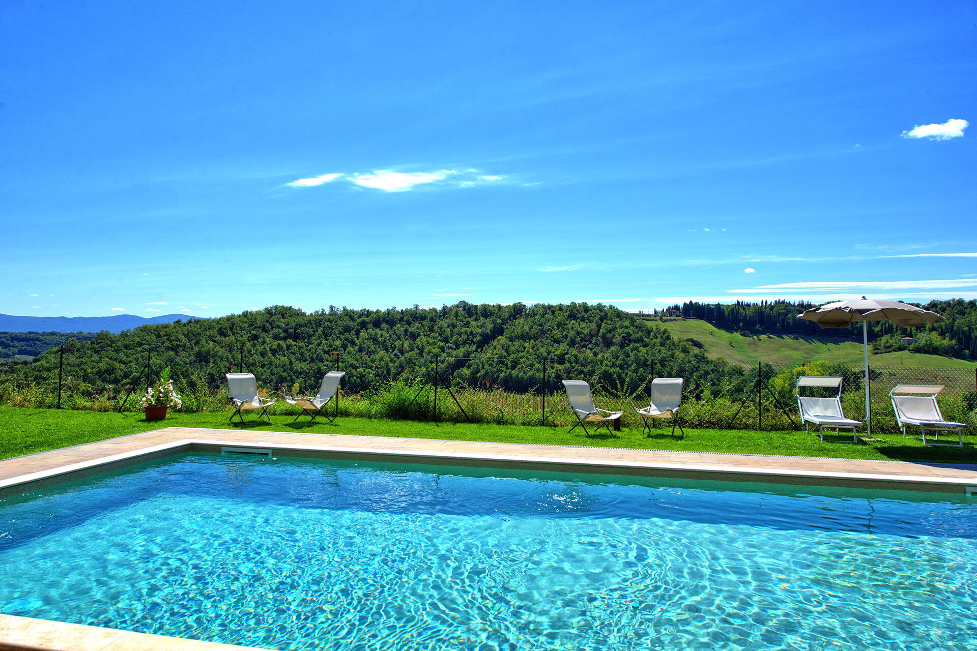 Den nya poolen ligger bredvid lägenheterna och delas mellan gästerna i de 5 enheterna, villan (ca. 100 m bort) och ettrumslägenheten (650 m bort). På Montauto befinner du dig mitt i ett unikt landskap, men samtidigt väldigt nära den historiska staden San Gimignano och många av Toscanas mest kända attraktioner, som Volterra, Siena, Florens, Arezzo, Chianti Classico och Val d'Orcia.