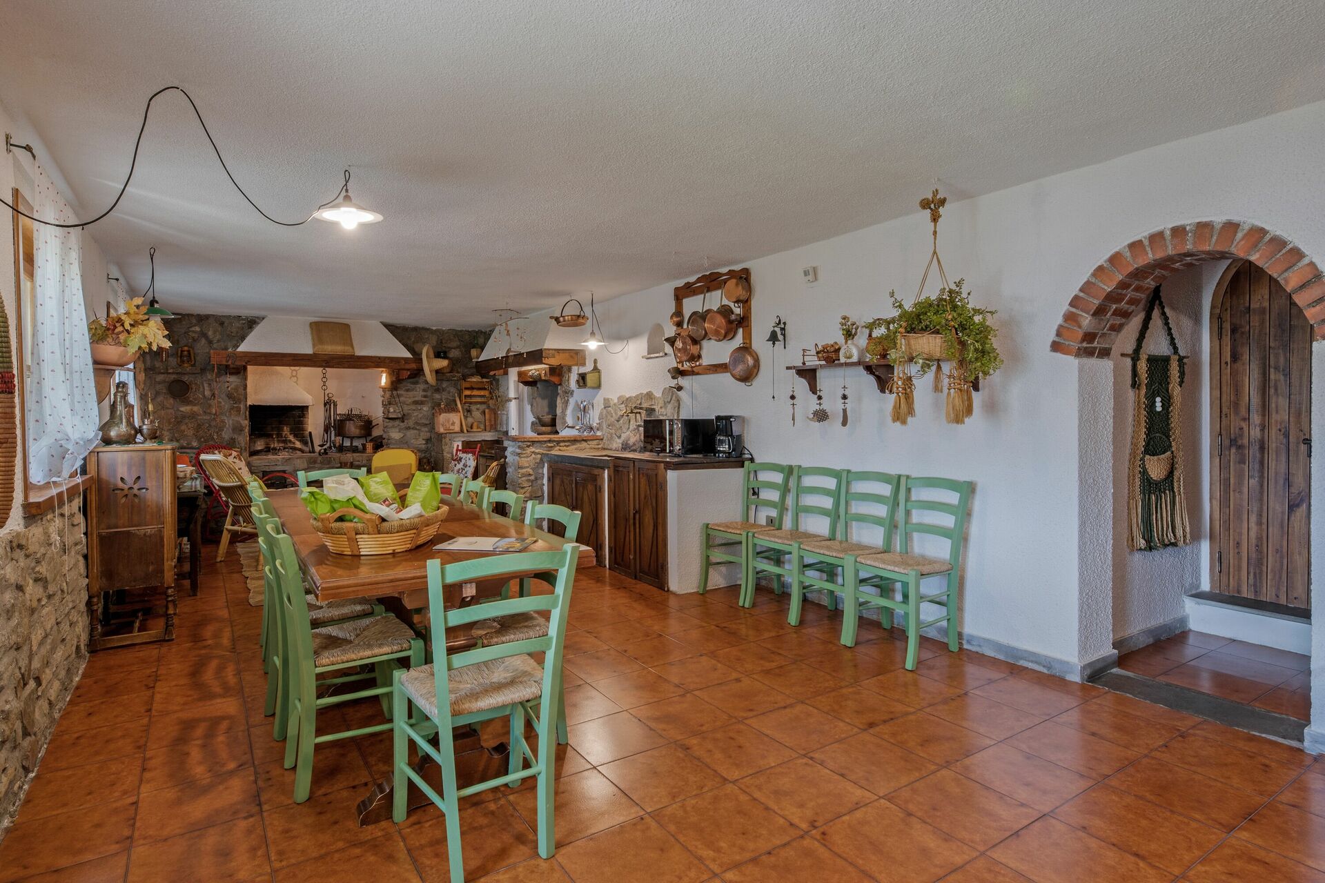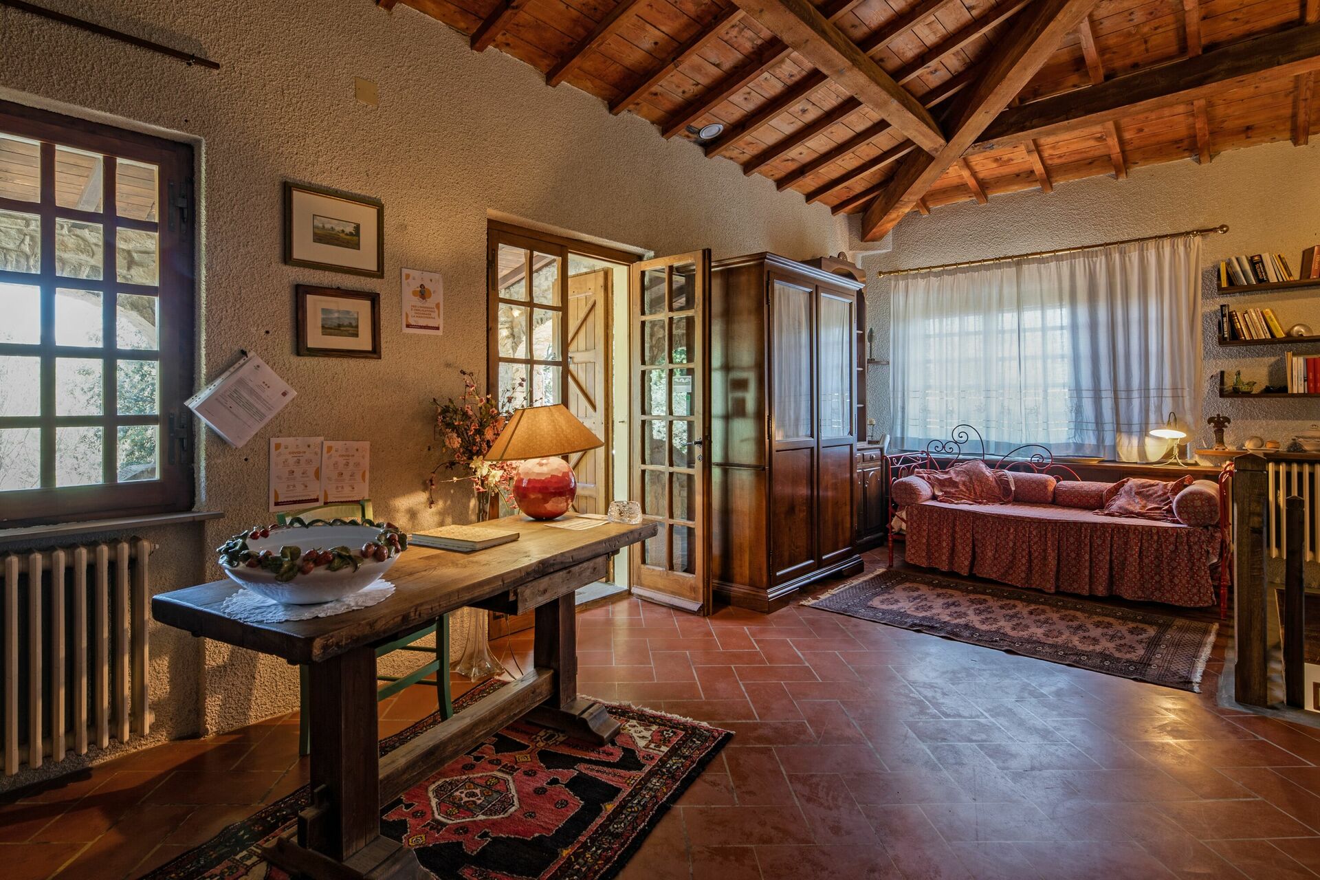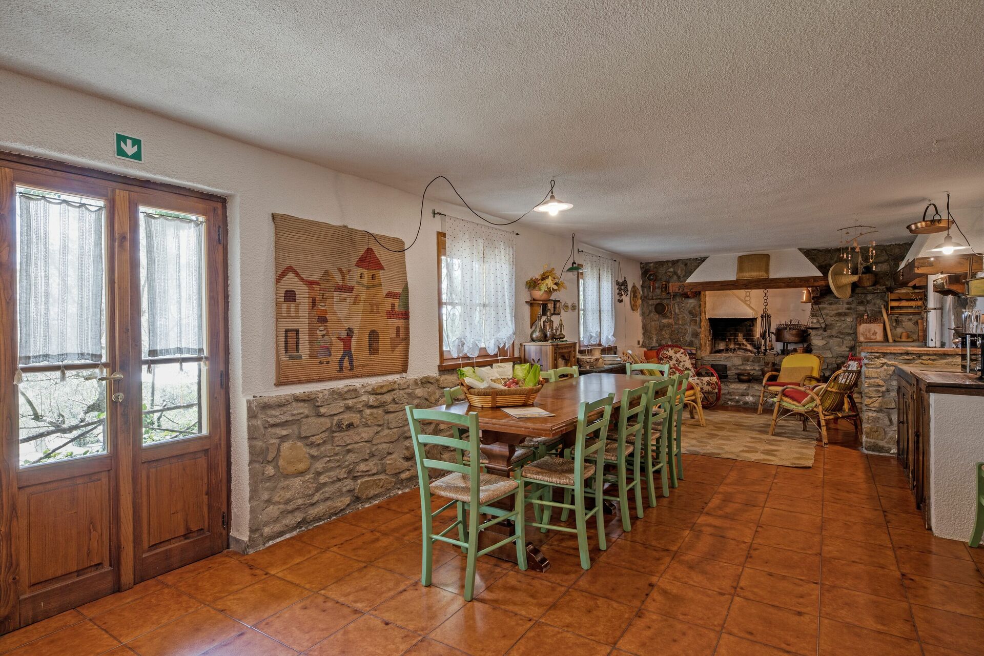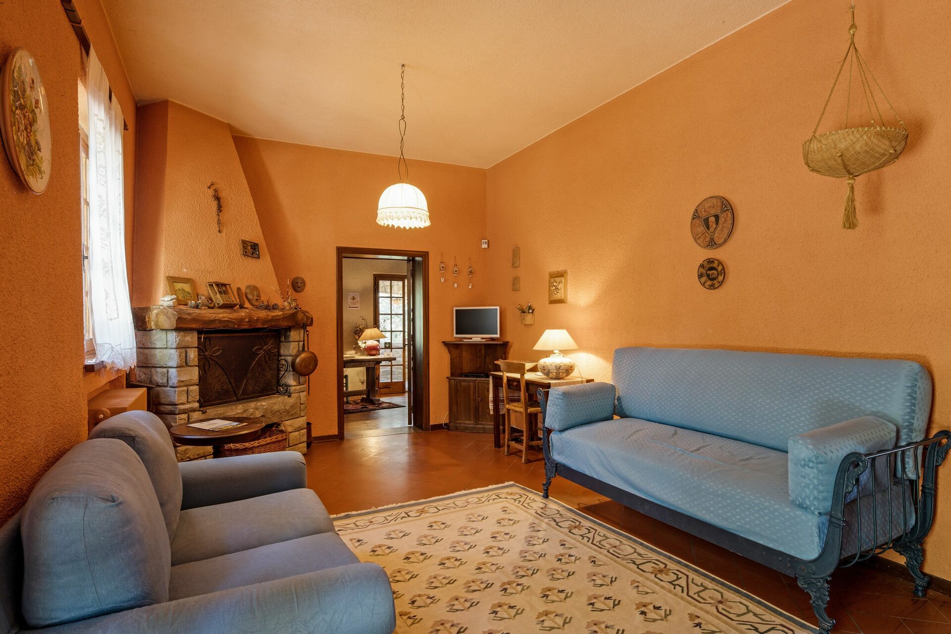 Första våningen (även tillgänglig från utsidan): vardagsrum; andra vardagsrum med TV och öppen spis; dubbelrum (luftkonditionering) med litet privat badrum med dusch; dubbelrum (luftkonditionering); badrum med dusch; sovrum (luftkonditionering) med dubbelsäng och enkelsäng.