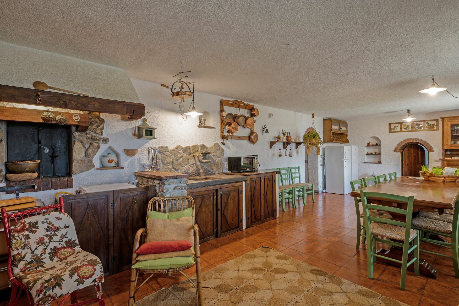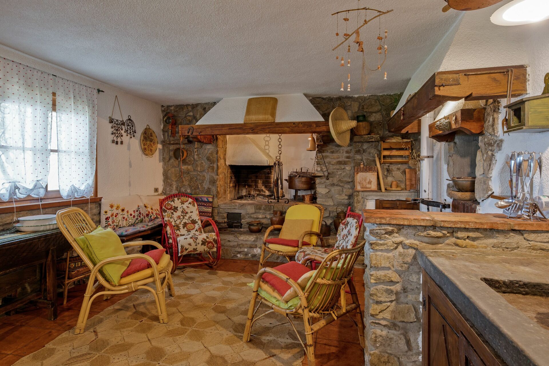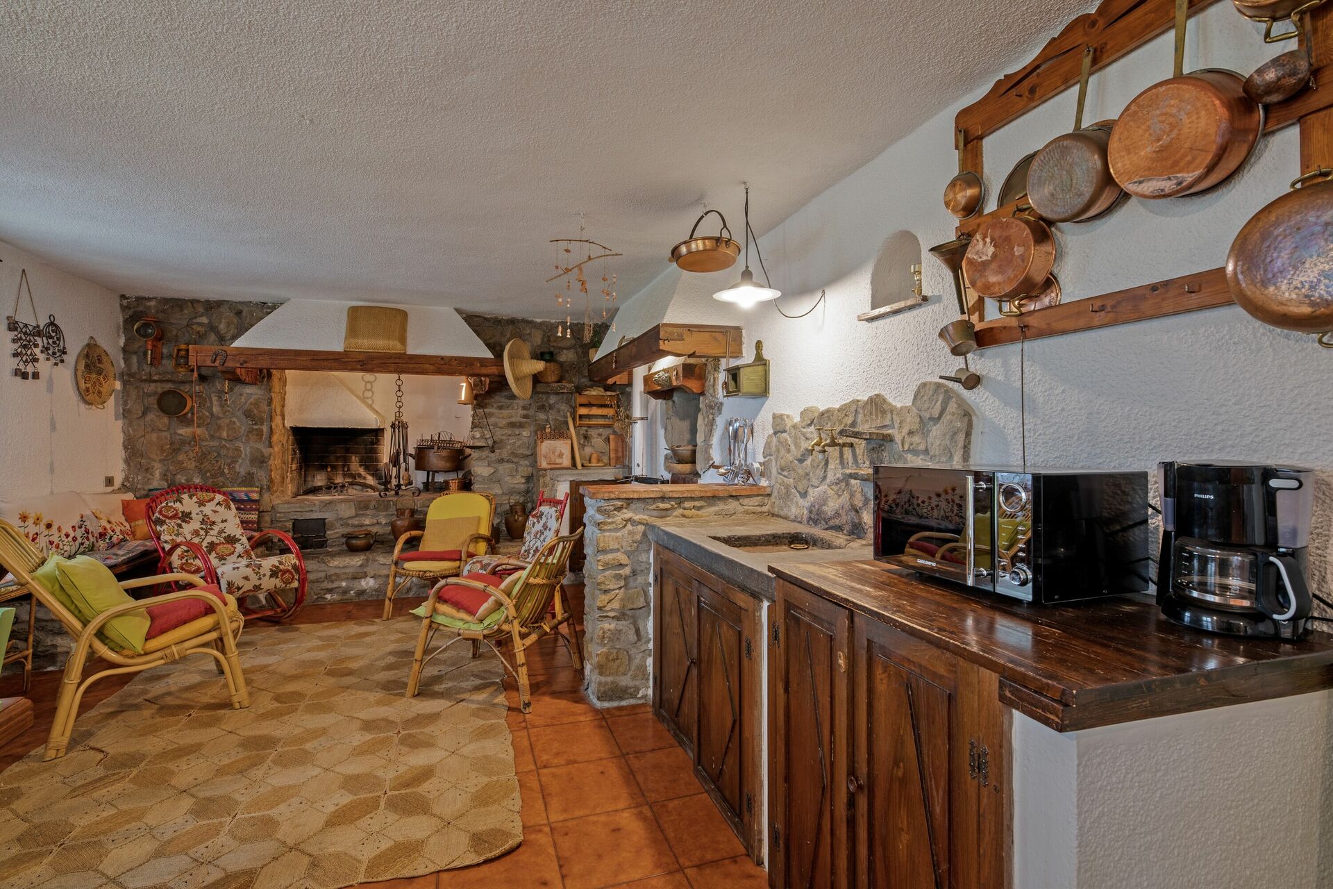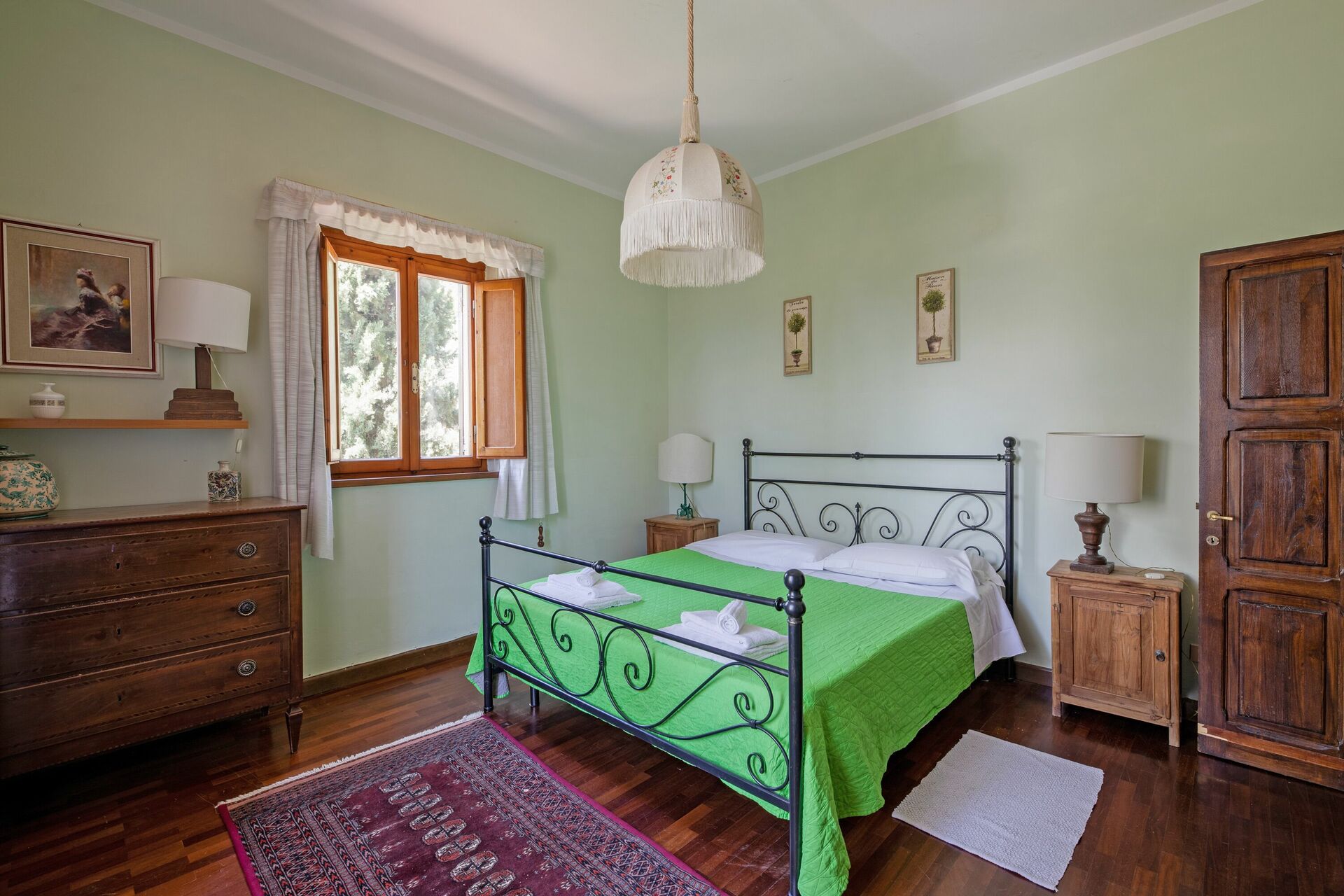 Första våningen (även tillgänglig från utsidan): vardagsrum; andra vardagsrum med TV och öppen spis; dubbelrum (luftkonditionering) med litet privat badrum med dusch; dubbelrum (luftkonditionering); badrum med dusch; sovrum (luftkonditionering) med dubbelsäng och enkelsäng.