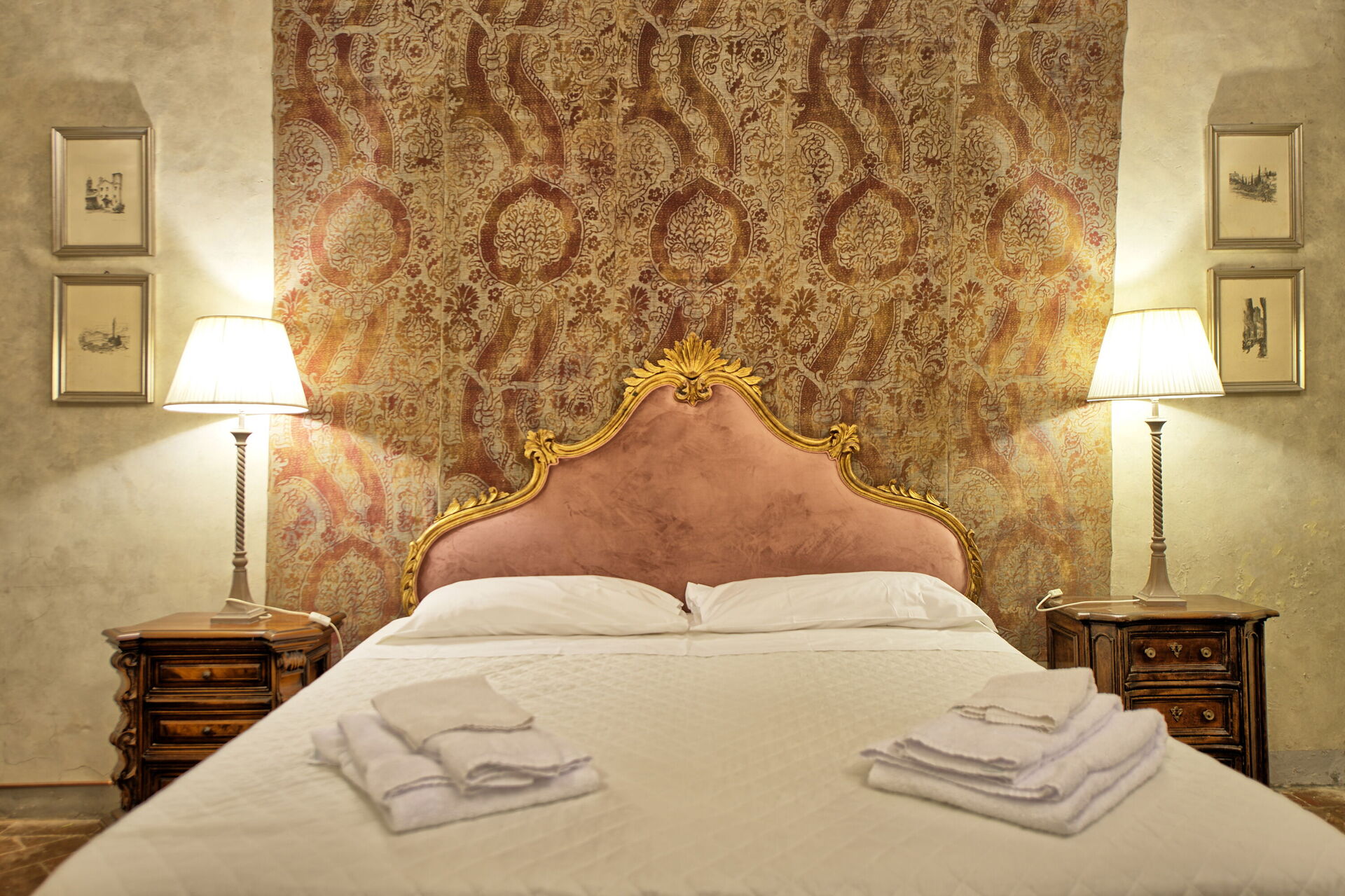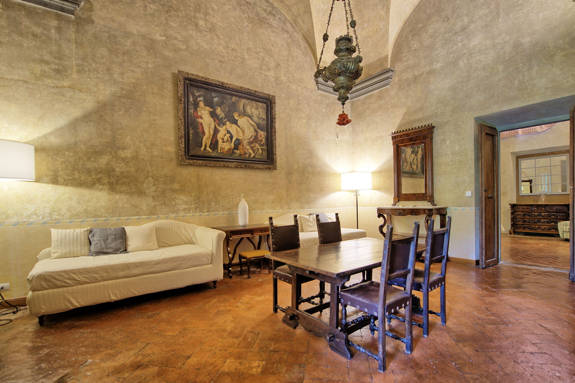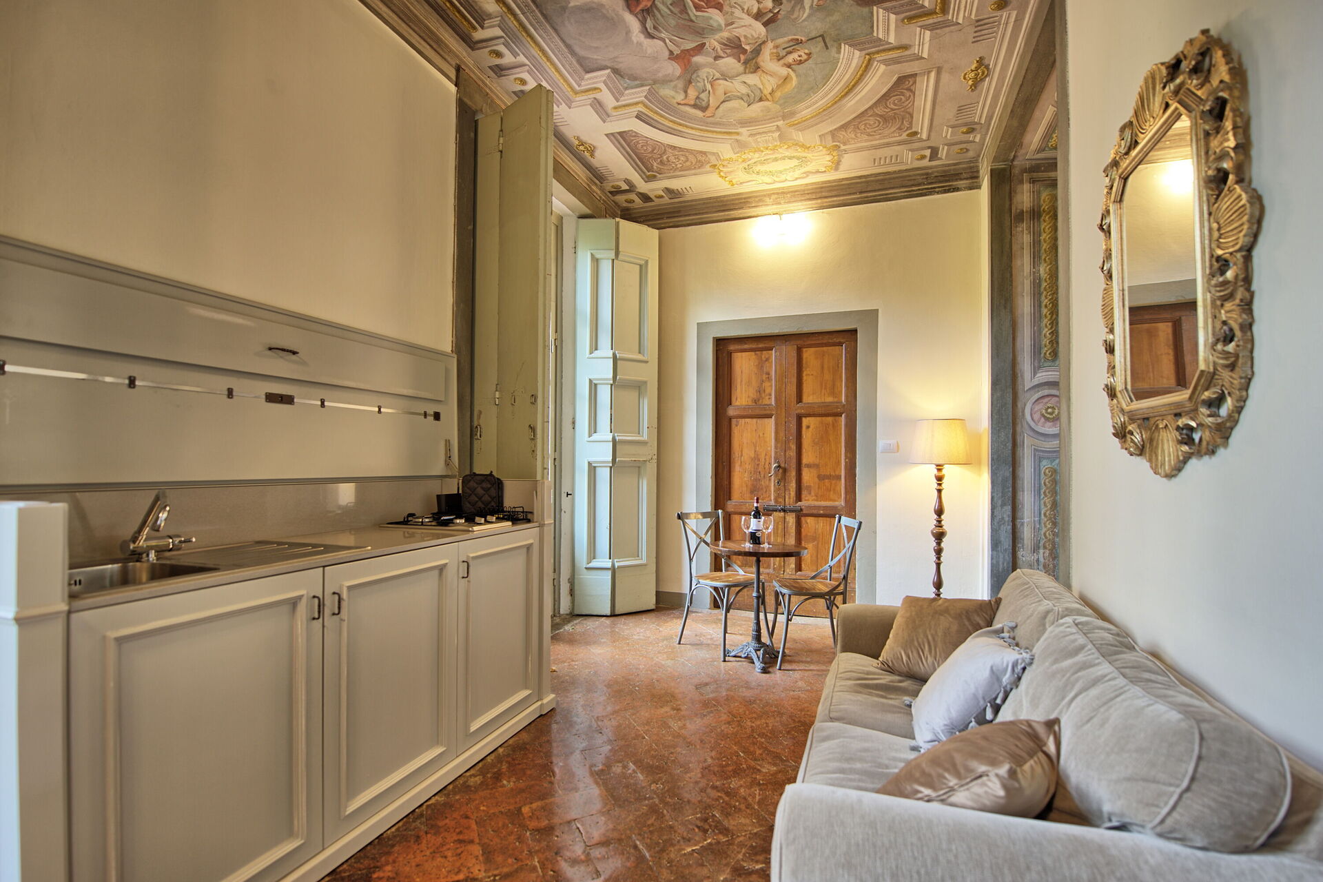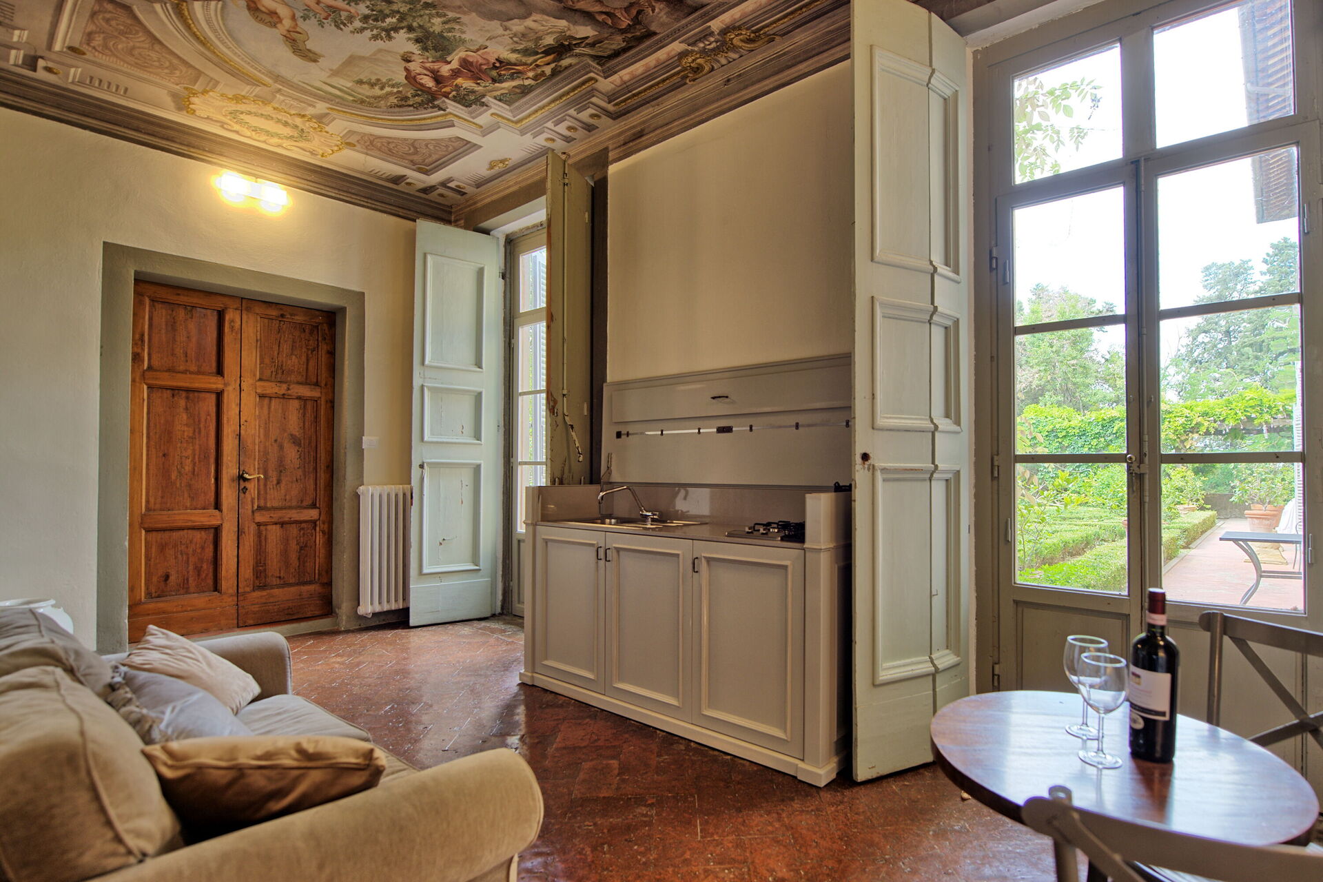 Ingång med vackra fresker i taket med litet pentry och tillgång till den italienska trädgården, stort vardagsrum med matplats och 2 bäddsoffor, 1 dubbelrum med fresker i taket, badrum med dusch