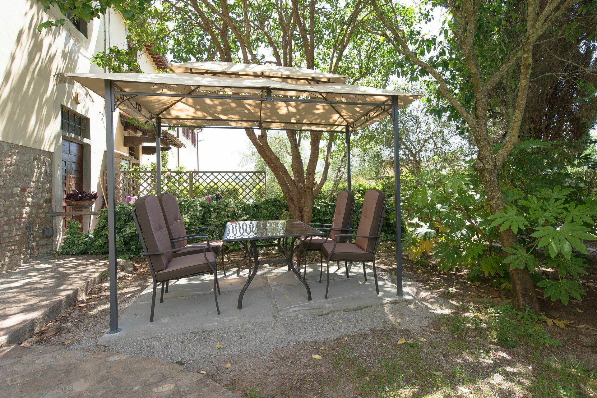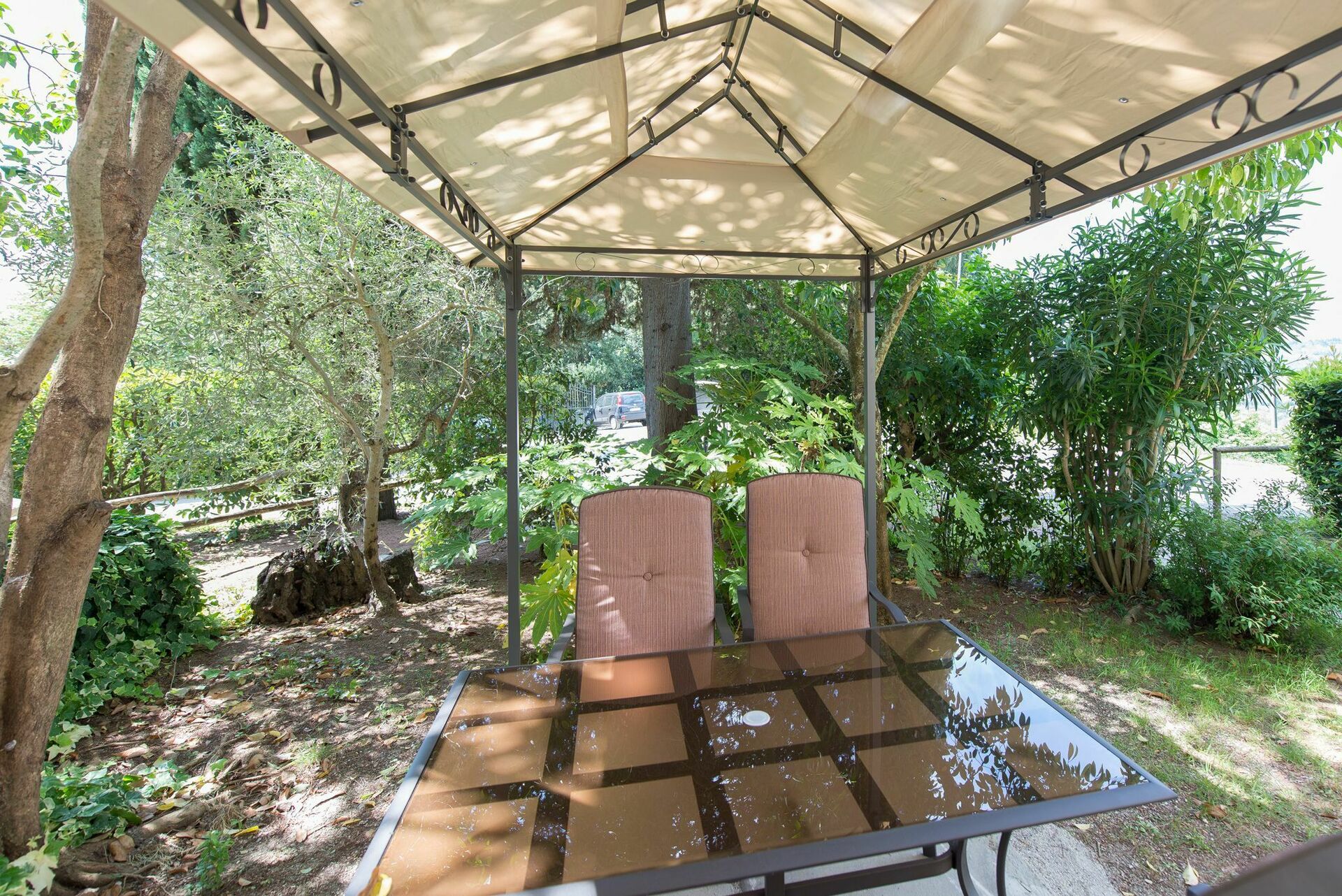 Personligt, möblerat utomhusområde med lusthus, bord och stolar