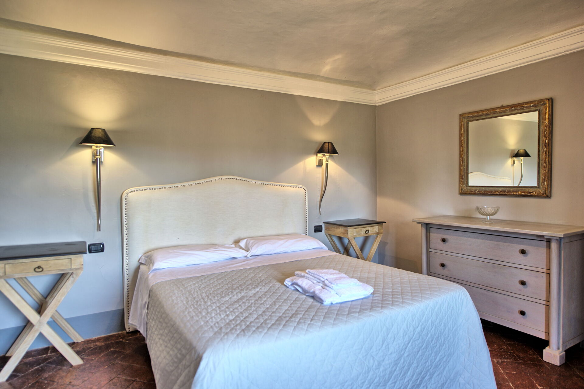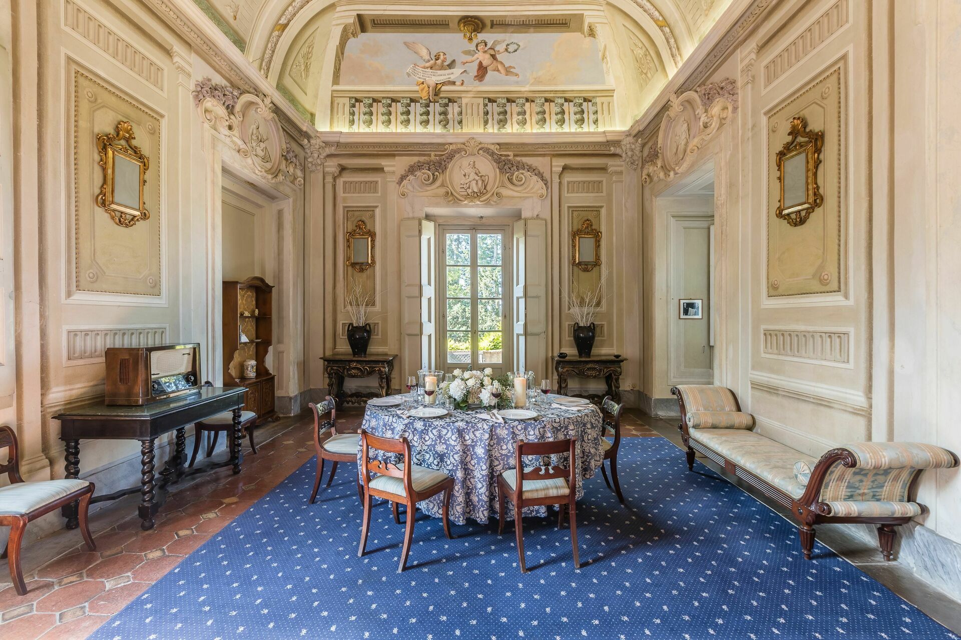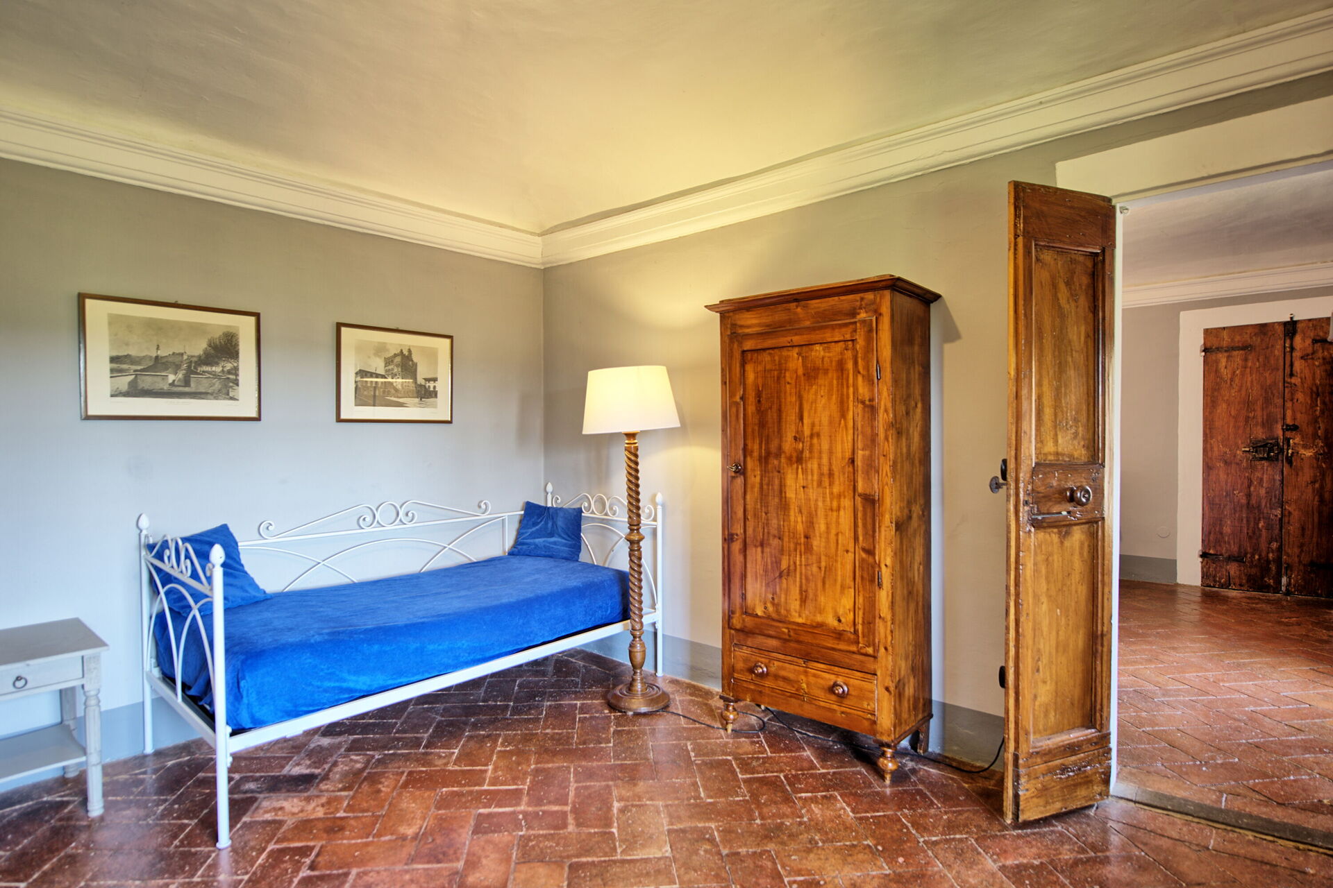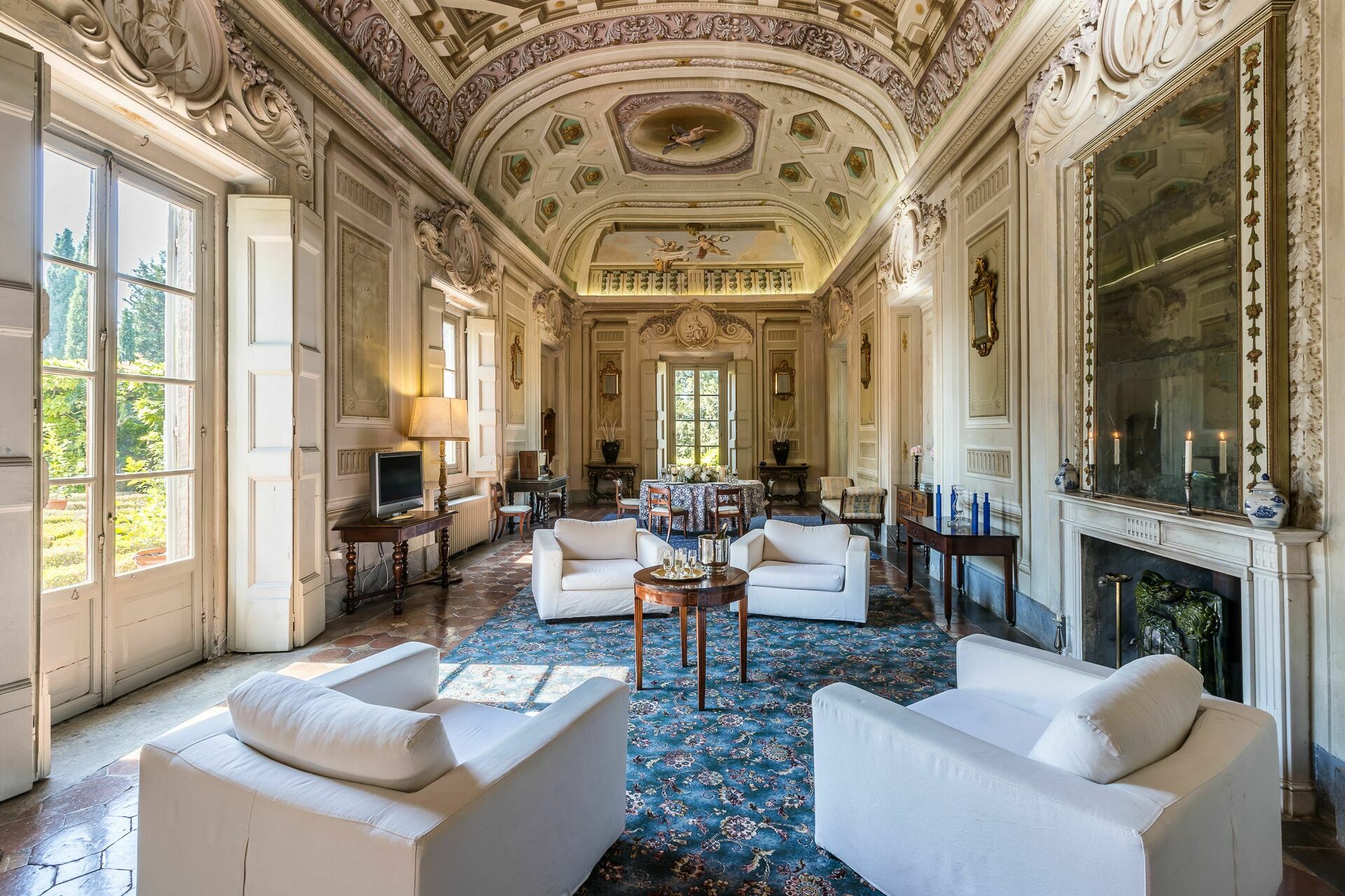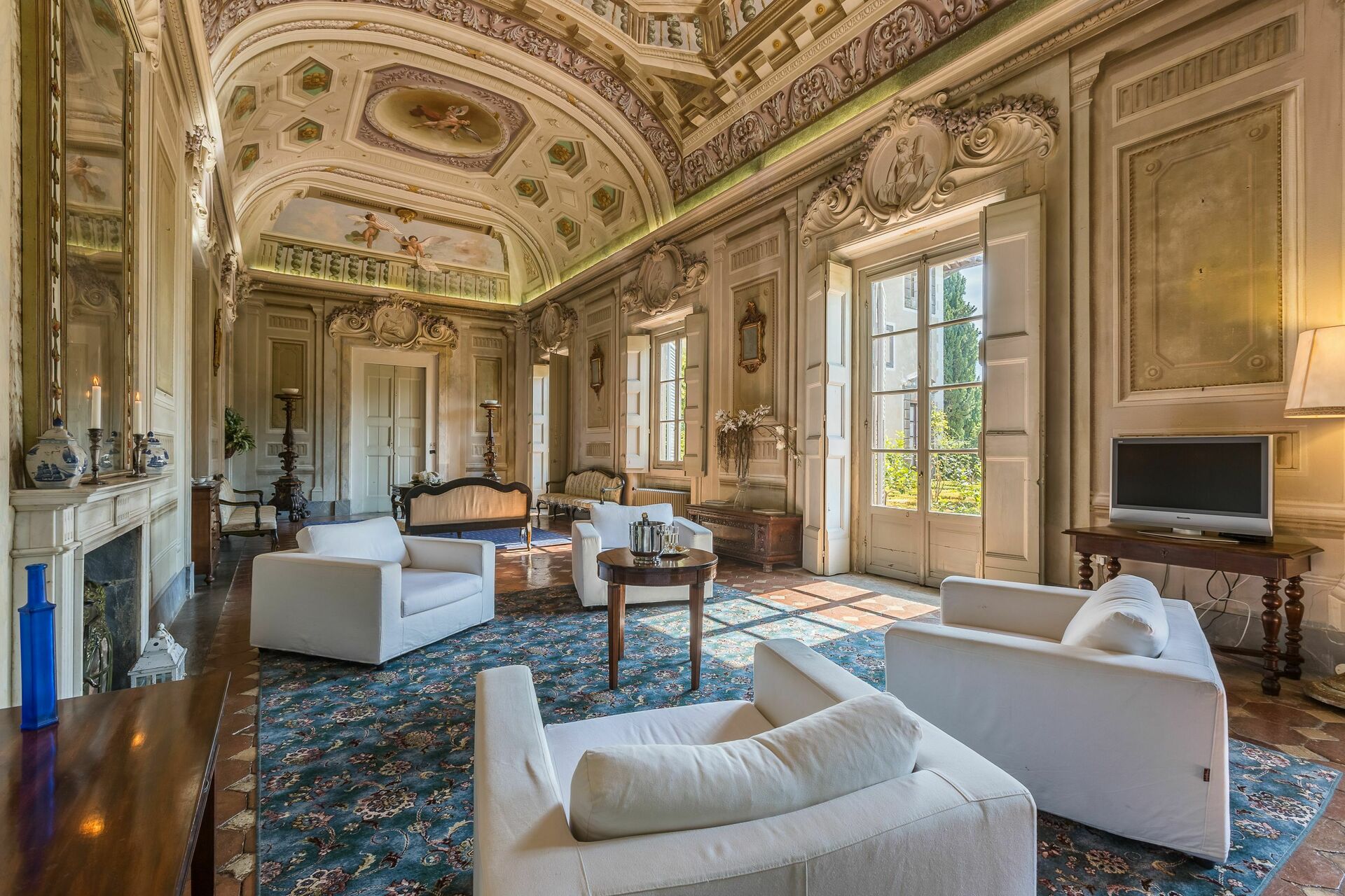 Stor ingång som använts som "sale d'armes", rymligt och ljust vardagsrum med vackra fresker i tak, öppen spis (ej användbar) med frescoer av Pucci från år 1700, 6 stora Franska fönster och utsikt över den charmiga italienska trädgården, badrum med dusch