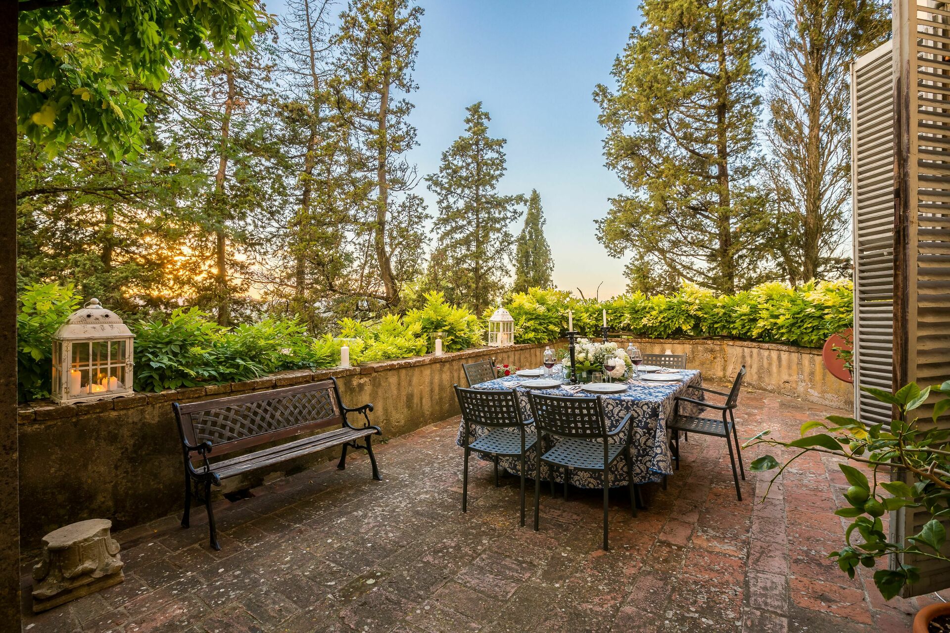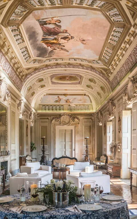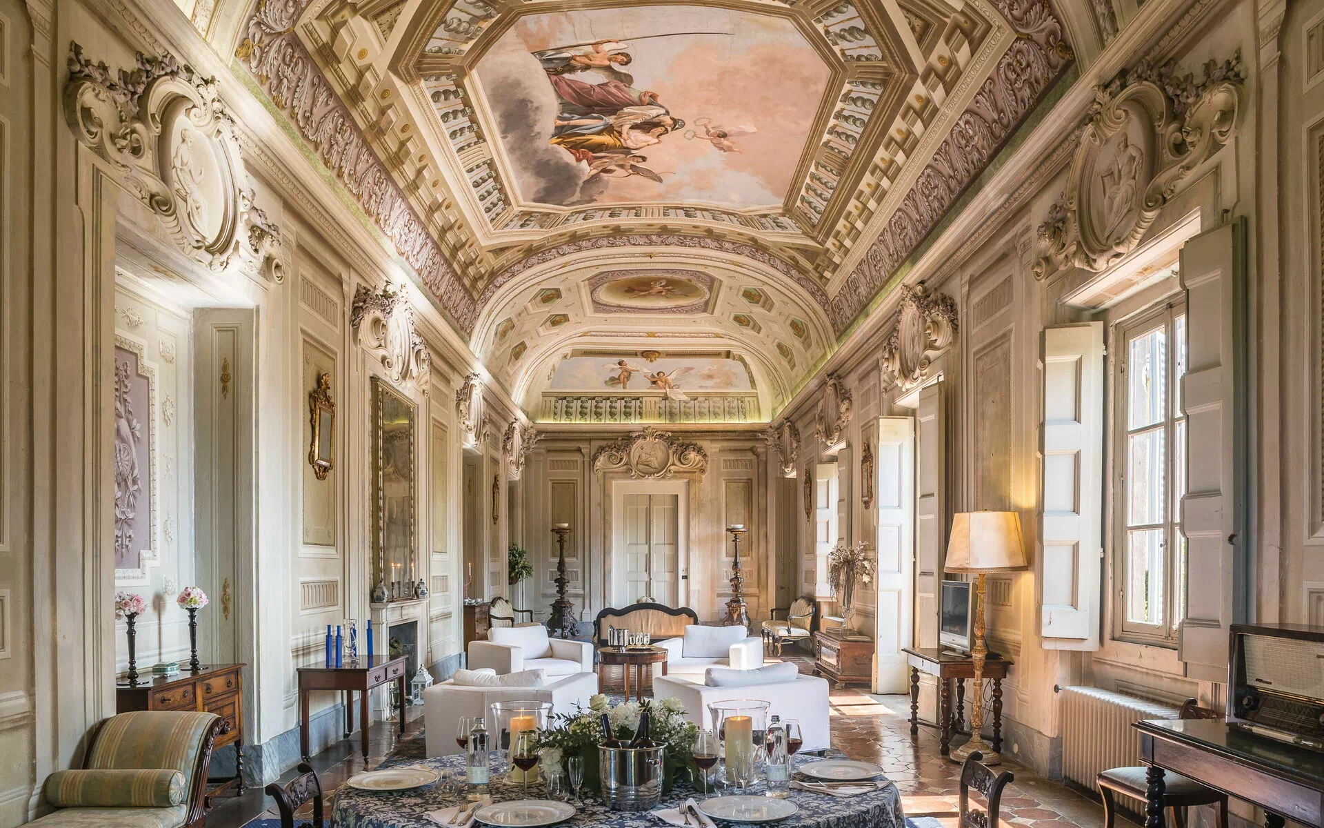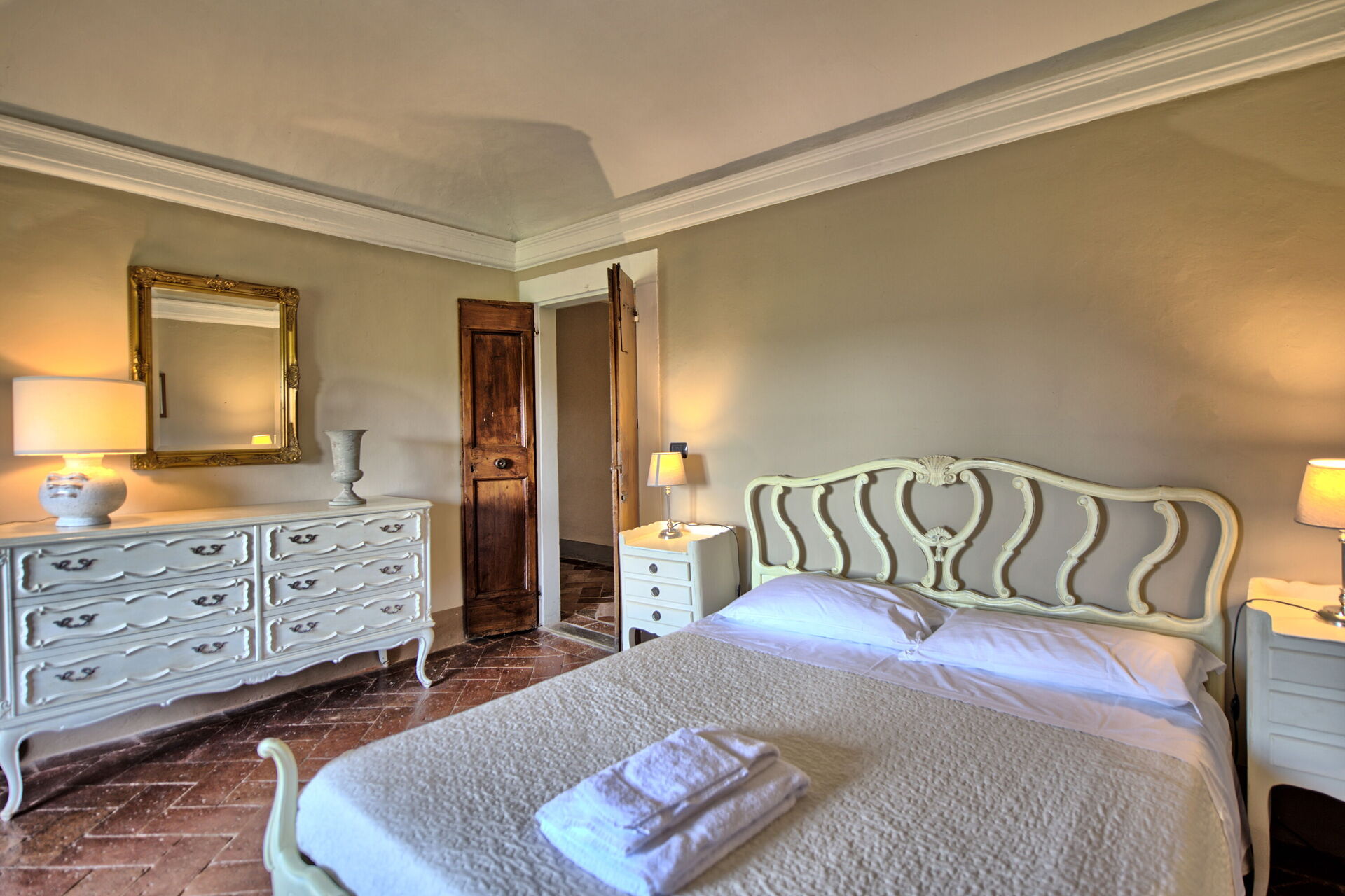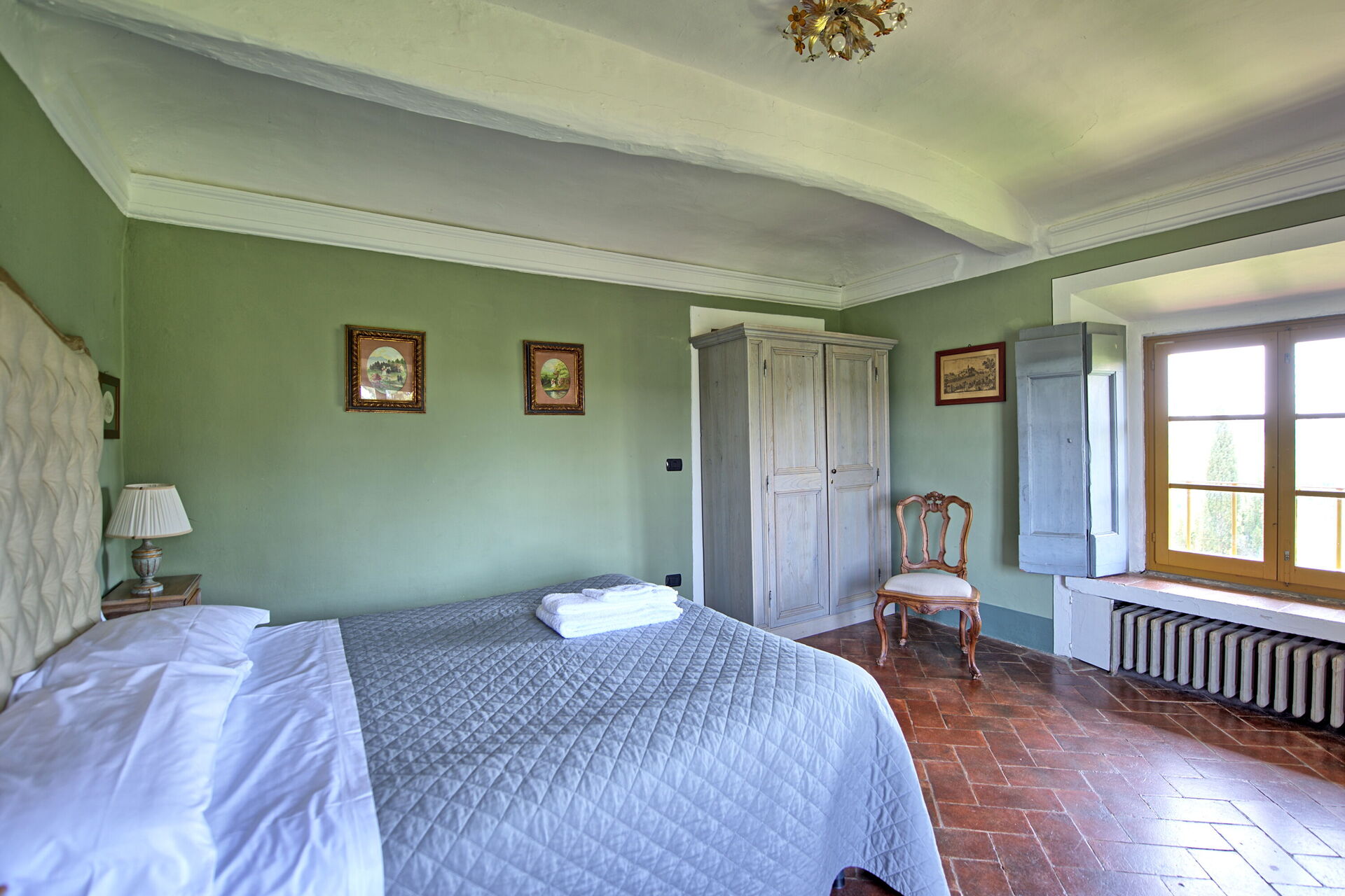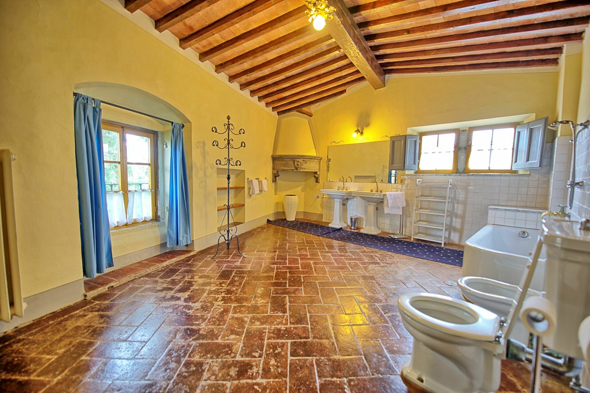 Stor ingång som använts som "sale d'armes", rymligt och ljust vardagsrum med vackra fresker i tak, öppen spis (ej användbar) med frescoer av Pucci från år 1700, 6 stora Franska fönster och utsikt över den charmiga italienska trädgården, badrum med dusch