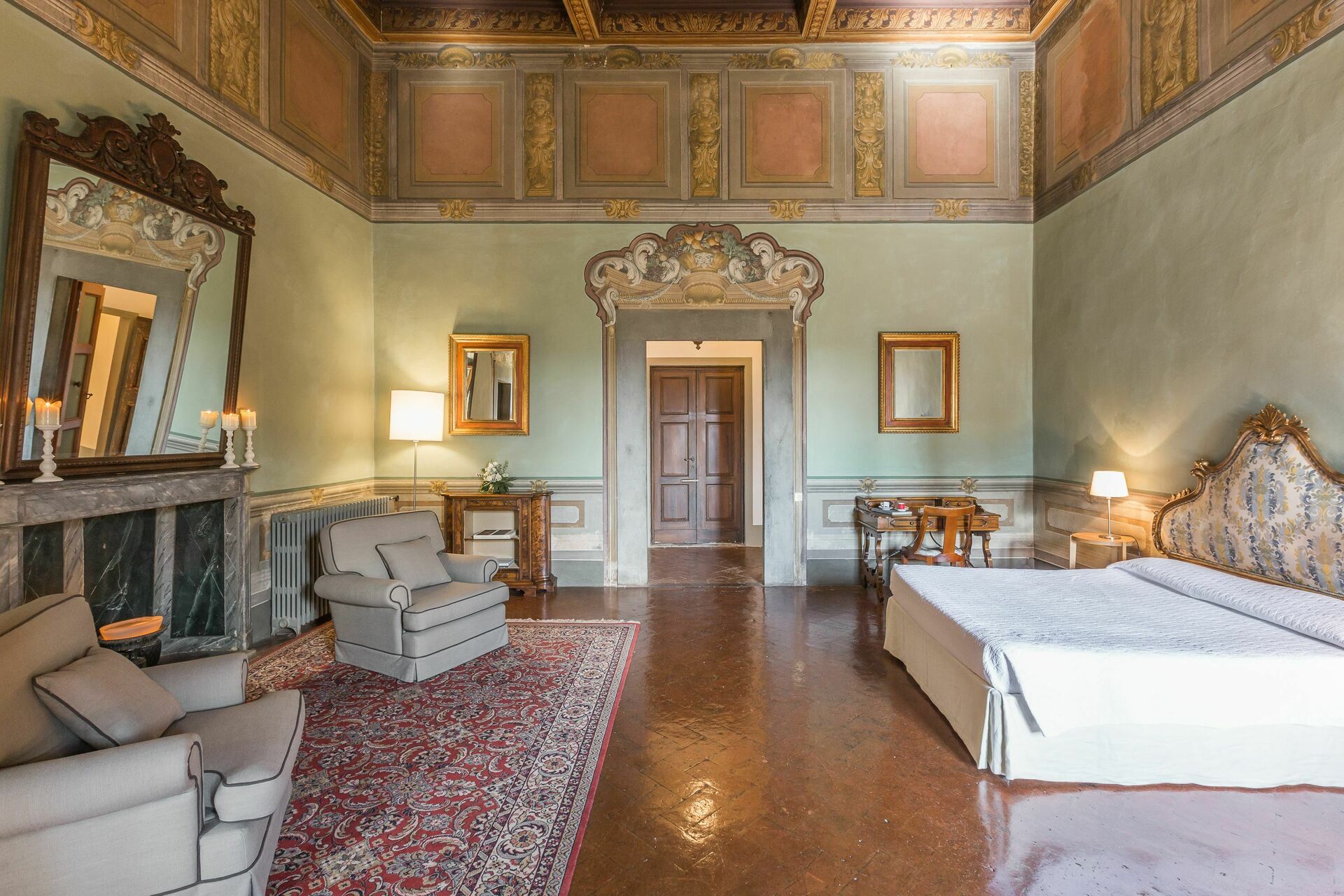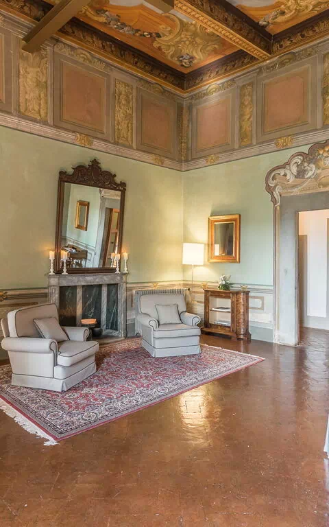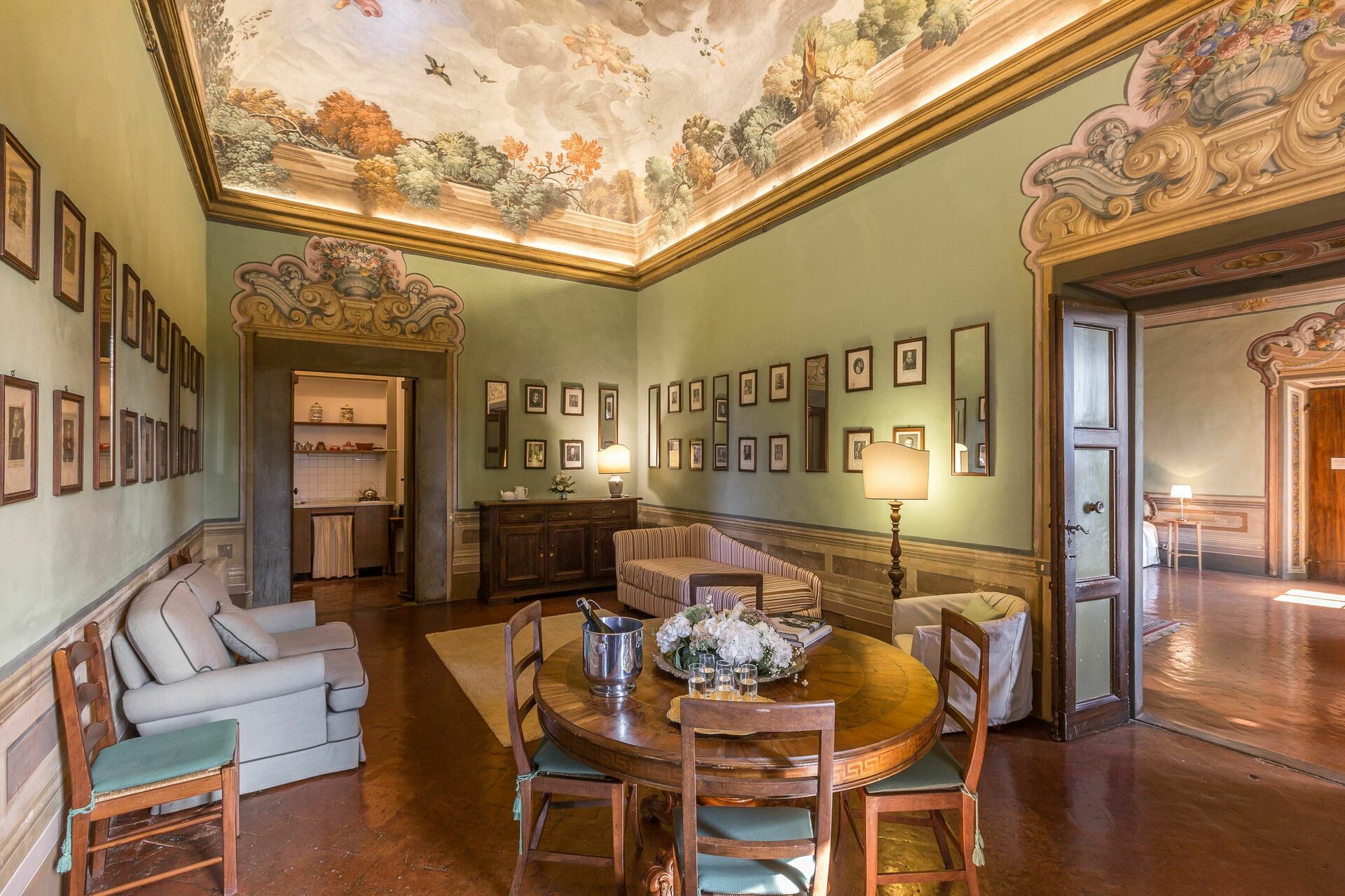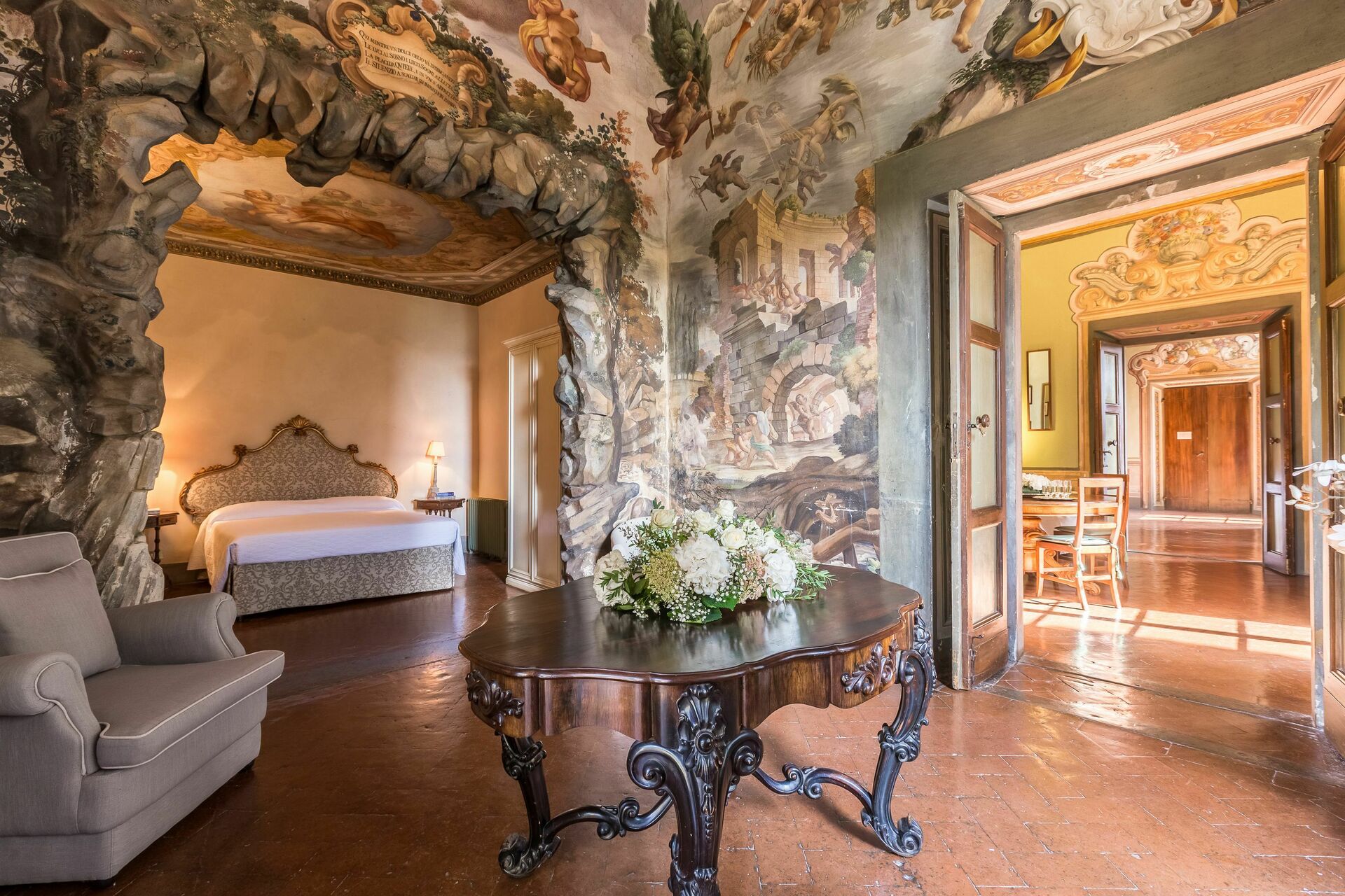 Denna lägenheten är charmigt dekorerad med fresker (takmålningar) från 1600-talet och har fantastisk utsikt över trädgården och det omgivande landskapet