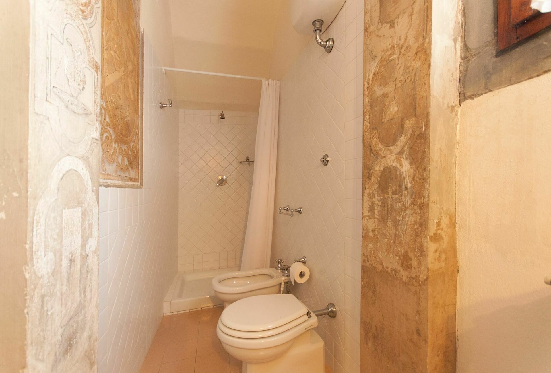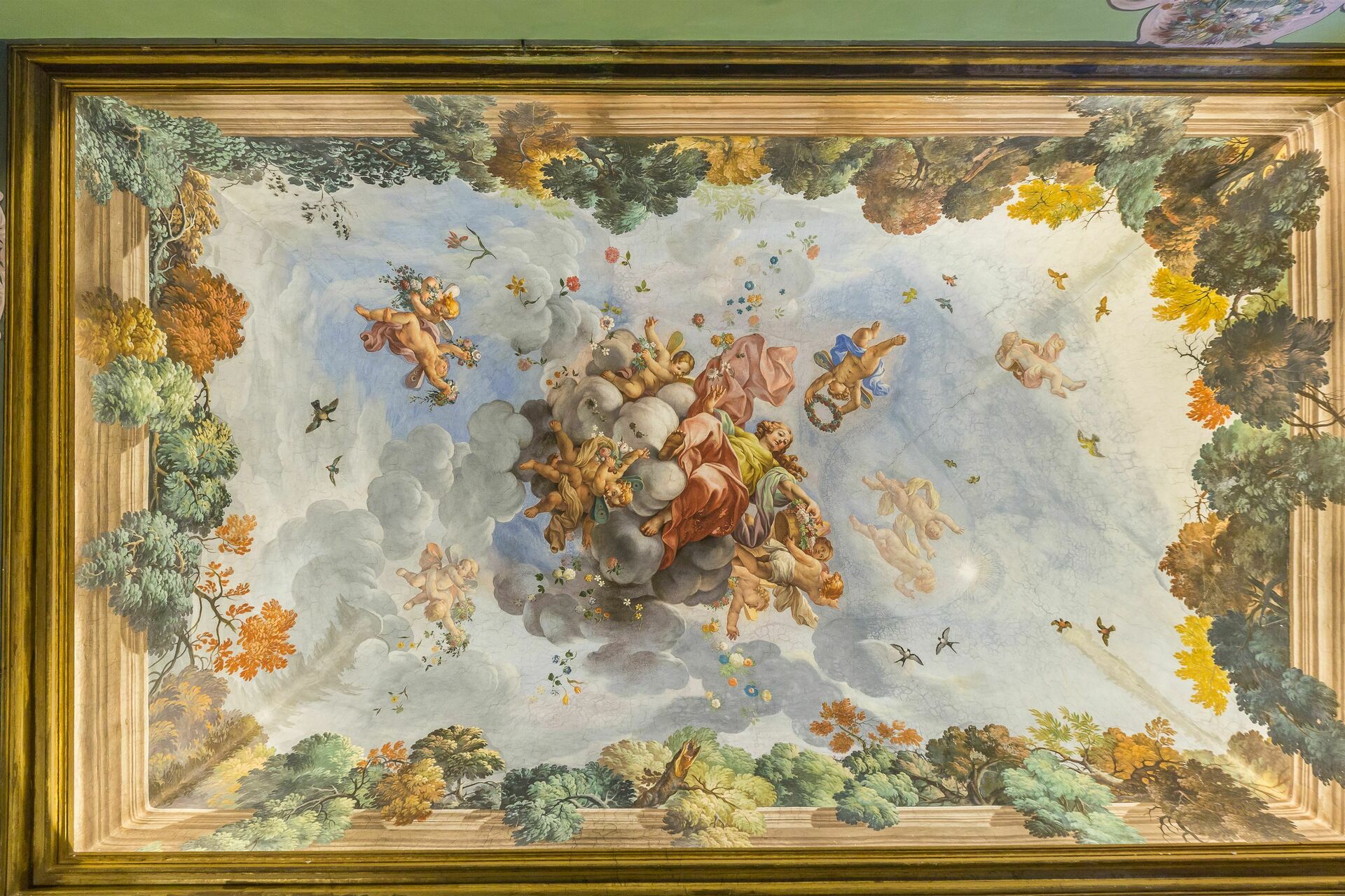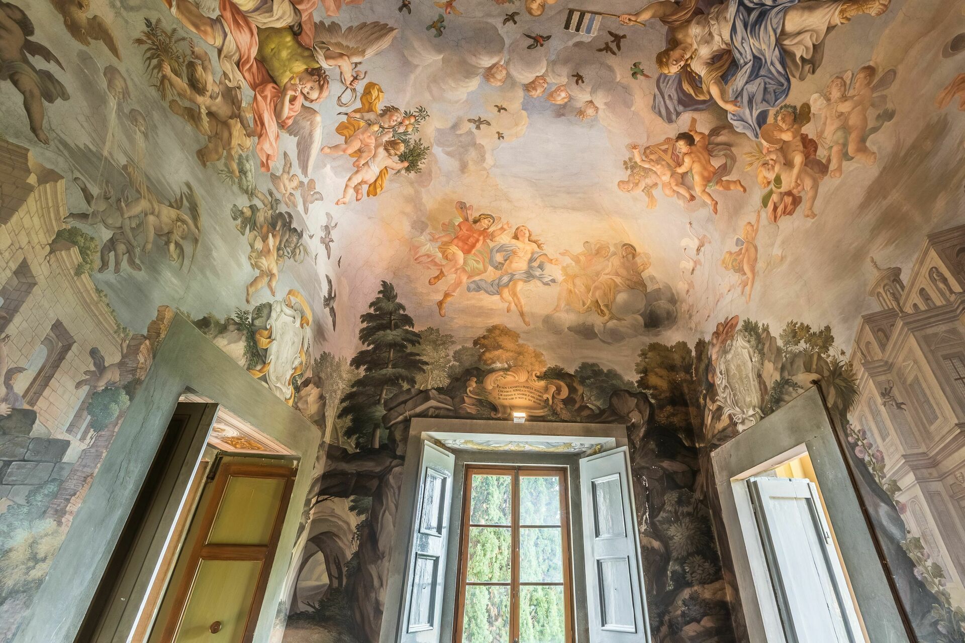 Denna lägenheten är charmigt dekorerad med fresker (takmålningar) från 1600-talet och har fantastisk utsikt över trädgården och det omgivande landskapet
