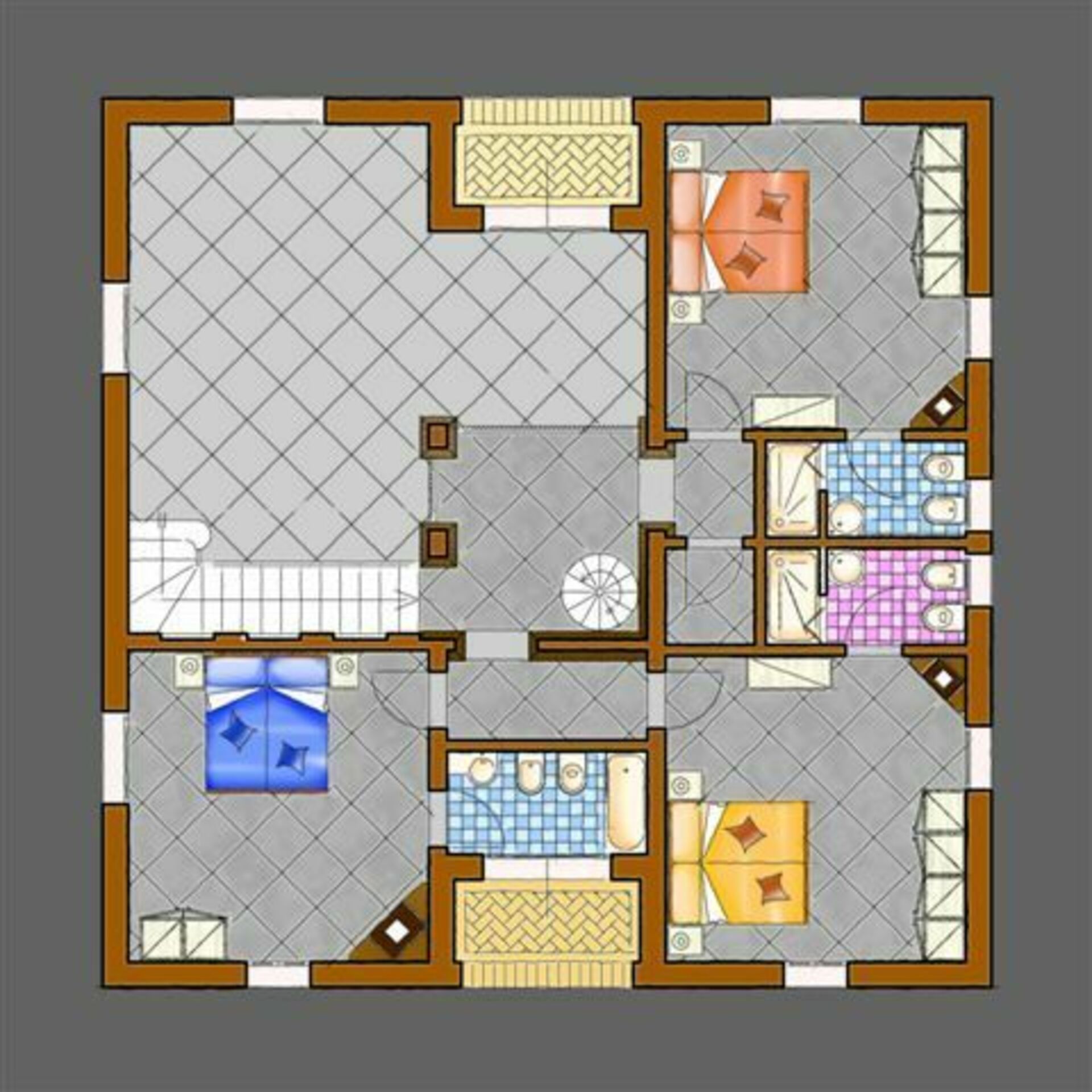 Första våningen: 2 två-bäddsrum (som kan omvandlas till dubbelrum) både med öppen spis och badrum med dusch, dubbelrum med öppen spis och badrum med dusch.