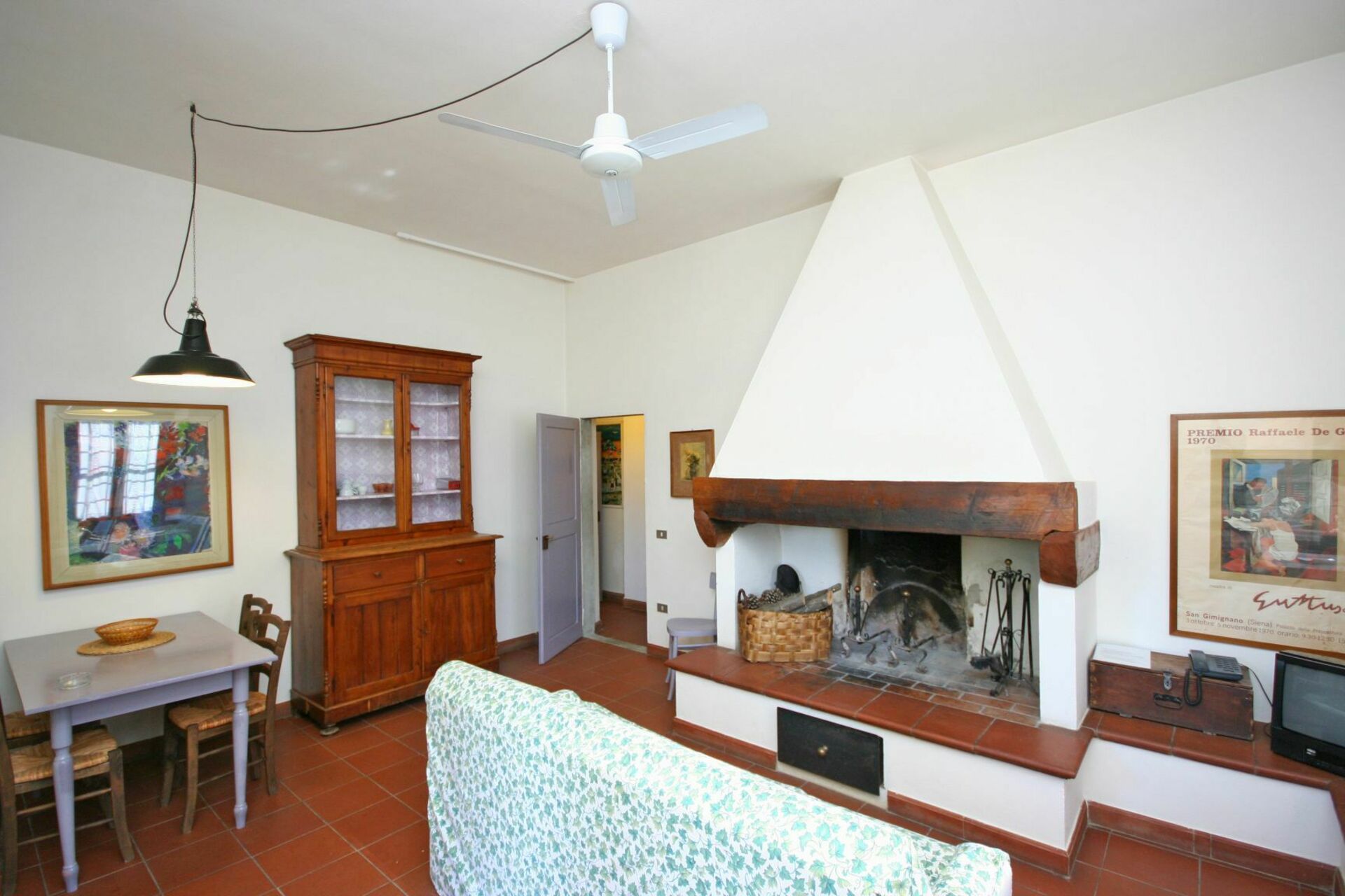 Bottenvåningen: ingång med öppen spis, vardagsrum (satellit-TV) med matplats och pentry (diskmaskin, frys, ugn), toalett.