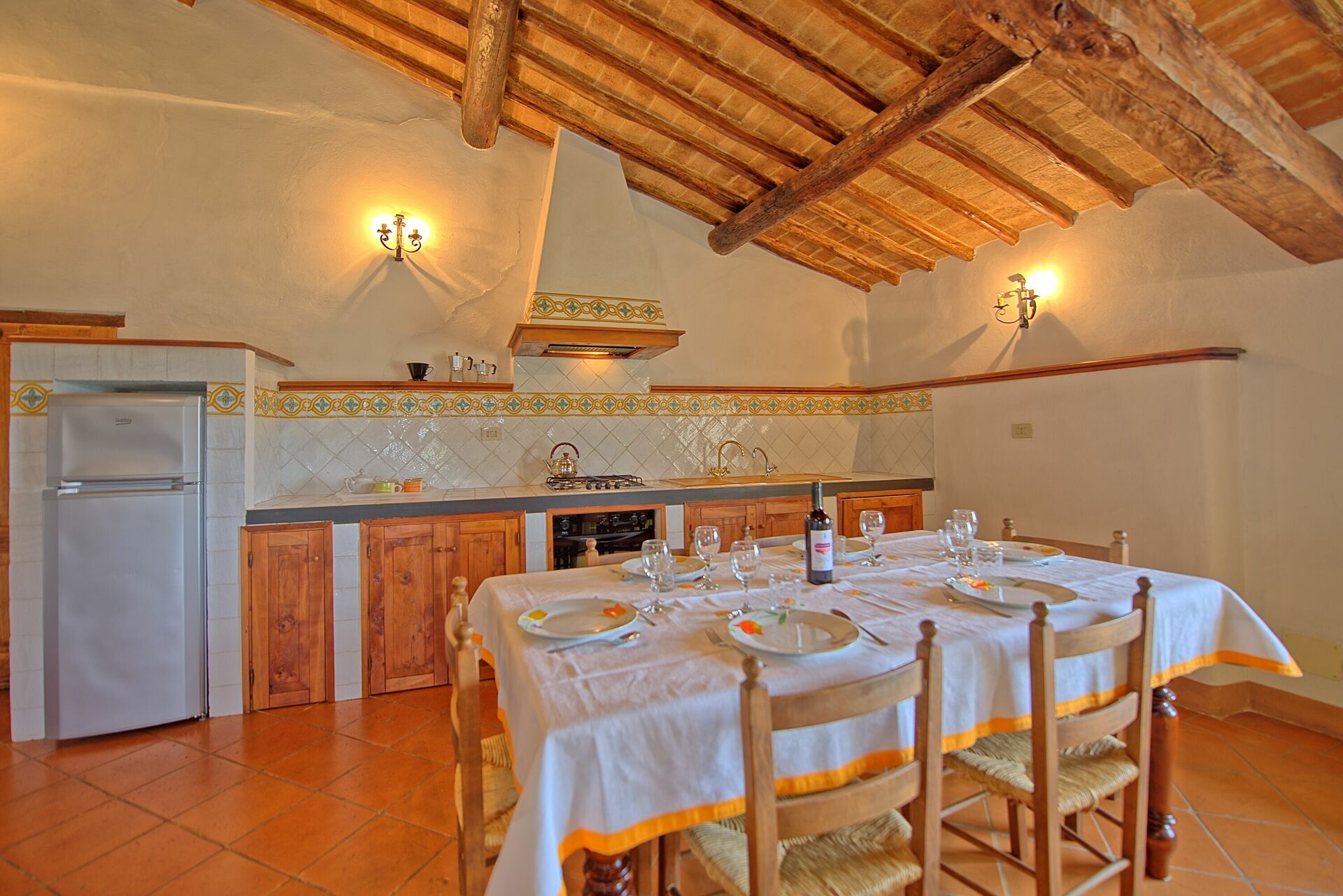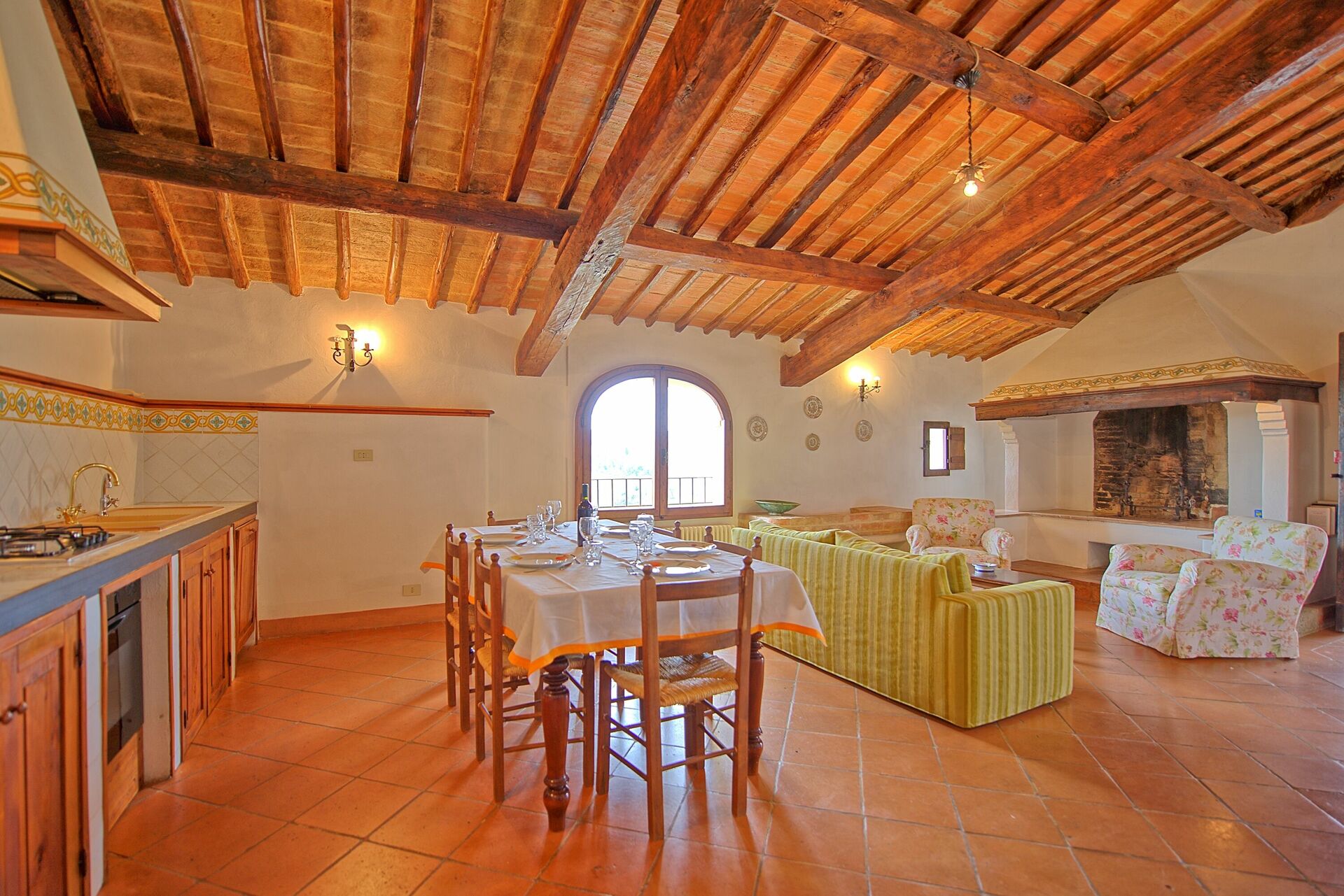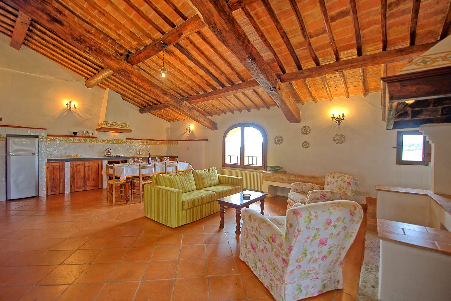 Första våningen: entré via en charmig, välutrustad privat loggia (6m²), stort vardagsrum med matplats, kökshörn (ugn, frys, diskmaskin) och öppen spis, stort dubbelrum med extra enkelsäng , sovrum med 2 enkelsängar, soligt badrum med dusch och badkar.