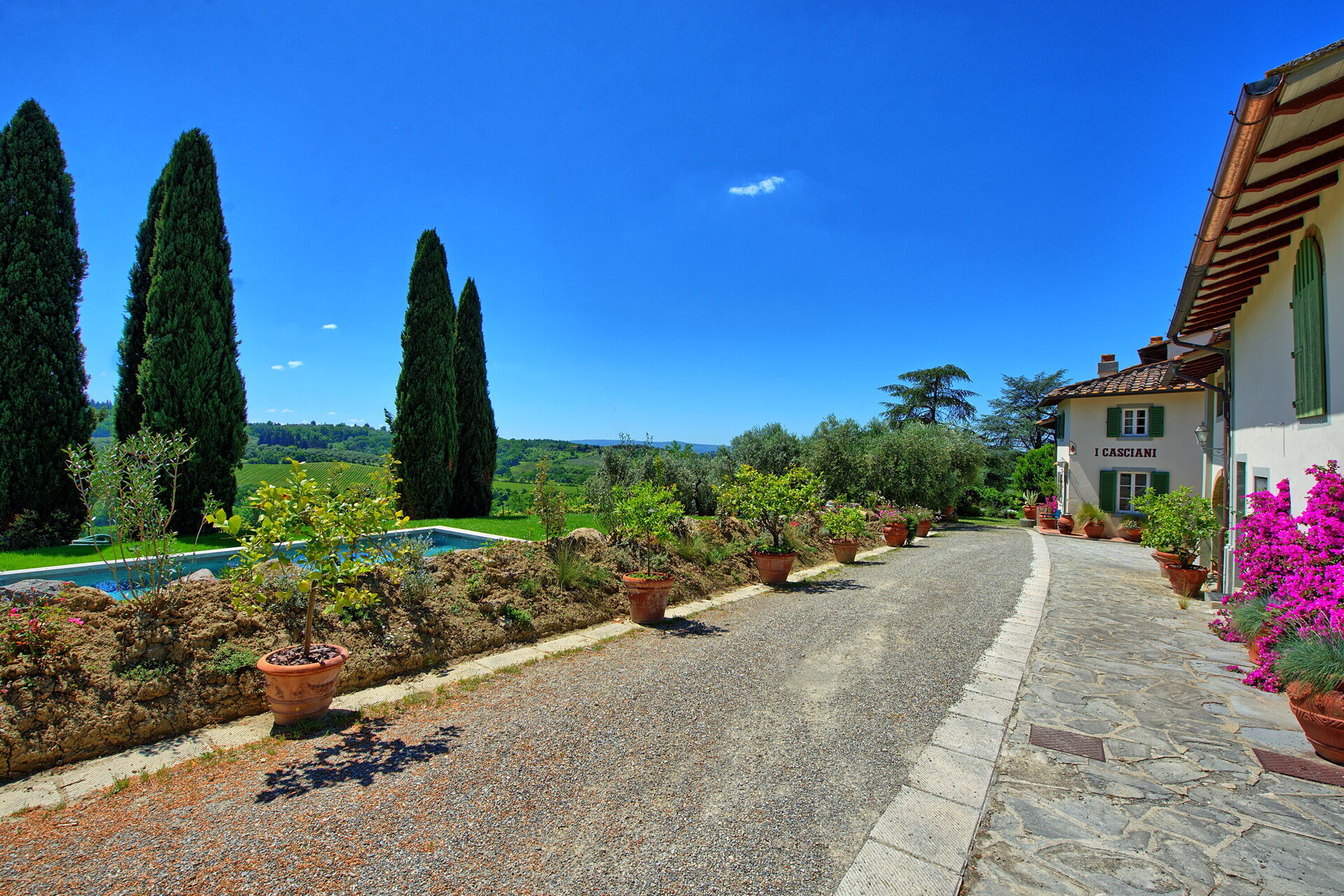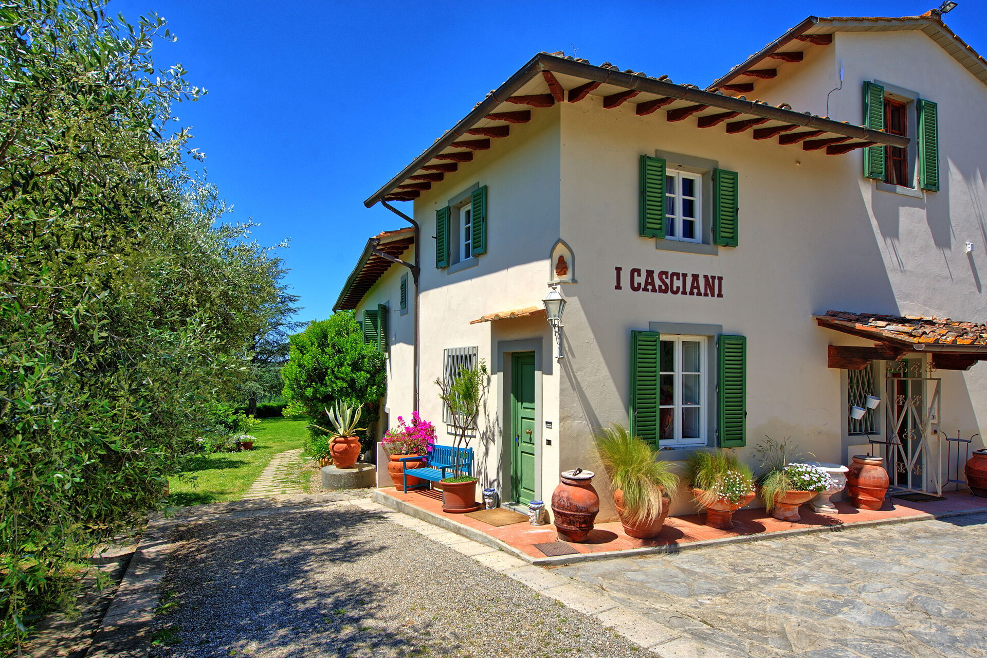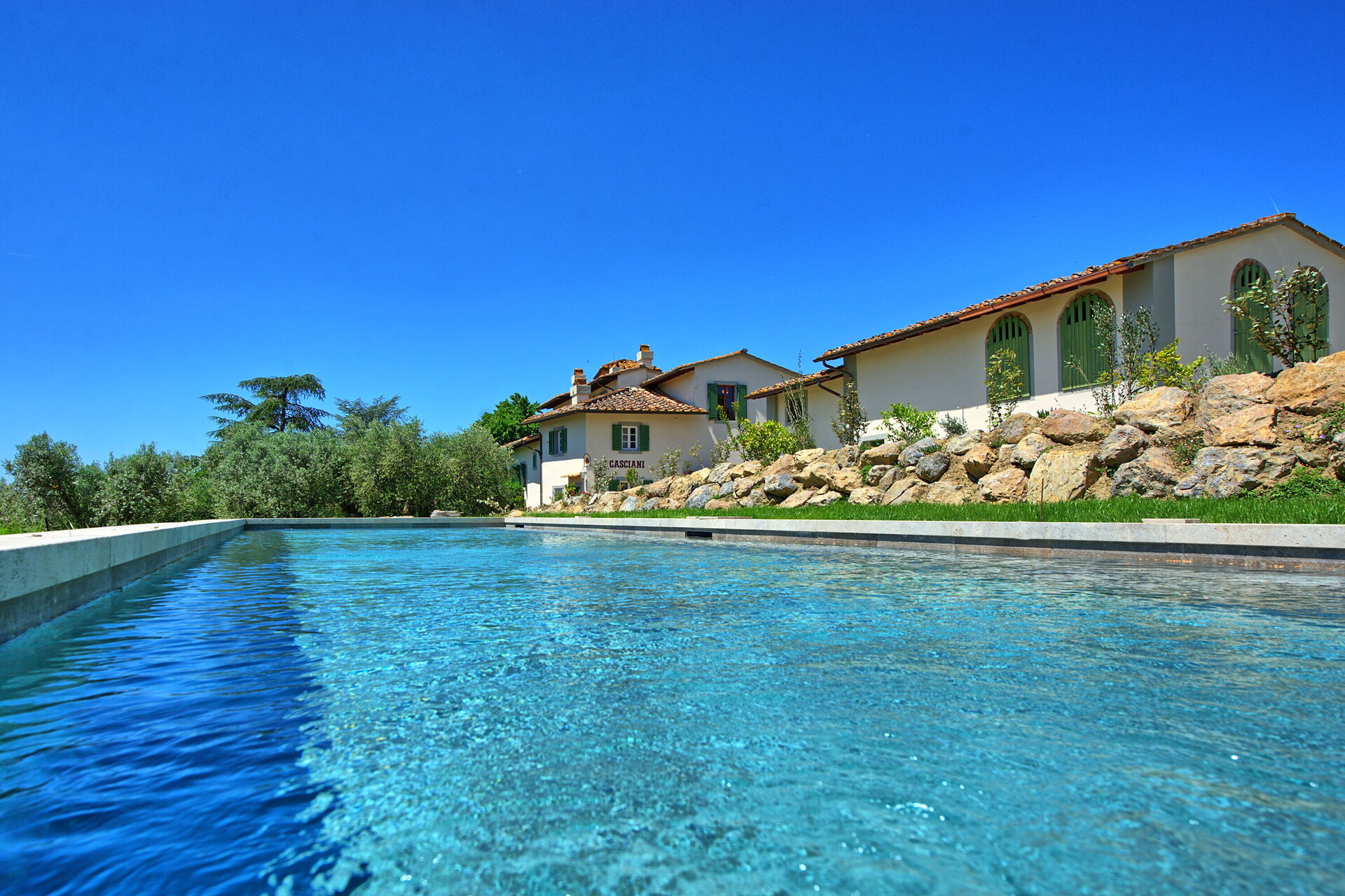 Villa Casciani ligger på en gård omgiven av vingårdar och olivlundar. Semesterhuset har skapats genom att renovera ett gammalt lanthus med respekt för de ursprungliga arkitektoniska detaljerna, vilket resulterar i elegans och komfort. På gården produceras extra jungfruolivolja, vin, grönsaker och honung.