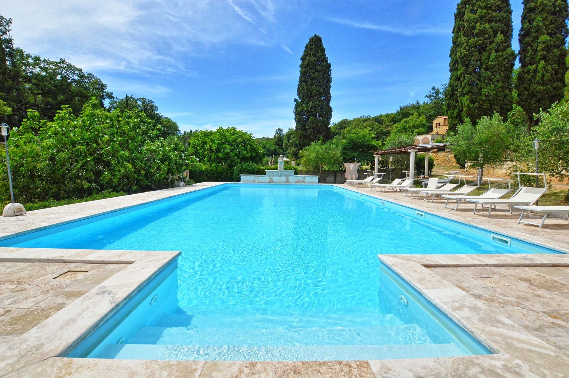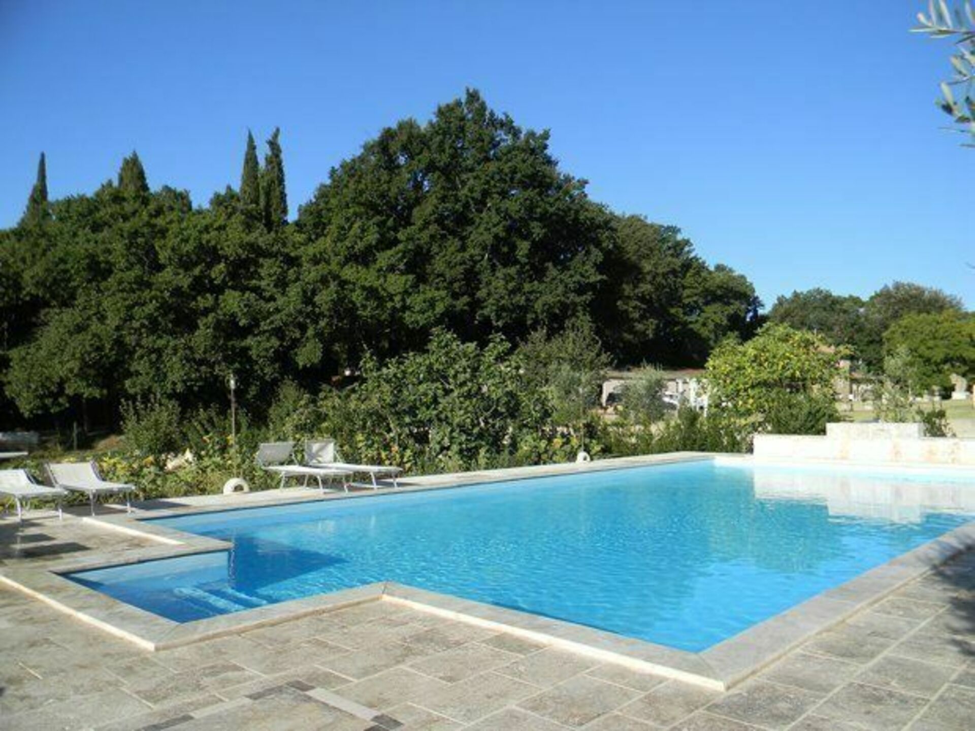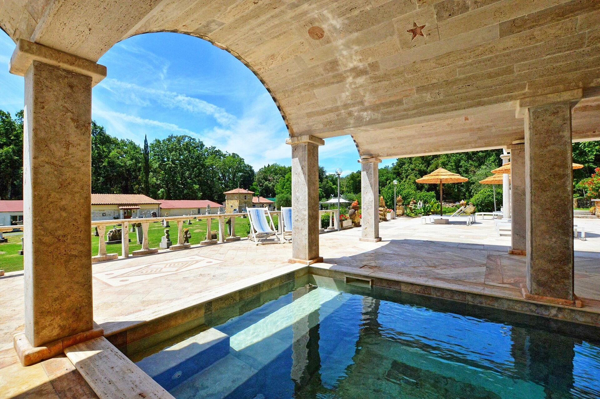 - uppvärmd pool (vattnet är 36° vid ankomst) med travertinvalv (9 x 3 meter – djup 1,4 meter – öppen året runt)