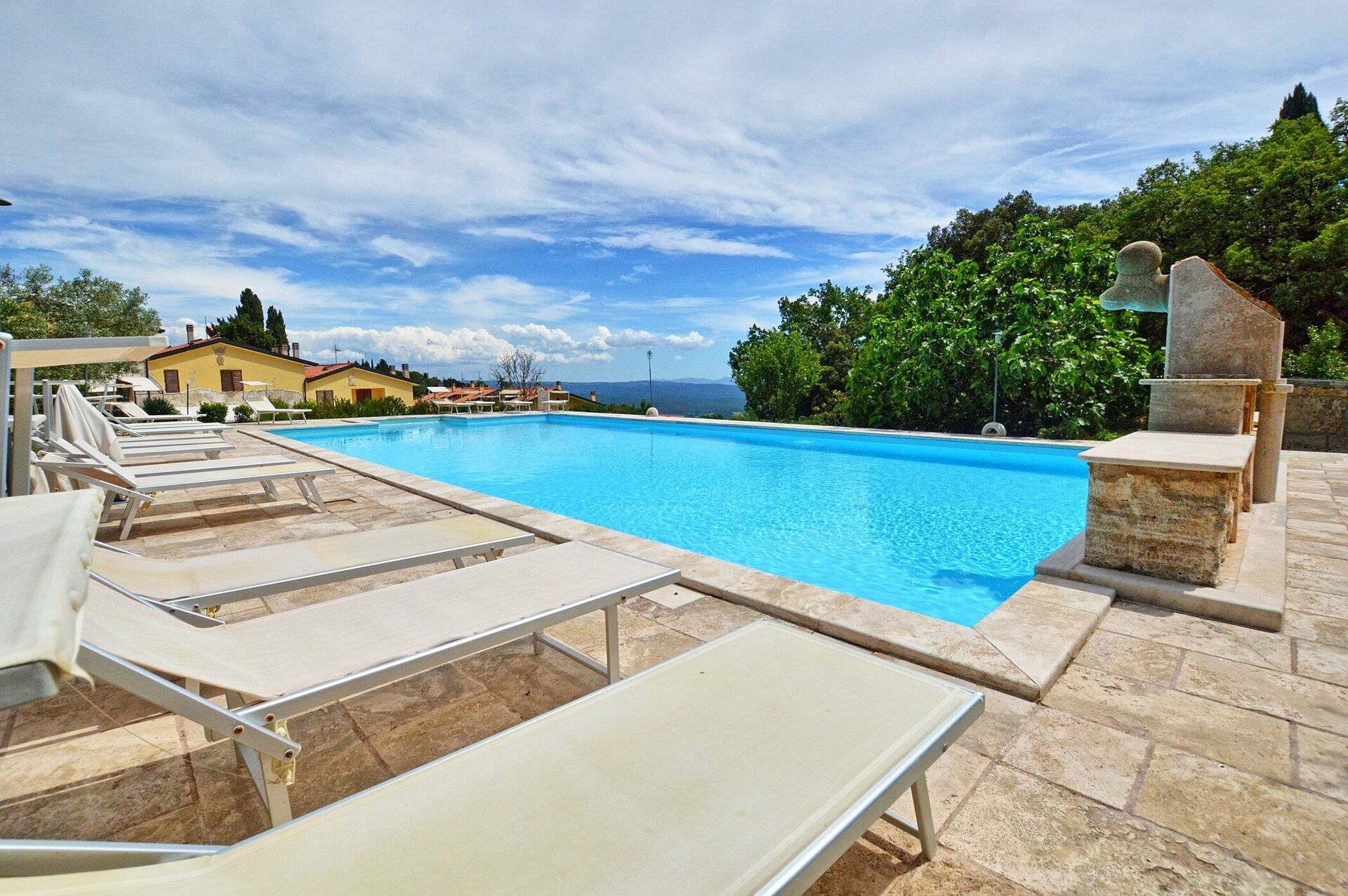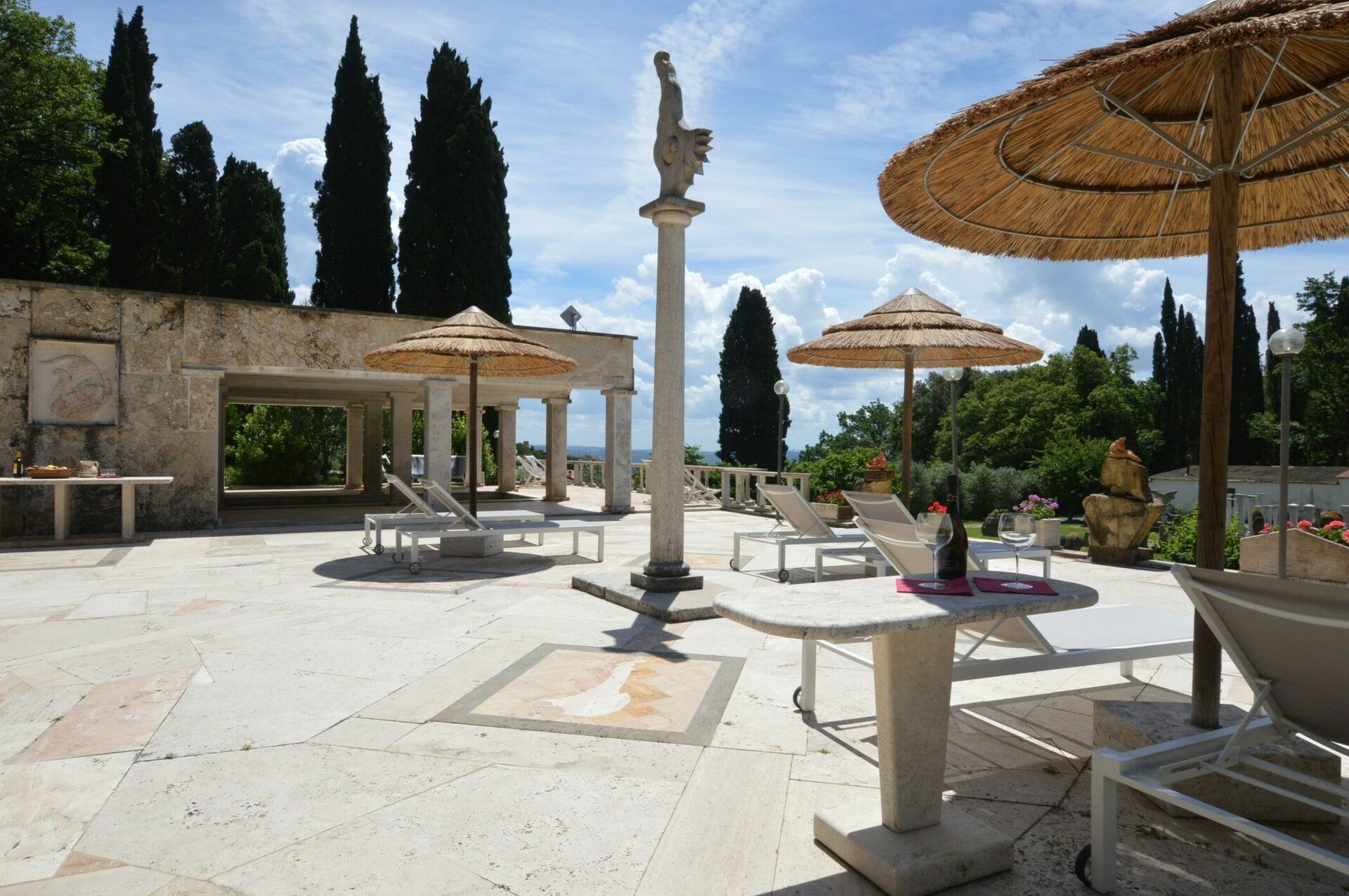 - stor solterrass i travertin med solsängar, parasoller och dusch (varmvatten)