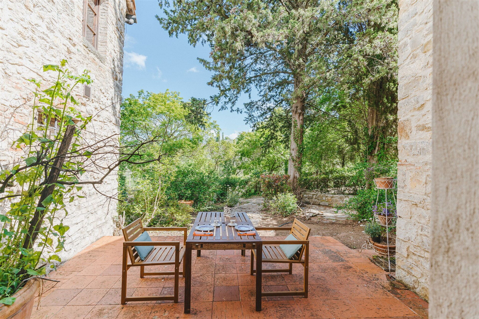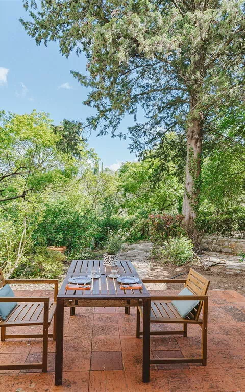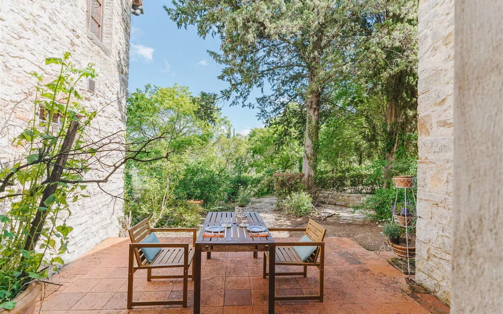 Privat utomhusområde möblerat med bord, stolar och grill.