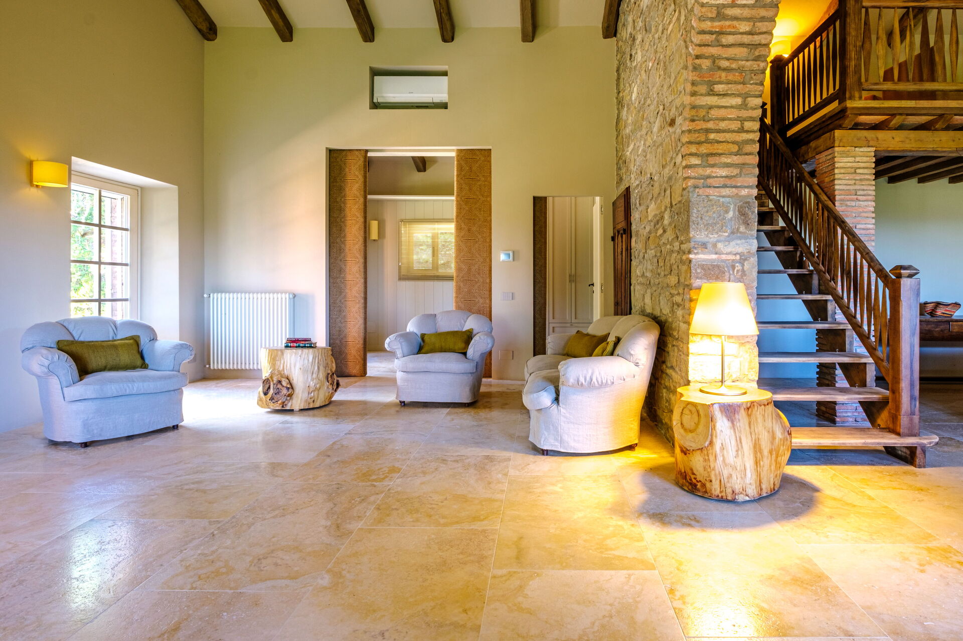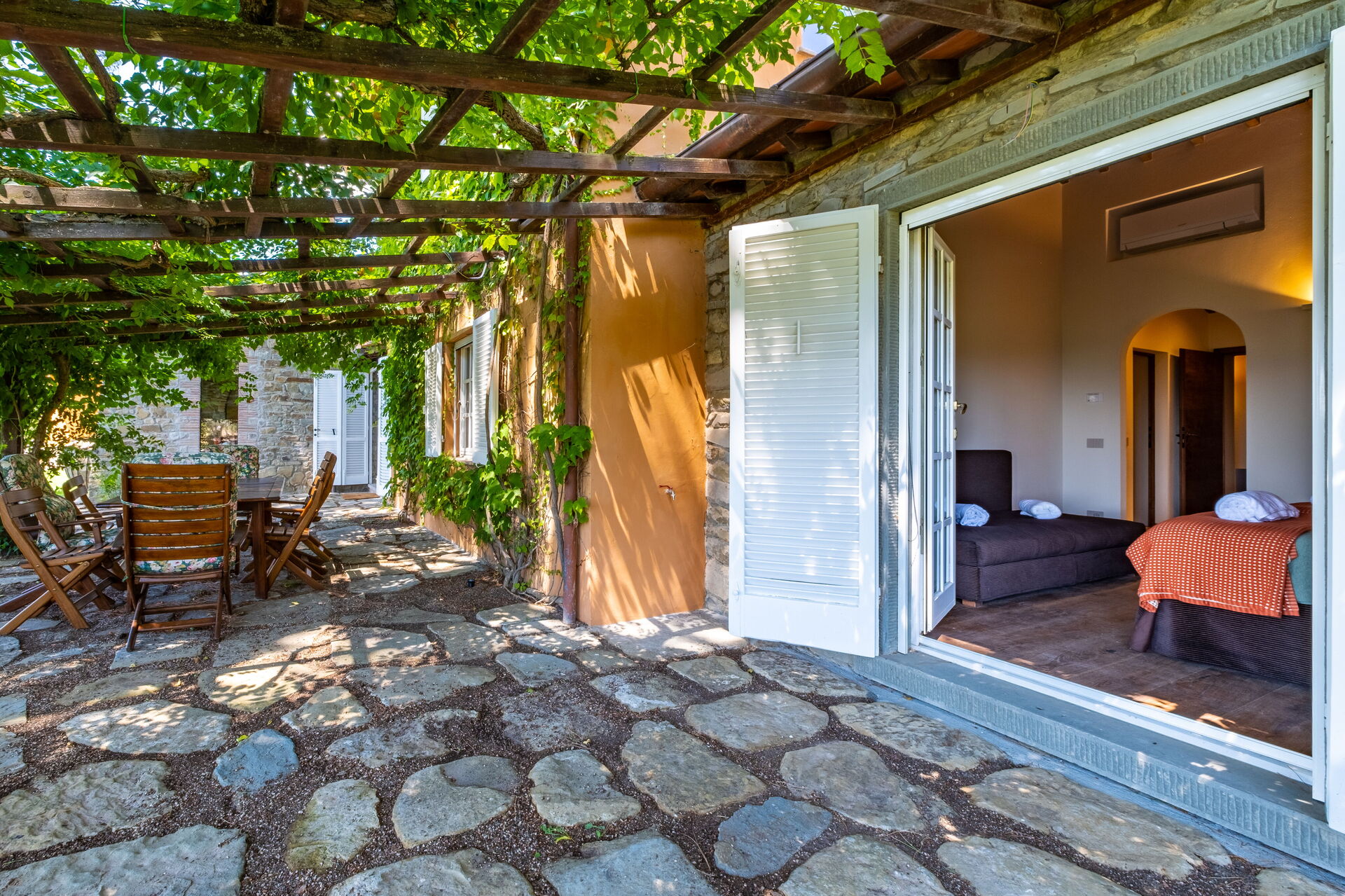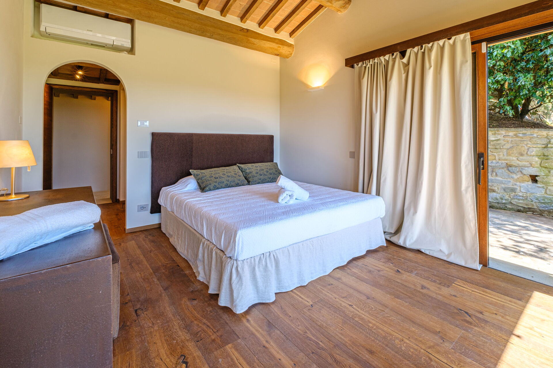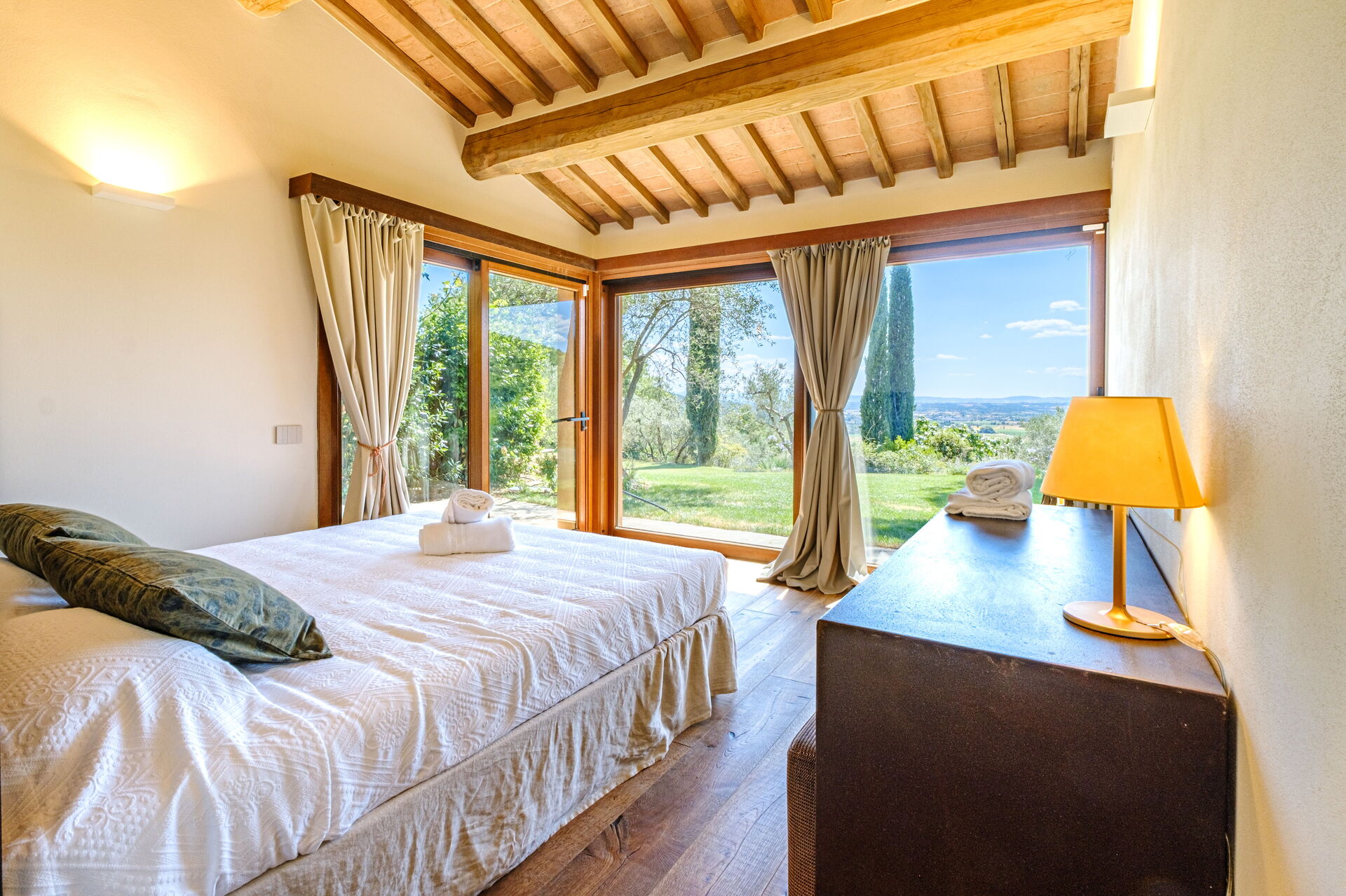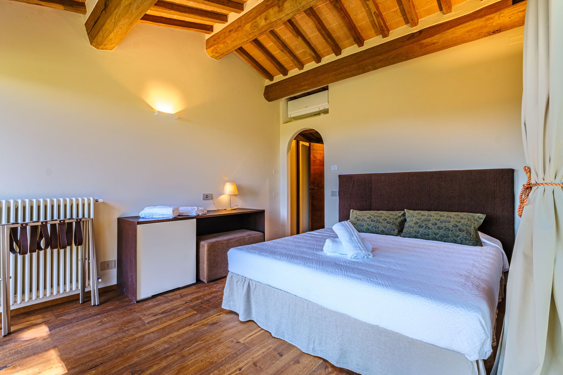 Denna exklusiva fastighet är inredd med smak och elegans; den är bekväm och utrustad med moderna bekvämligheter samtidigt som den respekterar de ursprungliga arkitektoniska dragen hos toskanska lantshus (synlige bjälkar, användning av trä och lokal sten). Villa Roseto är i ett plan, har 5 sovrum och kan bekvämt rymma 10 personer; rymliga gemensamma utrymmen gör att du kan tillbringa en trevlig och oförglömlig vistelse nära Cortona i sällskap med vänner och familj.