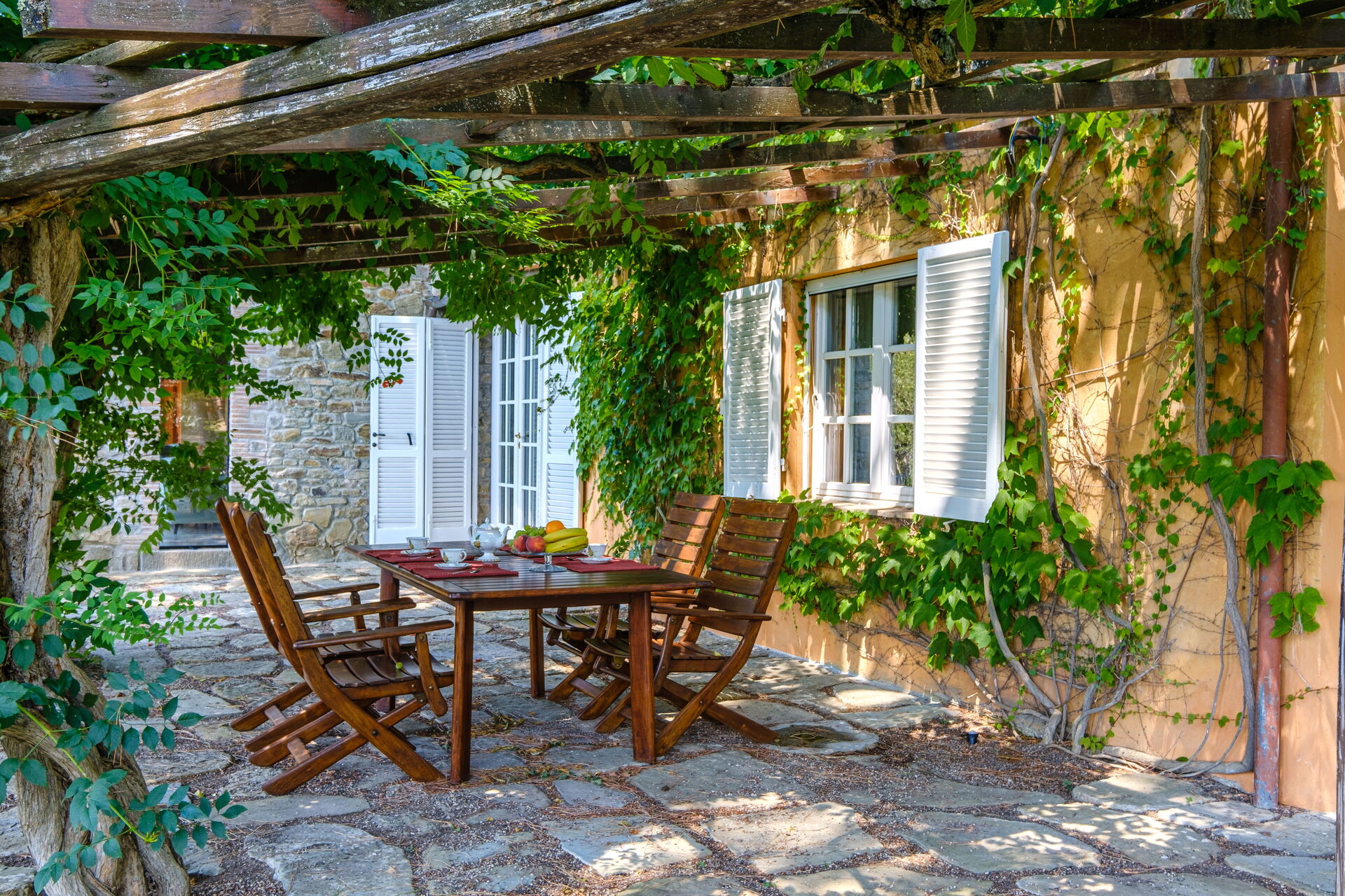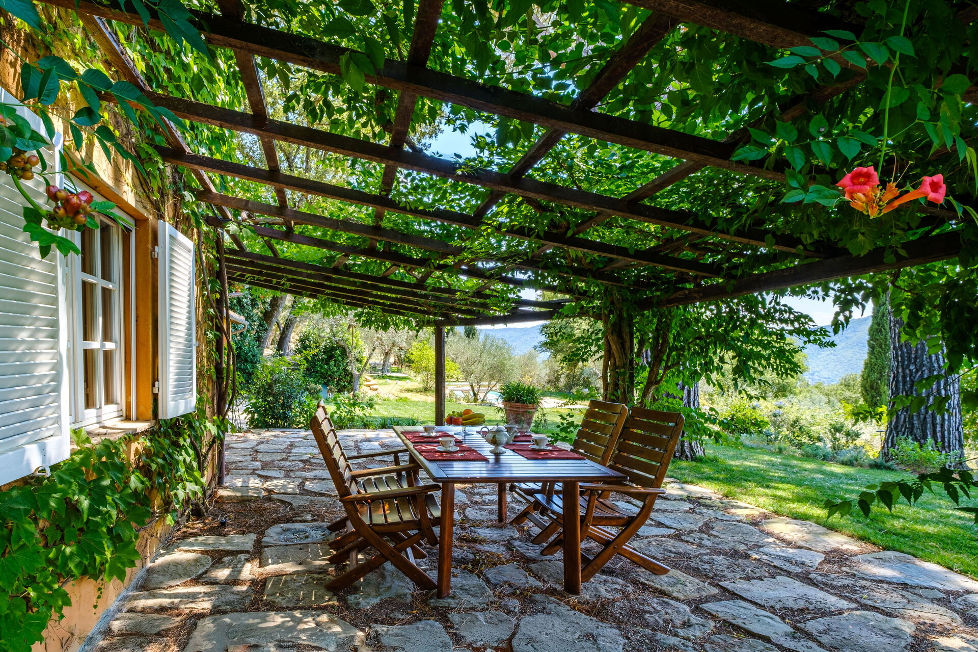 - Veranda med träpergola utrustad för utomhusmåltider