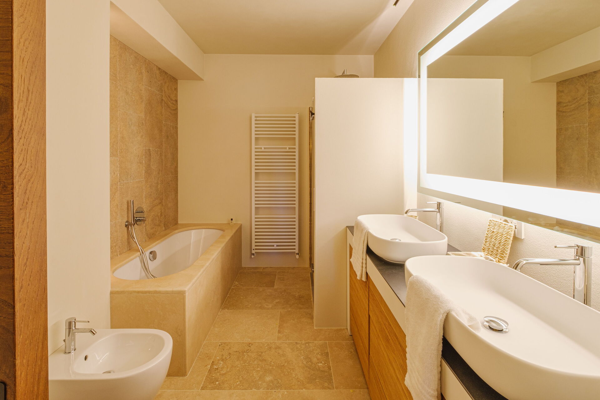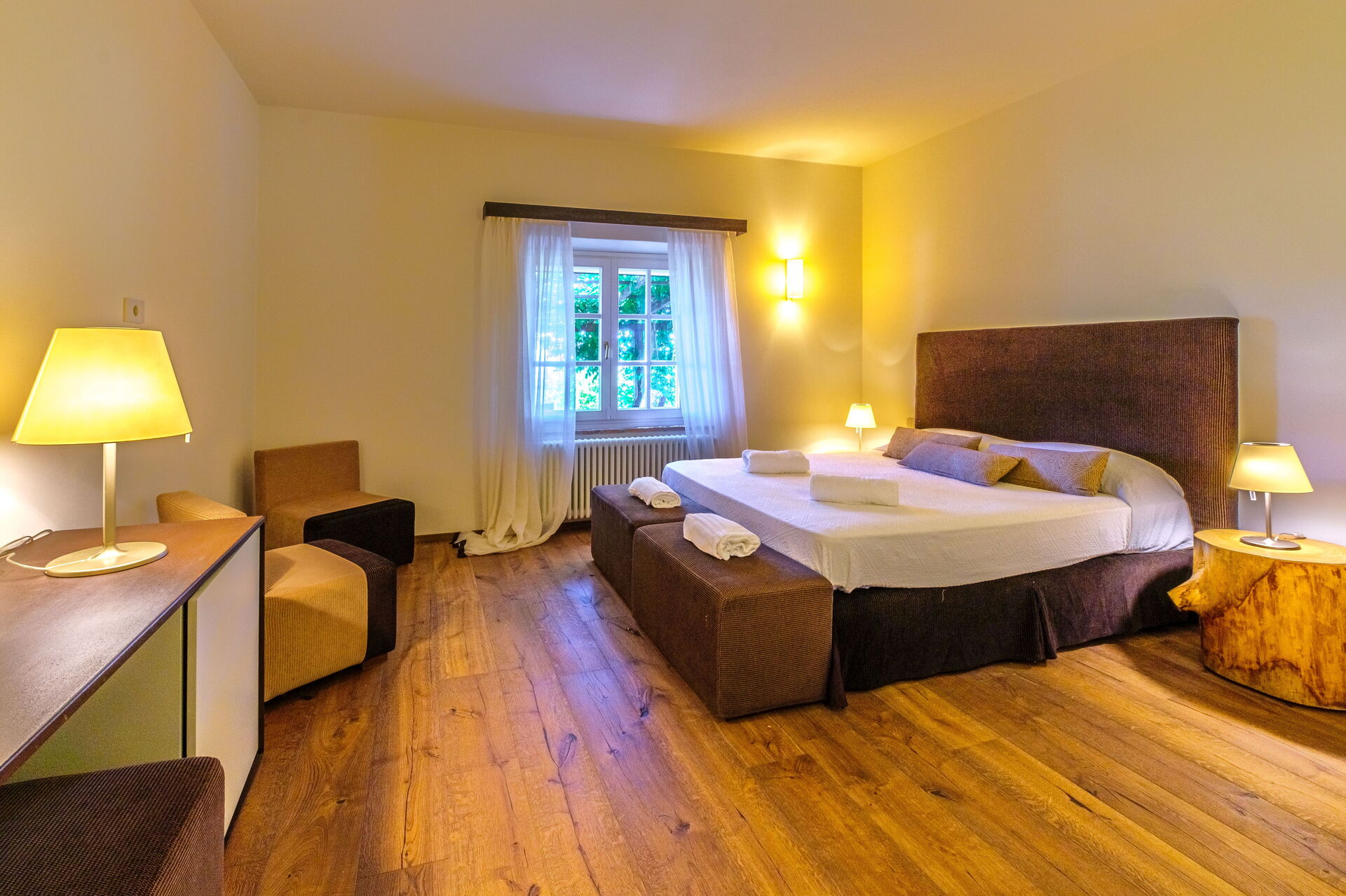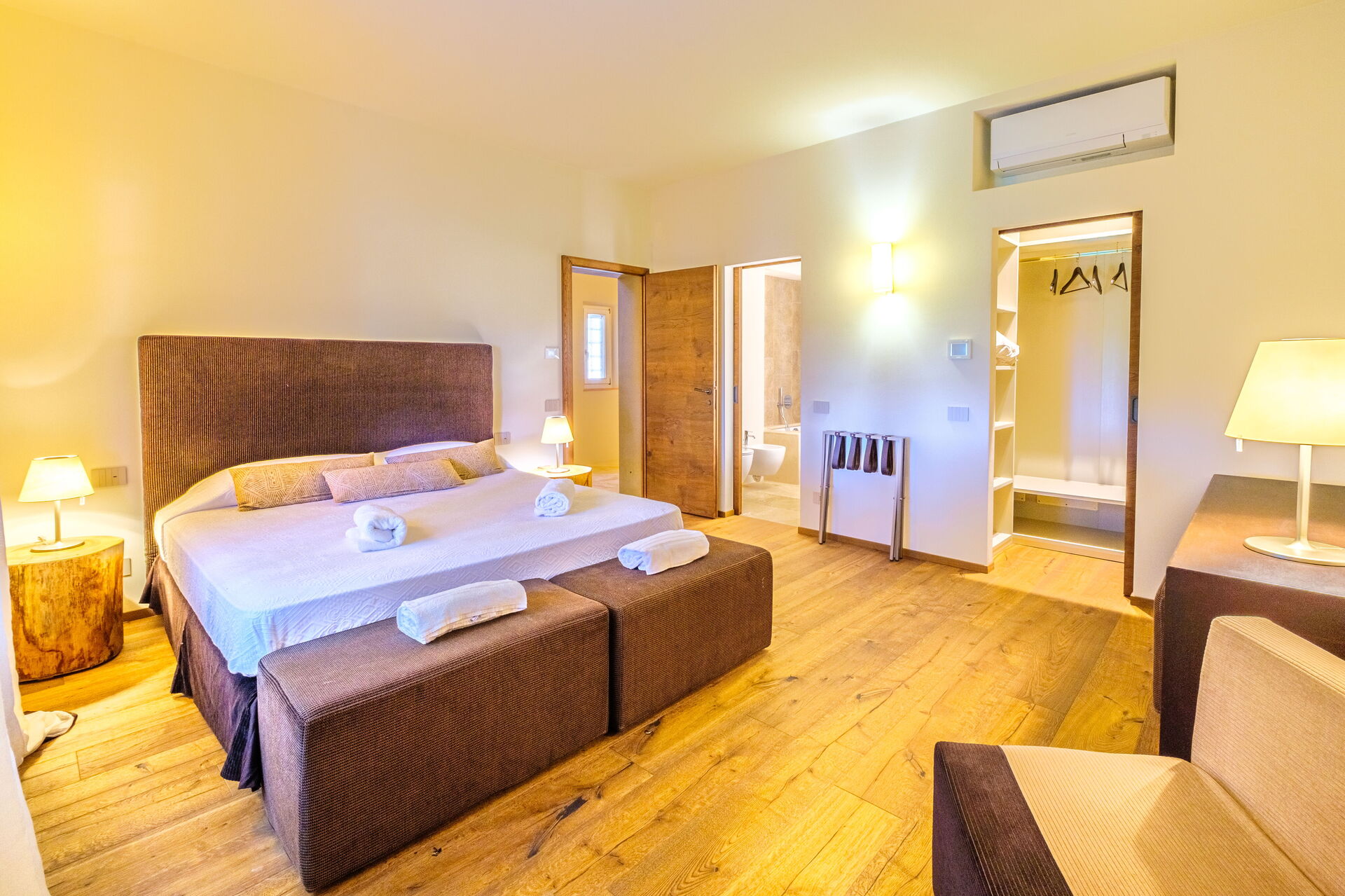 Bottenvåning: stort vardagsrum med öppen spis (smart-TV), ljus matsal och kök (induktionshäll, ugn, kylskåp, frys, diskmaskin, vinkyl, brödrost, espressomaskin, amerikansk kaffebryggare), tvättstuga (tvättmaskin, torktumlare och strykjärn), dubbelrum (kan på begäran göras om till 2 enkelsängar: sängmått: 90x195 cm, luftkonditionering) med privat badrum med dusch; dubbelrum (king size-säng: sängmått: 180x200 cm, luftkonditionering) med privat badrum med dusch, tillgång till trädgården; dubbelrum (king size-säng: sängmått: 180x200 cm, luftkonditionering) med privat badrum med dusch, dubbelrum (king size-säng: sängmått: 180x200 cm, luftkonditionering) med walk-in-closet, privat badrum med dusch och badkar, dubbelrum (king size-säng: sängmått: 180x200 cm, luftkonditionering) med privat badrum med dusch (utan bidé, utan fönster), tillgång till trädgården.