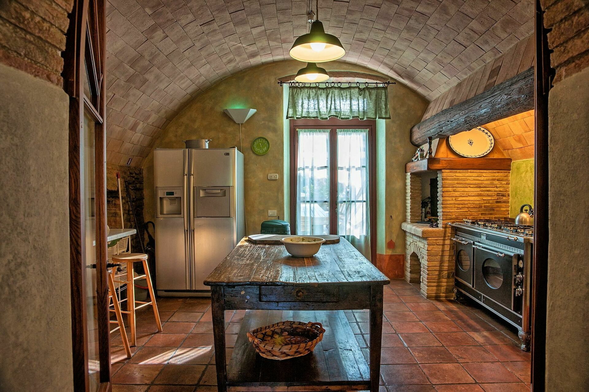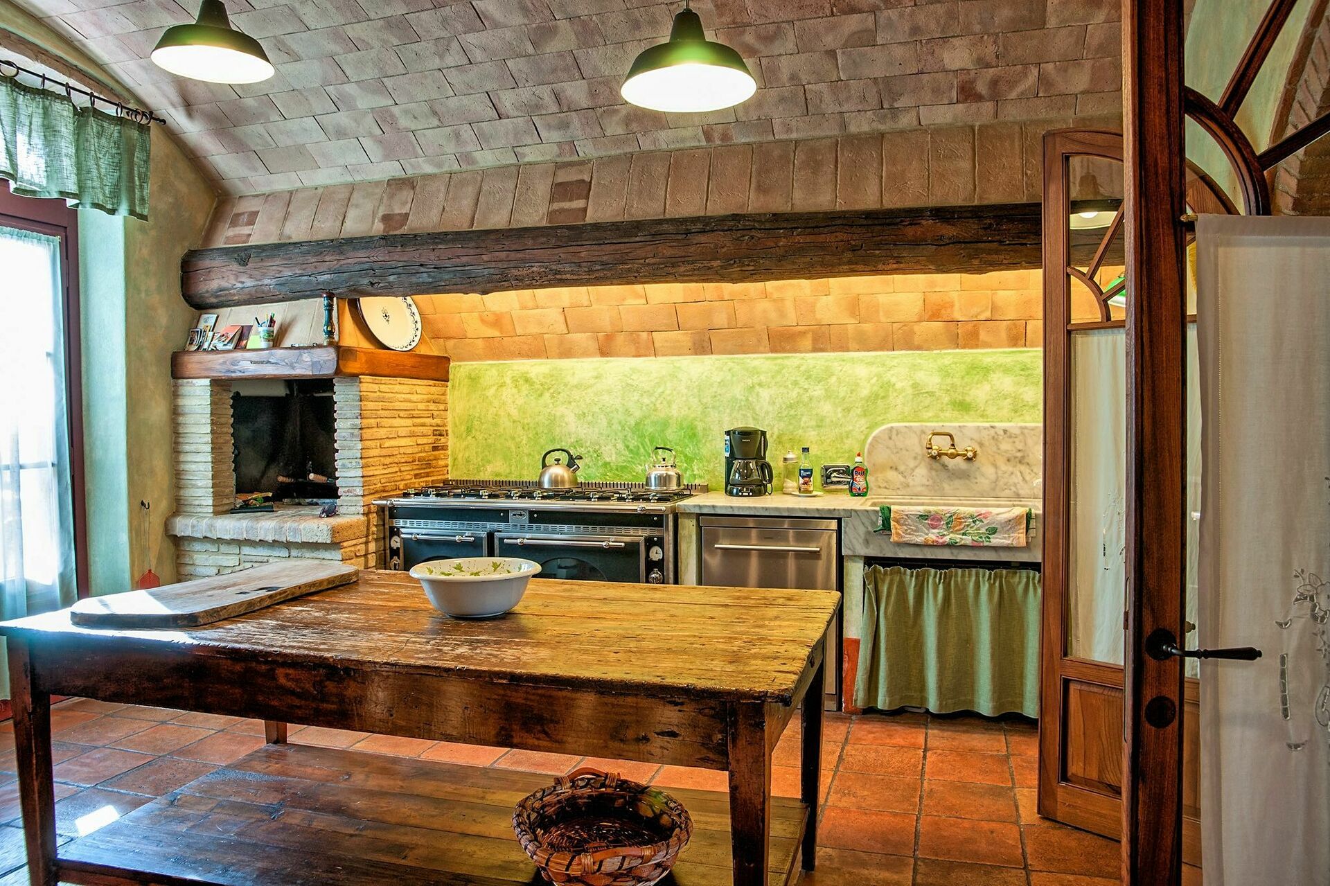 2 steg lägre: matrum med öppen spis och tillgång till utsidan, välsorterad kök (frys, 2 ugnar, diskmaskin, mikrovågsugn, ismaskin, grill), förråd.