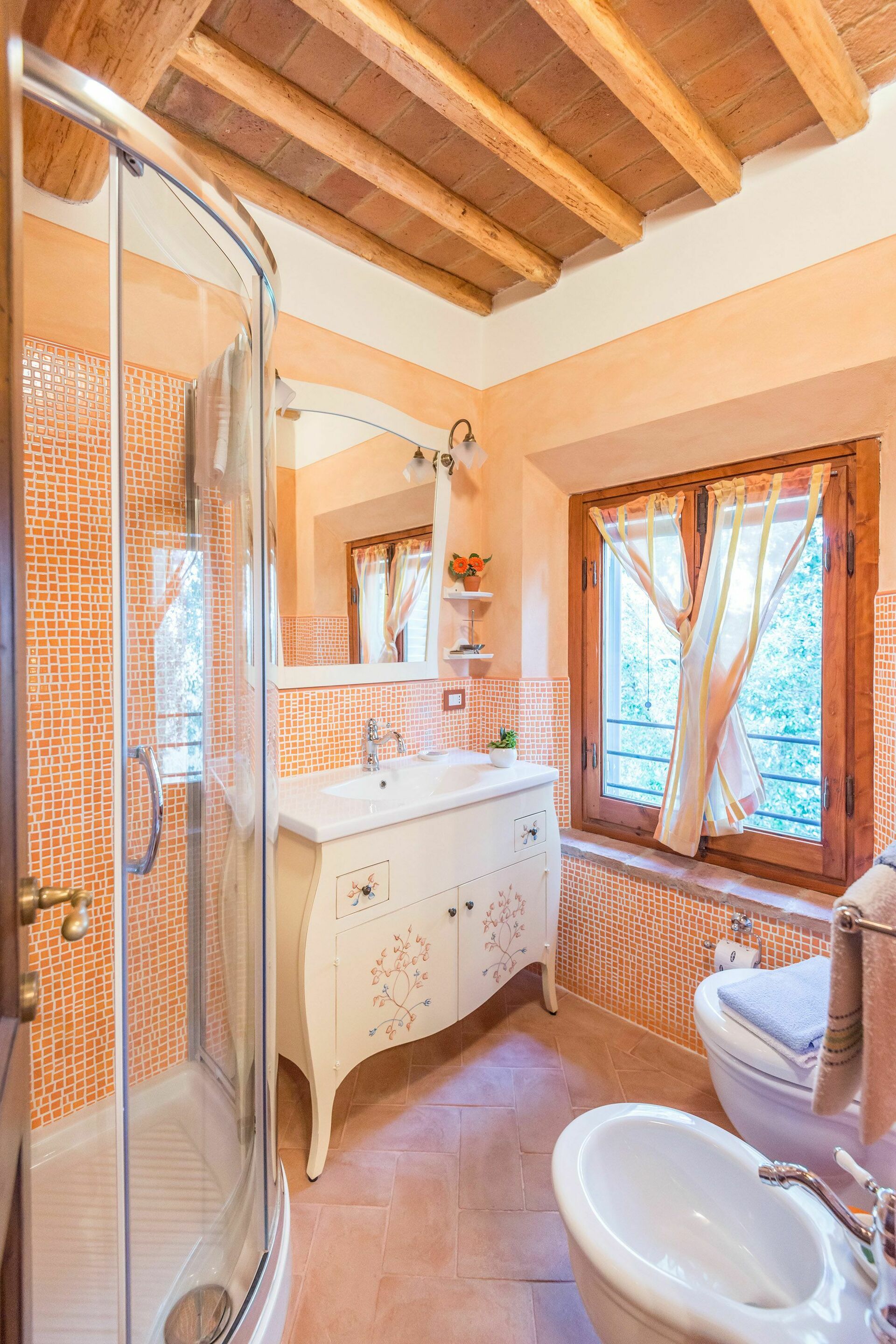1 steg upp: sovrum med 2 enkelsängar och eget badrum med dusch, dubbelrum med eget badrum och tvättmaskin.