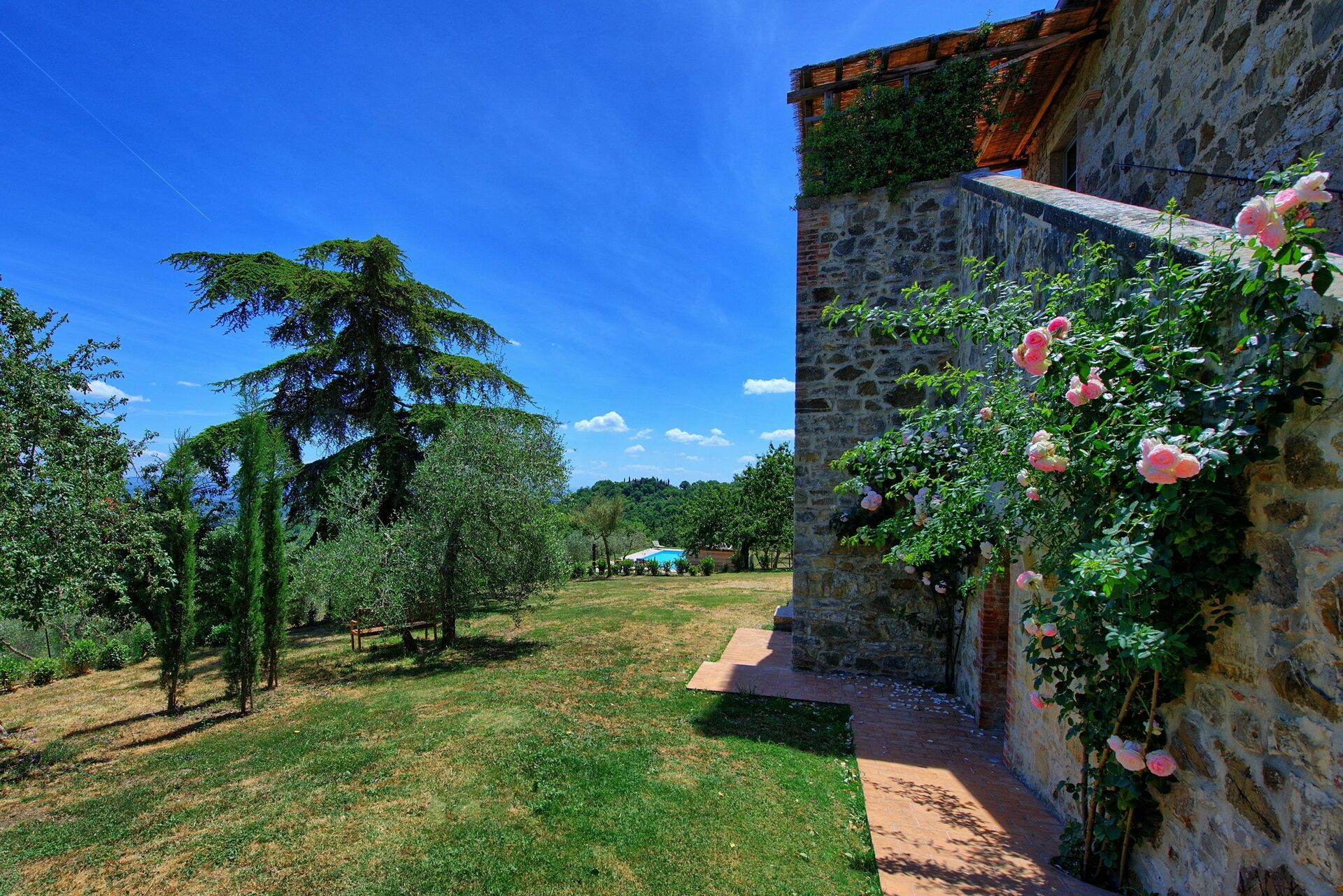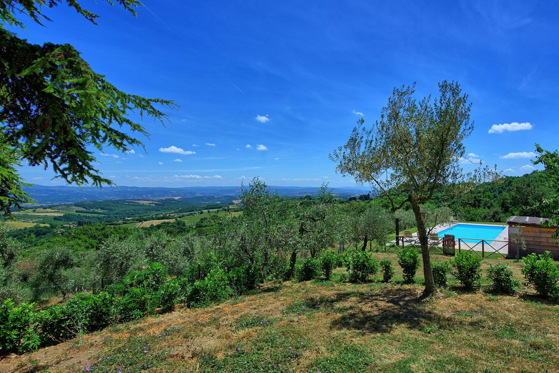 Casa Olivia är en del av en vackert restaurerad bondgård (för att garantera integritet för gästerna är den andra halvan av byggnaden för närvarande tom och används som lagringsutrymme) och är utrustad med en trädgård och en stor pool med panoramautsikt som delas med gästen i en annan enhet.
