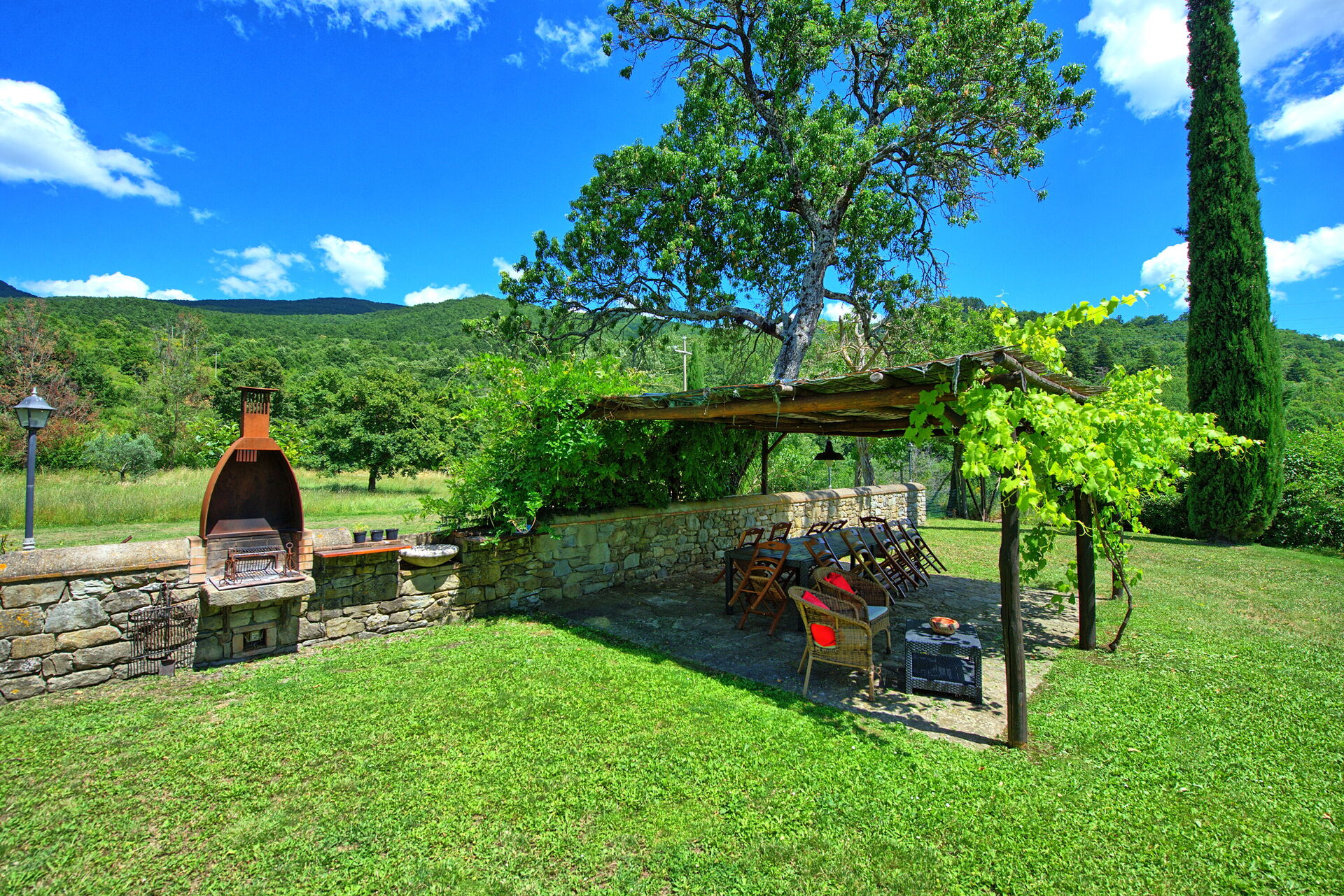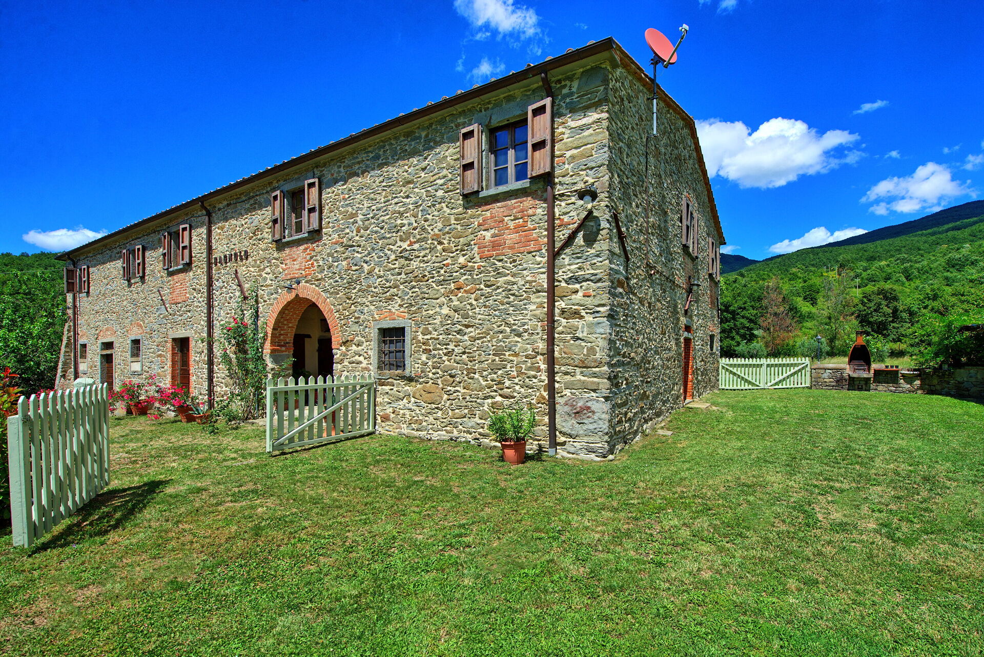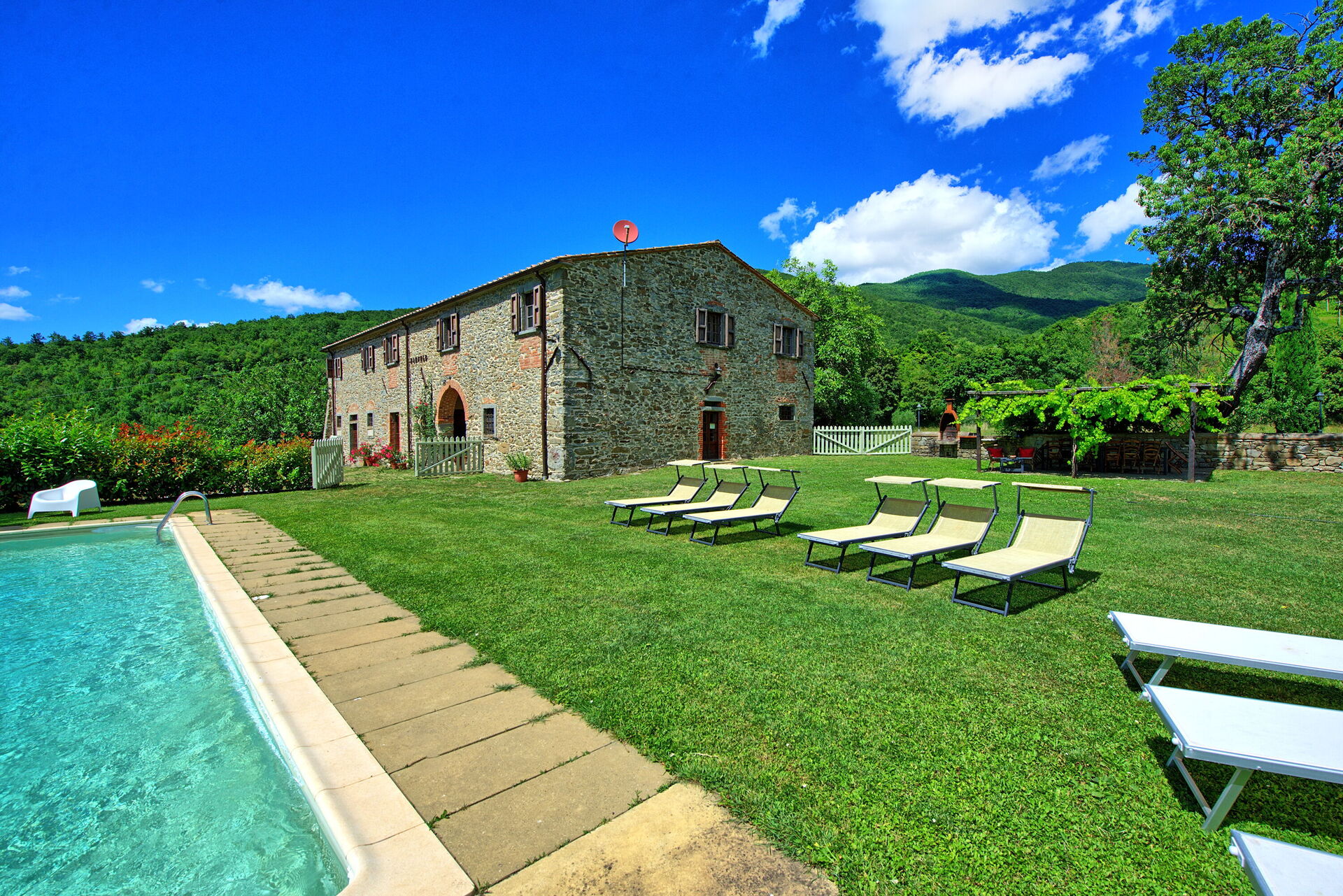 Trevligt stenhus i lugna omgivningar norr om Arezzo i Toscana. Från semesterhuset har du en underbar utsikt över över Arno-dalen och slottet Castello di Valenzano. Fastigheten är helt inhägnad och med stora utomhusområden (2000 kvadratmeter). Här hittar du en privat pool och möblerade områden för uteservering. Huset restaurerades för att bevara de ursprungliga arkitektoniska funktionerna, såsom takbjälkar och golv med terrakottaplattor. Huset är snyggt inrett och erbjuder en mysig och välkomnande inredning.