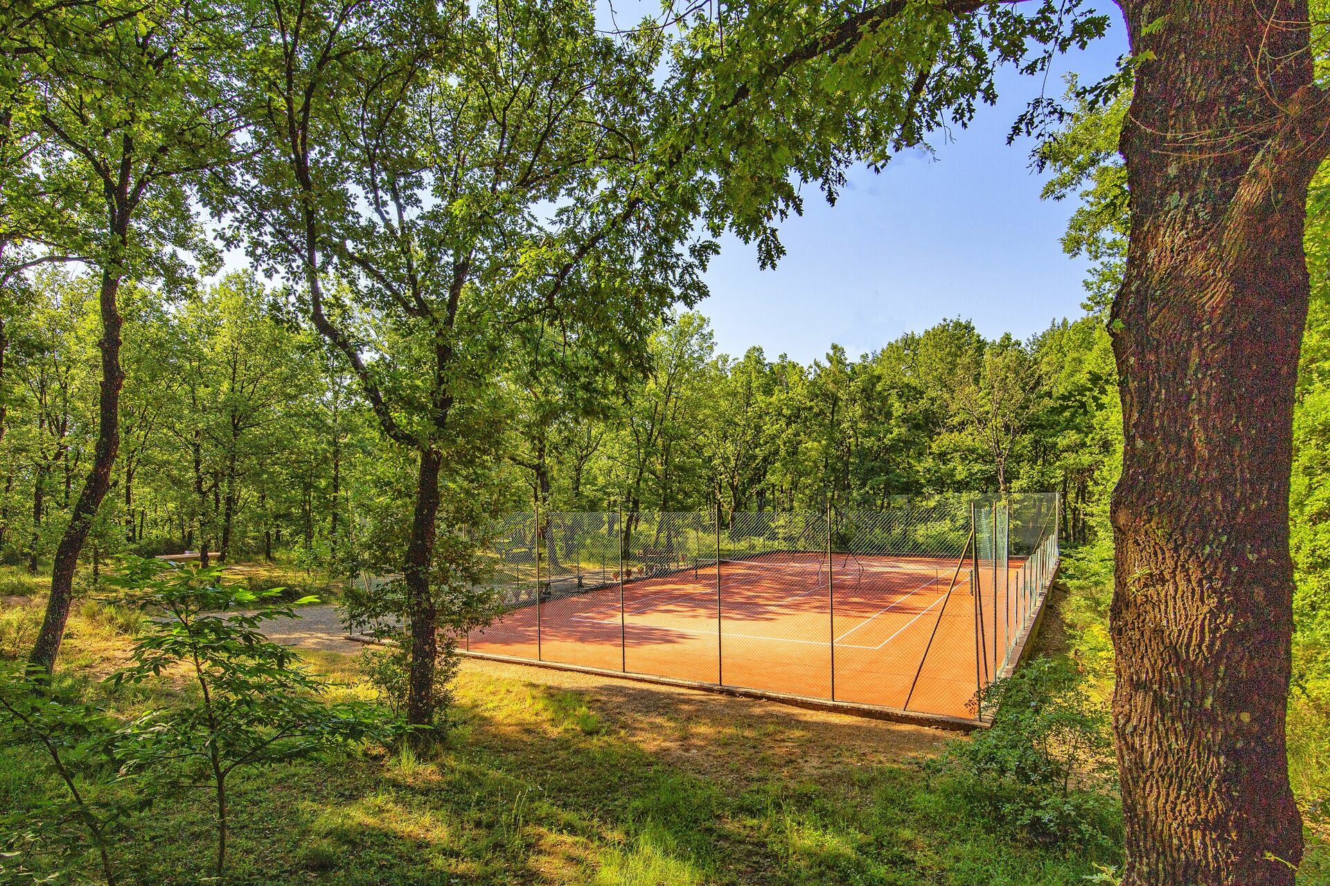Gården ligger intill en stor tät skog, och här finns en naturlig gångstig som leder gästerna till tennisbanan och sjön.