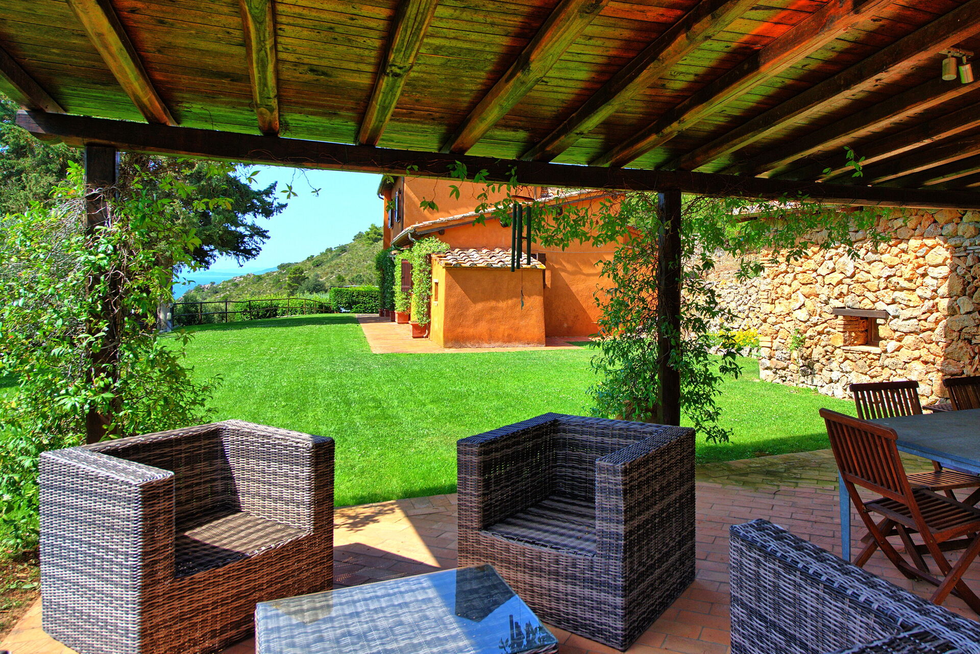 Casale Argentario har ett fantastiskt läge med panoramautsikt över havet. Trädgården har utsikt över havet och Porto Santo Stefanos gamla fästning.