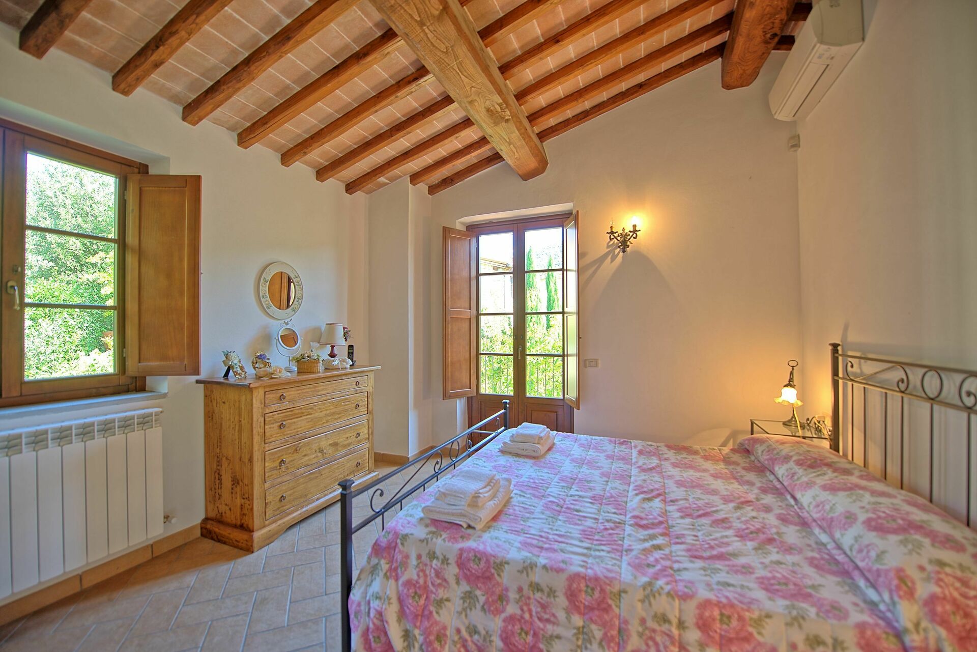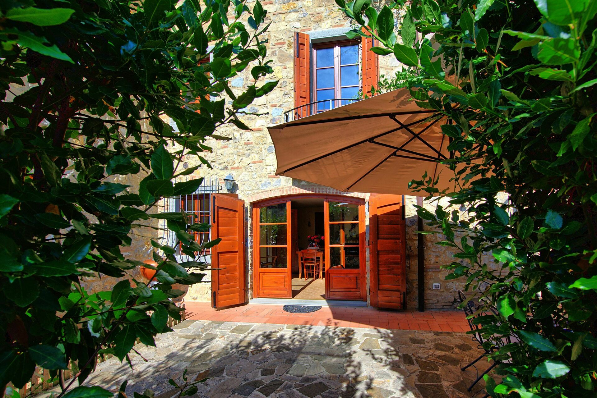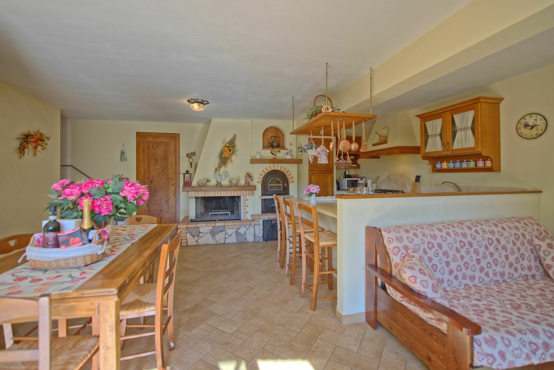 Semesterlägenheten är smakfullt inredd med material från Toscana. Utanför ett privat utrustat område för uteservering och njuta av den vackra omgivande landsbygden. En vacker pool ligger några meter bort och delas med gästerna i de andra enheterna på fastigheten. På framsidan av huset finns en rymlig asfalterad terrass, möblerad med ett bord, sex fällbara stolar, ett stort parasoll och en grill. Terrassen är omgiven av ett inhägnat staket och höga växter som ger lite avskildhet. Bredvid huset på bottenvåningen finns en möblerad loggia med utsikt över en välskött inhägnad trädgård.