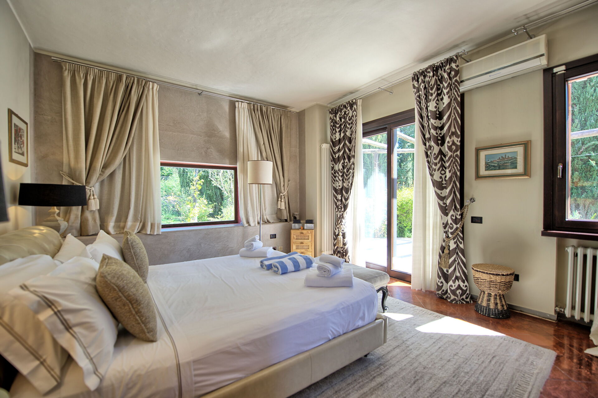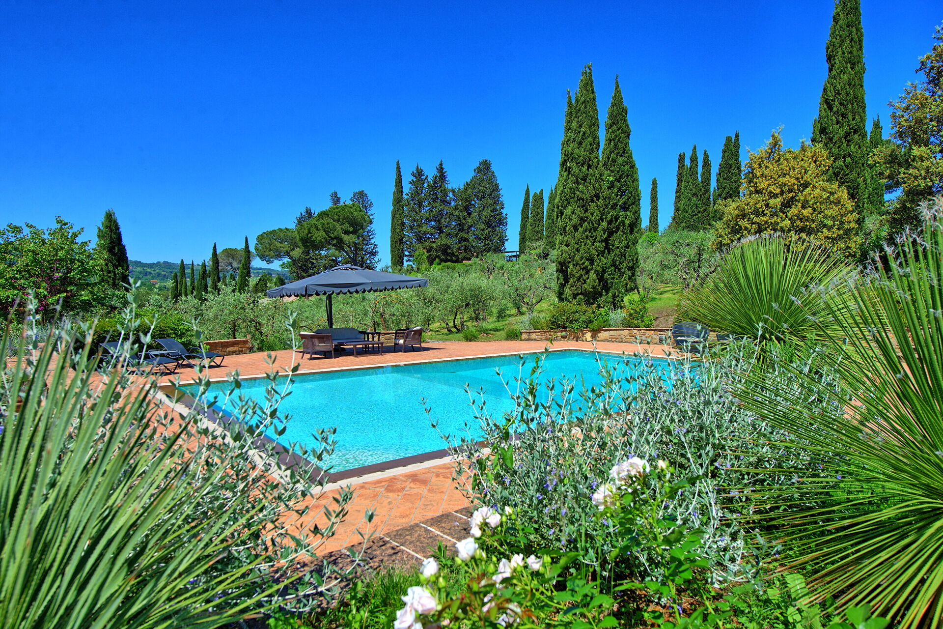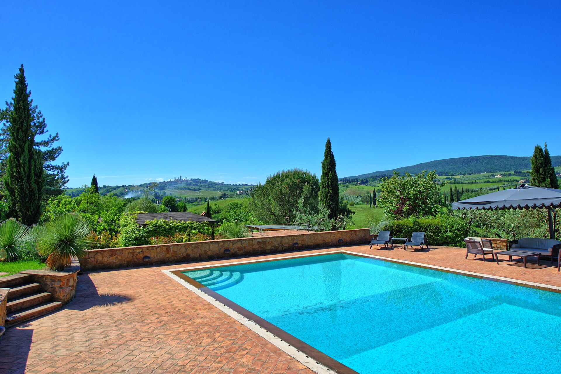 Du kan komma åt detta utomhusområde genom stora franska fönster, så att du kan njuta av den friska luften och den vackra utsikten. Poolen med pooldäck ligger på en stor gräsmatta med utsikt över Toscanas kullar och de medeltida tornen i den historiska staden San Gimignano.