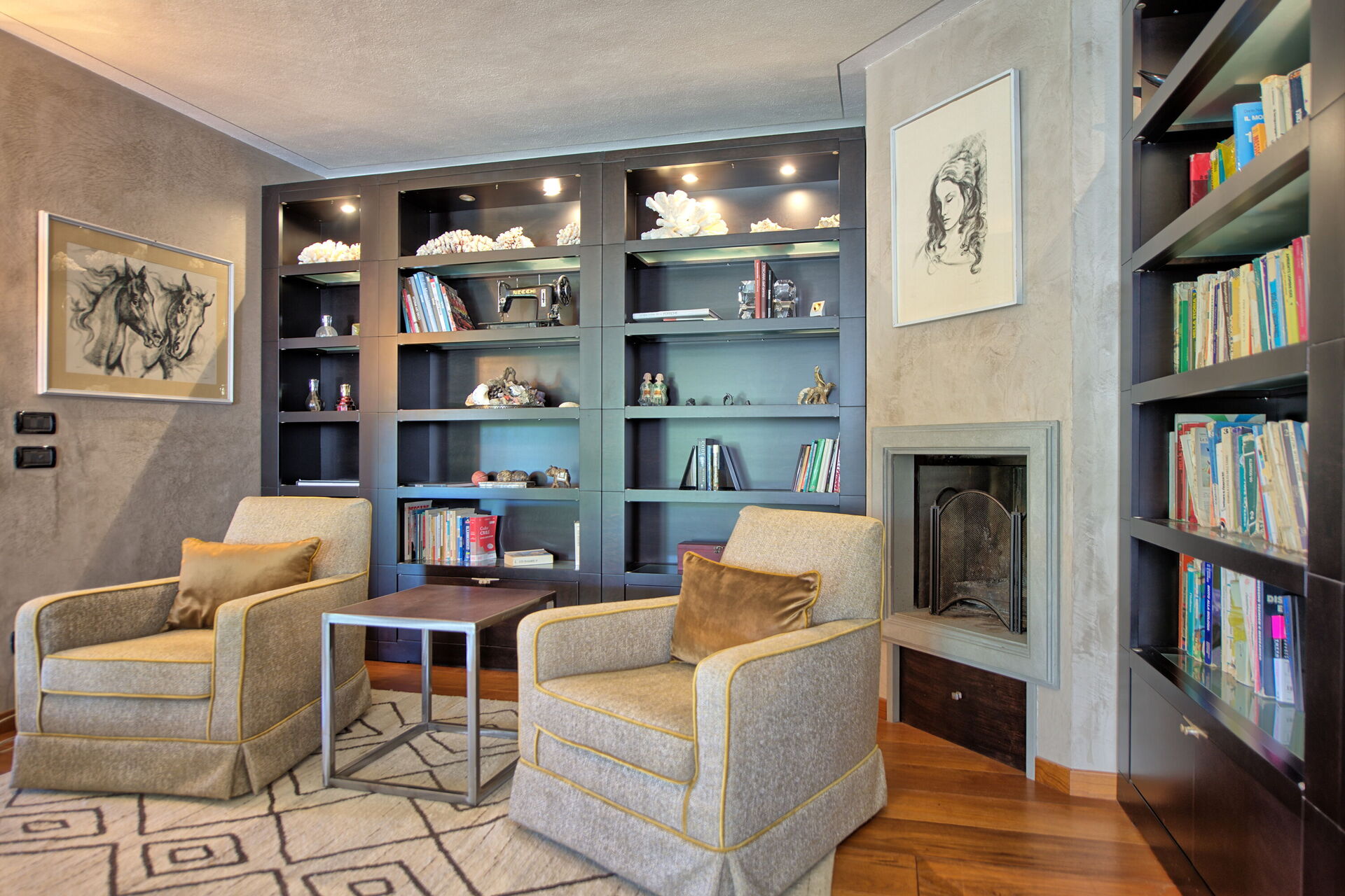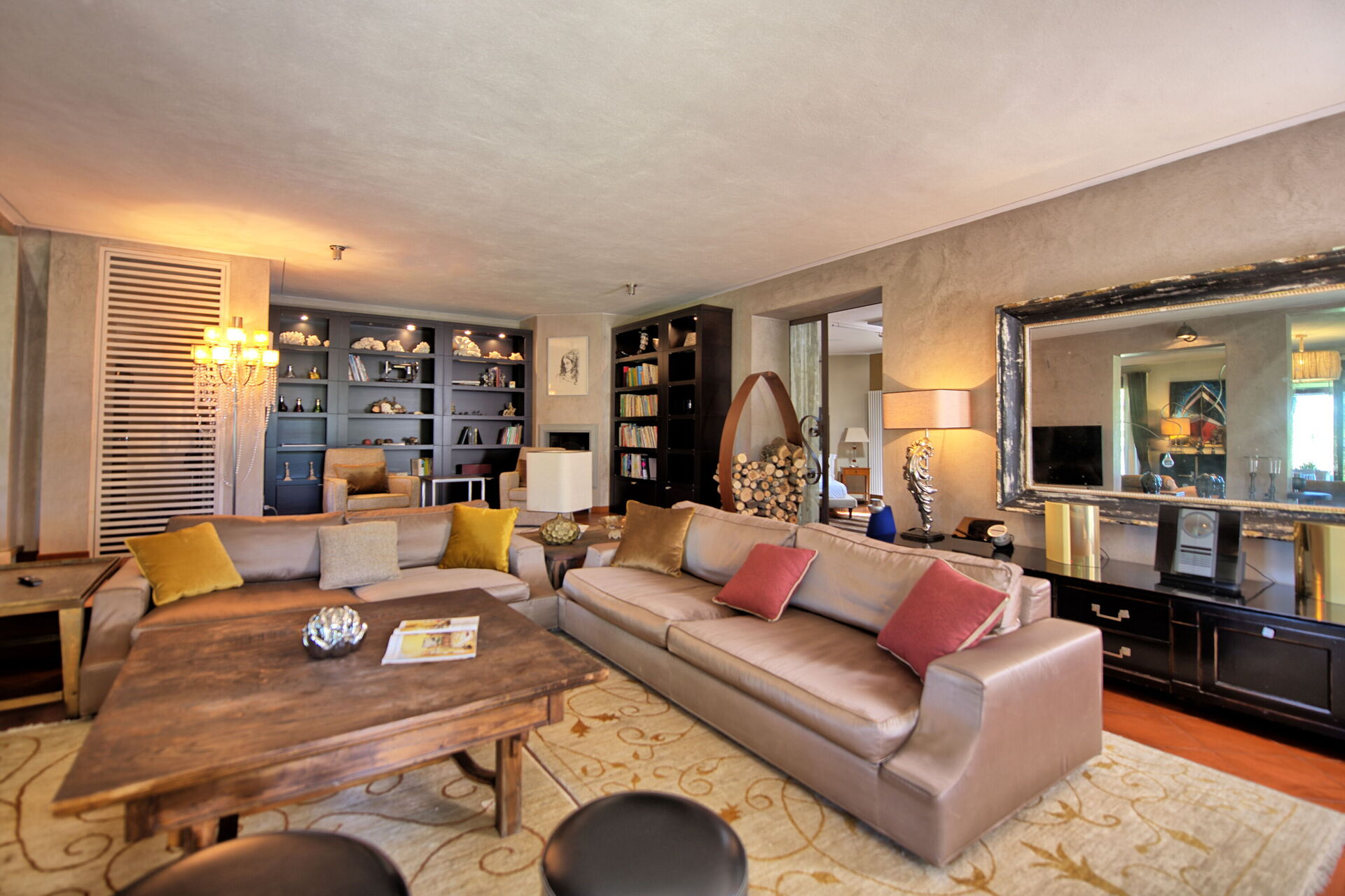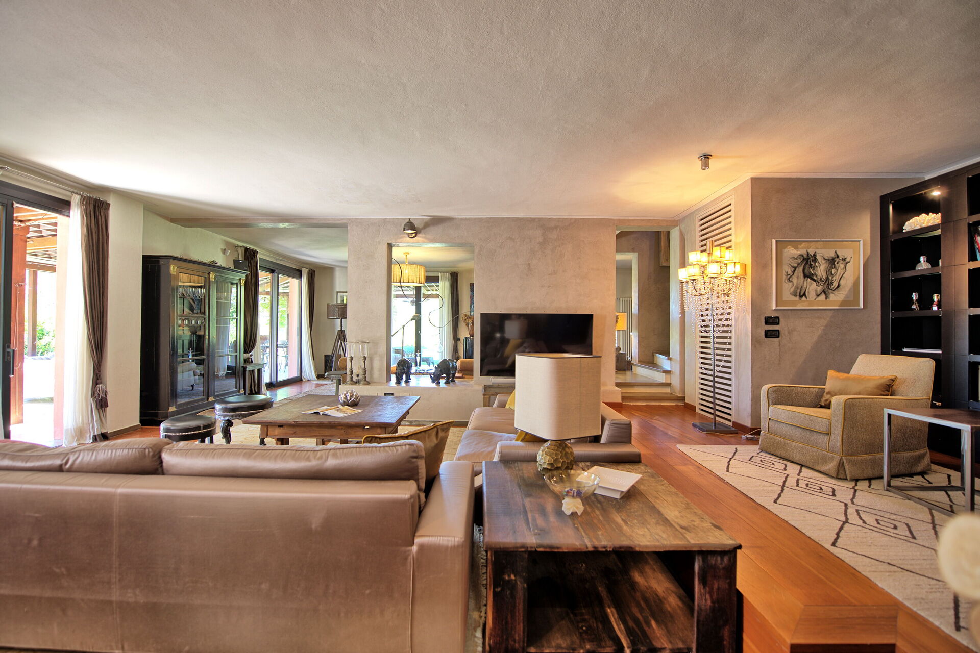 Du kan komma åt detta utomhusområde genom stora franska fönster, så att du kan njuta av den friska luften och den vackra utsikten. Poolen med pooldäck ligger på en stor gräsmatta med utsikt över Toscanas kullar och de medeltida tornen i den historiska staden San Gimignano.