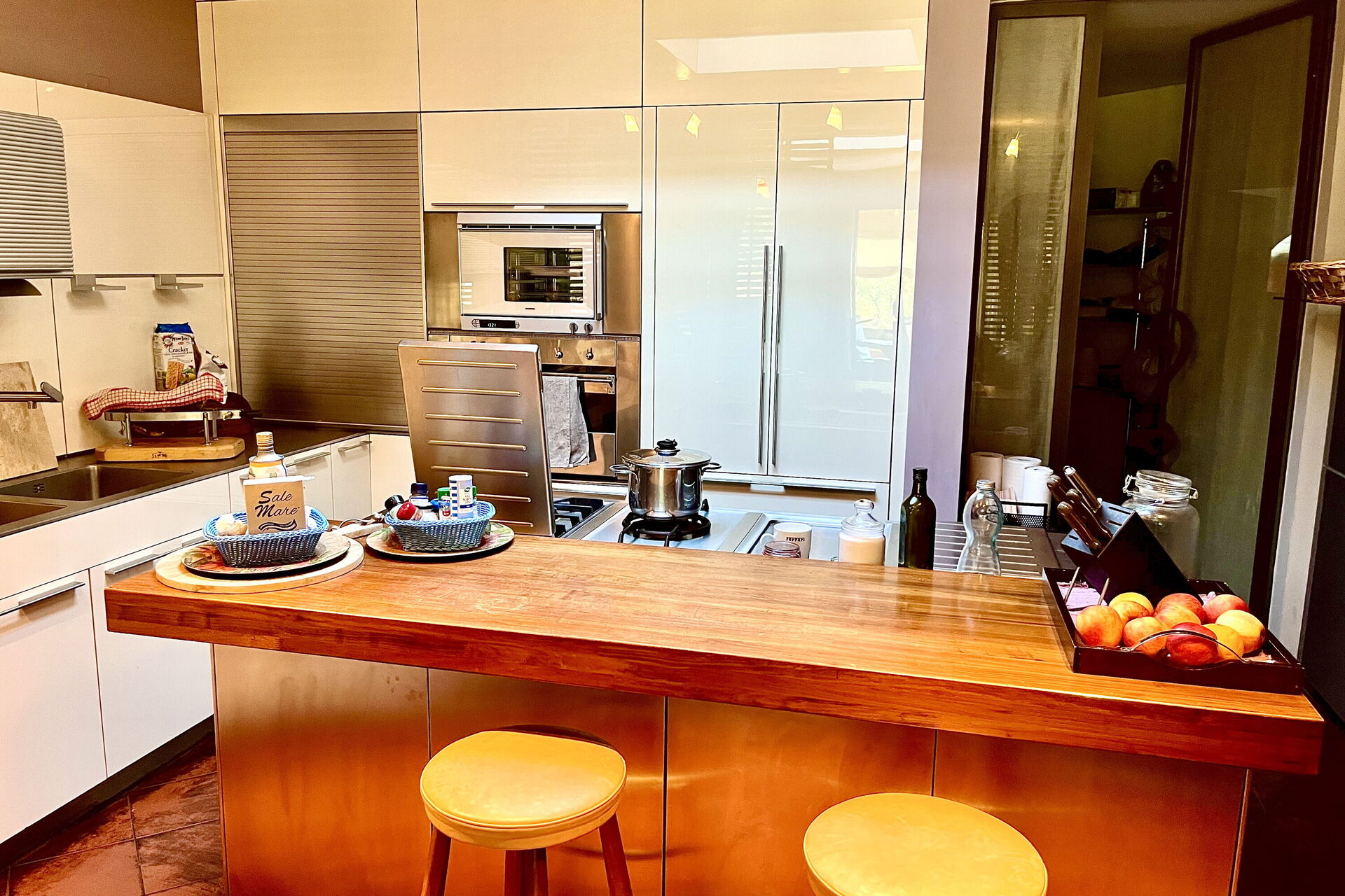 Stort vardagsrum (Smart-TV) med tillgång till den luftkonditionerade matsalen med panoramautsikt, piano och panoramafönster mot utsidan, välutrustat kök, skafferi med tvättmaskin, 1 dubbelrum (luftkonditionerat) och eget badrum med dusch